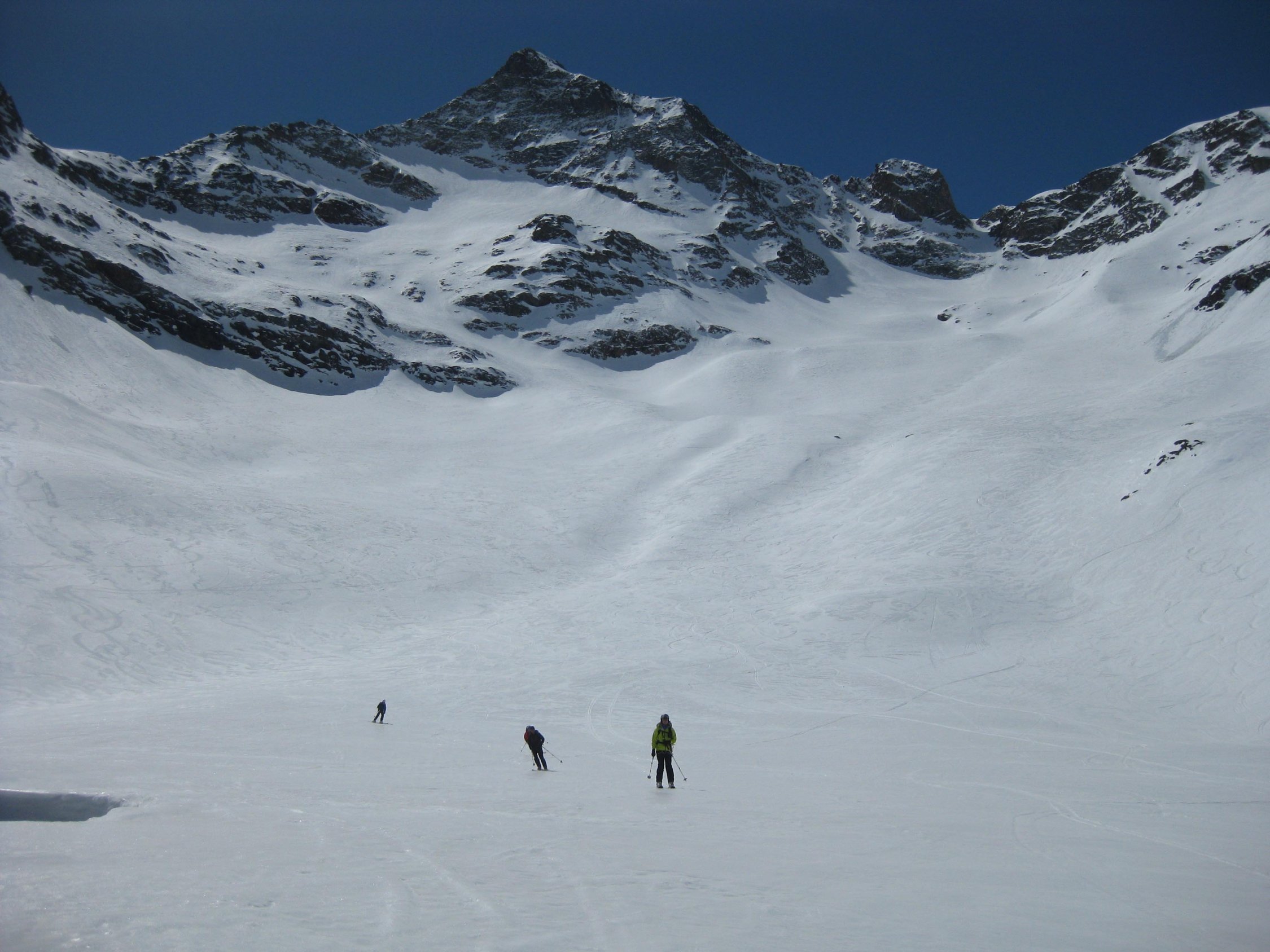 b) Entlang der Aufstiegsroute bis ca. 3000 müM. Querung nach NO auf den Rücken zwischen Fuorcla Trovat und Fuorcla d'Arlas. Weiter über den Rücken bis zur Fuorcla Trovat. Ab hier folgt eine 1'000 HM lange Abfahrt durch das Val d'Arlas (im ersten oberen Teil ordentlich steil (35 Grad), sichere Verhältnisse und angemessene Tageszeit beachten.