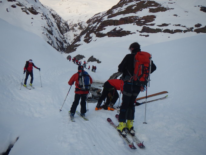Gute Verhältnisse. Schlucht unterhalb der Hütte noch gut begehbar, wenige offene Wasserstellen werden umgangen. Tragepassage z.T. mit eisigen Tritten, Steigeisen sind notwendig hierfür. Für Ungeübte evtl. technisch nicht ganz einfach und etwas ausgesetzt. Am Tag zuvor ist ein Bergsteiger in ein Loch abgerutscht und musste mit Heli gerettet werden. Einige Lawinenabgänge in Schlucht. Generell sollte man dort nicht zu spät unterwegs sein.