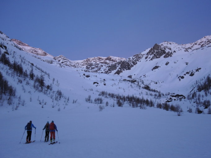 Firnschnee auf der ganzen Route, im Aufstieg mit Harscheisen gut zu gehen. Abfahrt 10 Uhr über die steile Ostflanke grossartige Sulzschnee-Bedingungen bis zu Ausgangspunkt.