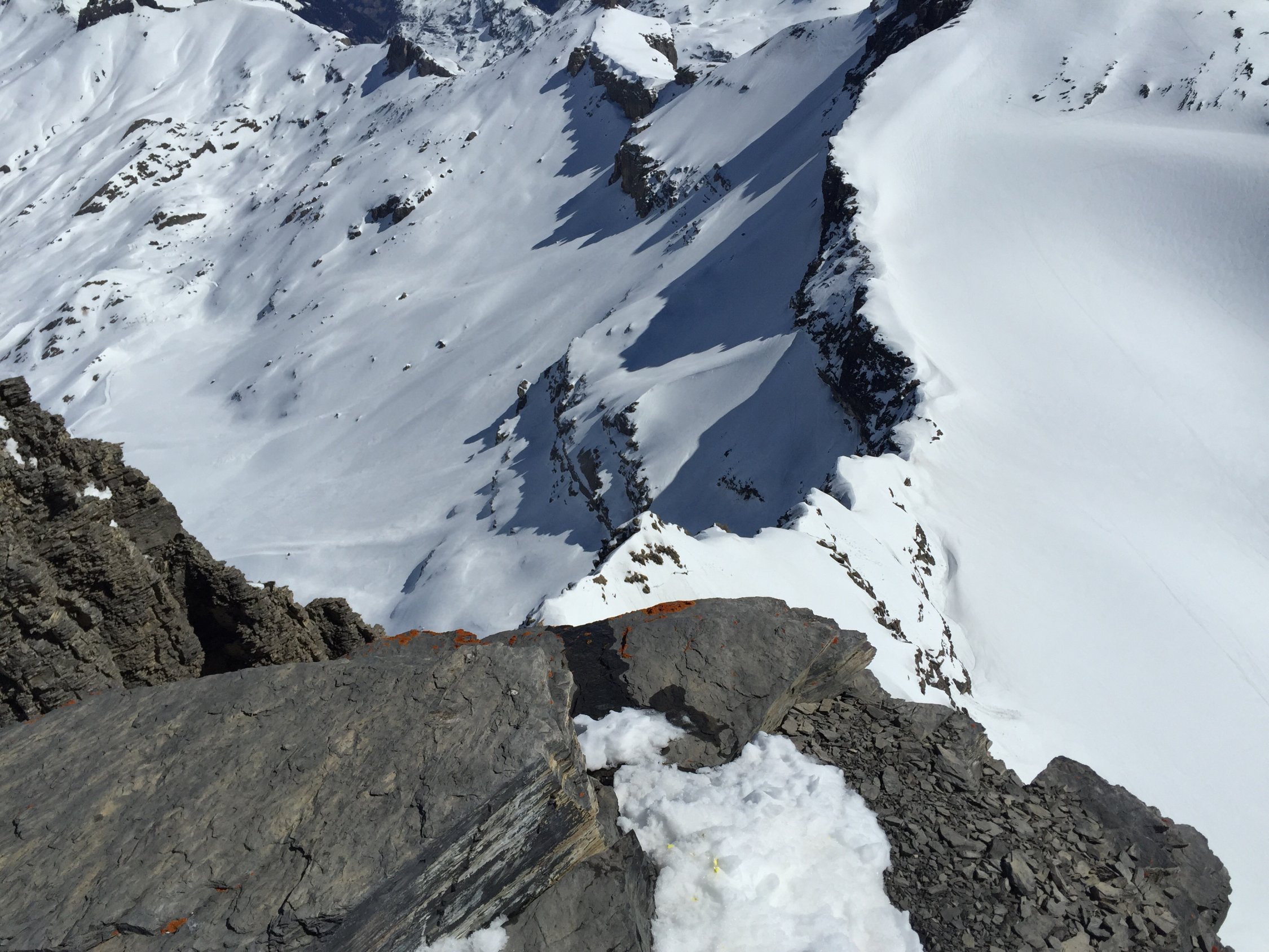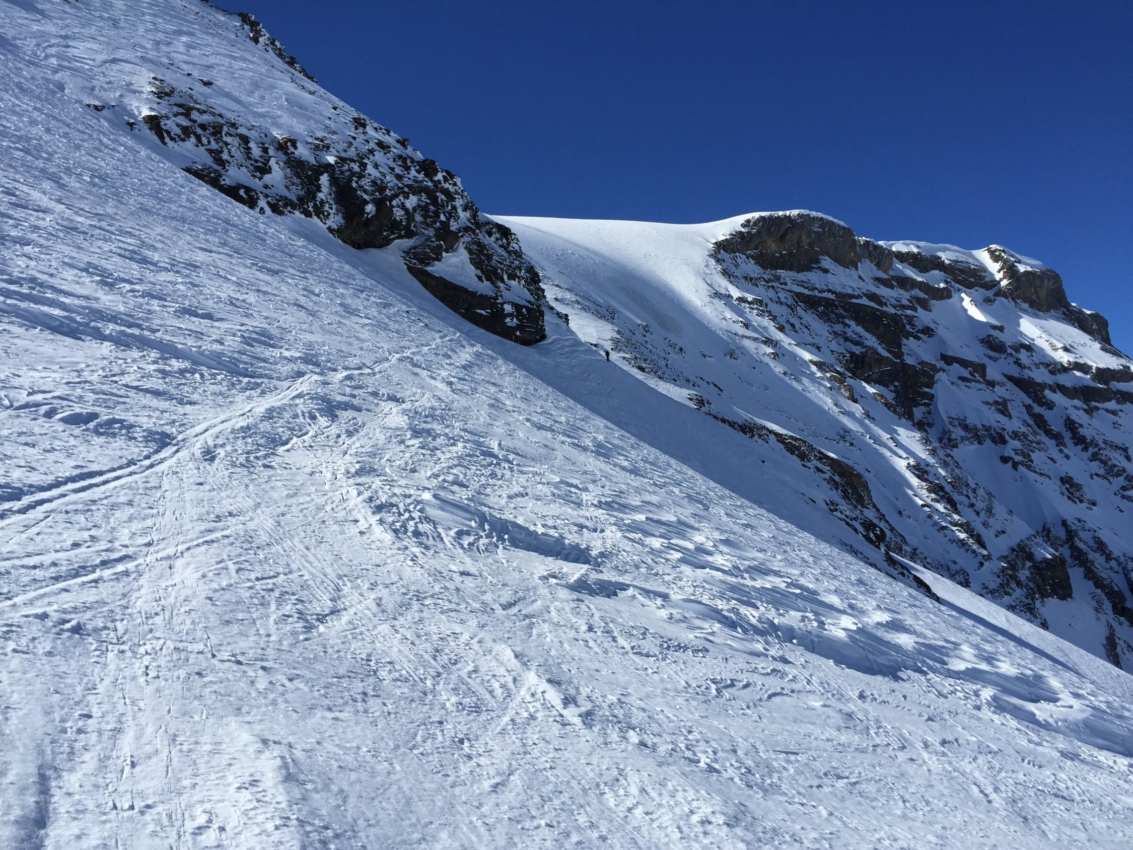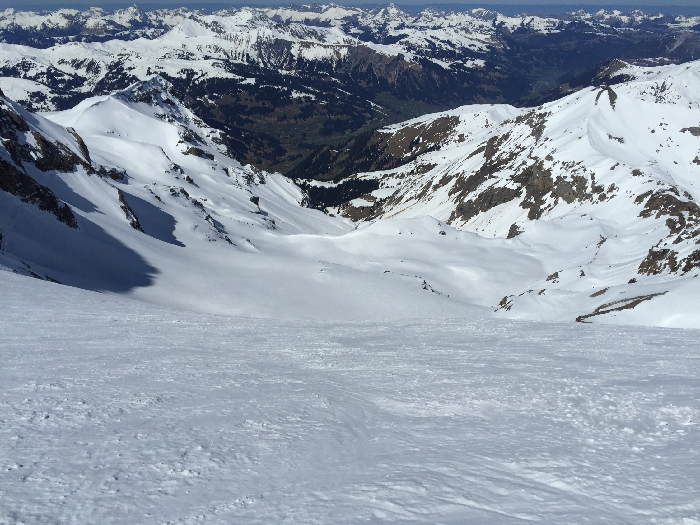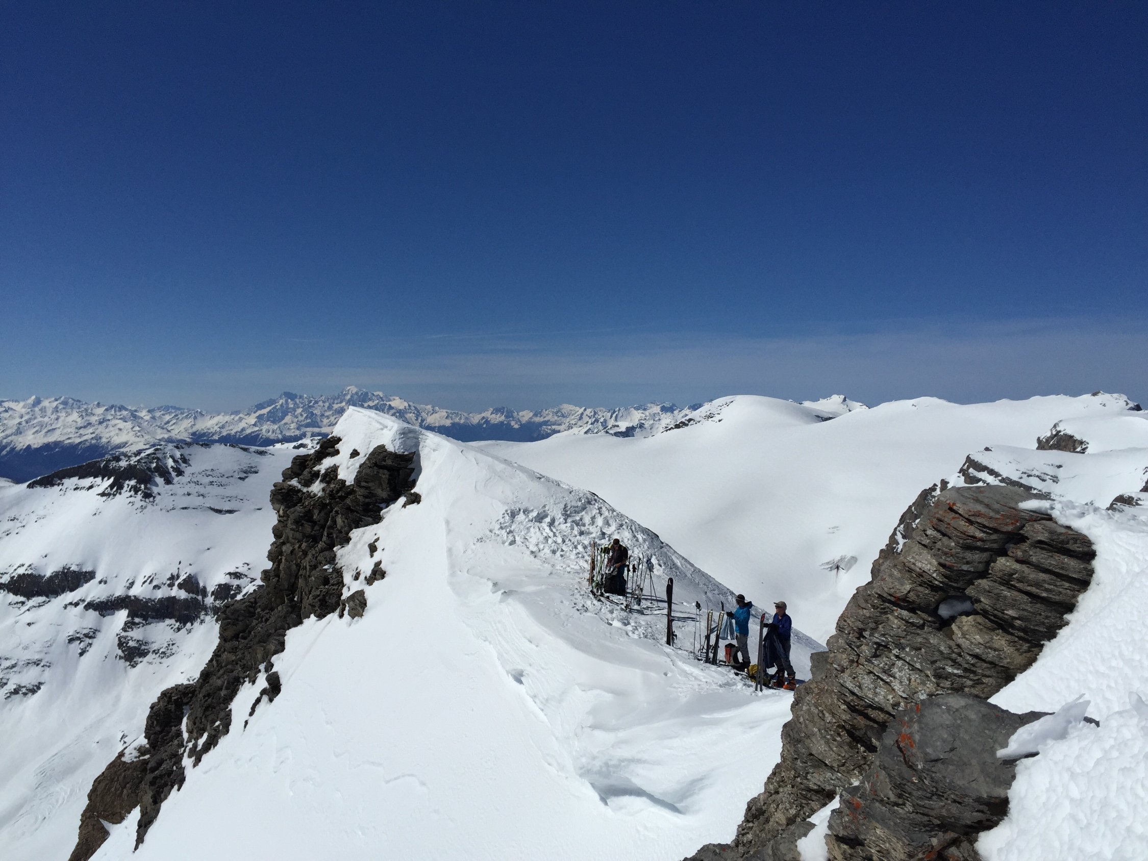 Heute herrschten sehr gute Tourenverhältnisse, wunderbares Wetter und im Aufstieg sehr gute Schneeverhältnisse. Der Aufstieg zum Wildstrubel hat momentan zwei heikle Stellen: Einmal die Querung am Frühstücksplatz, allen bekannt, die war heute sehr breit, aber auch abschüssig und nicht einfach zu fellen. (Selber bin ich zu Fuss rüber). Danach kommt gleich noch die Traverse über dem Ammertentäli, die ist nicht zu vernachlässigen, da man bei einem Sturz sehr weit gleiten würde. Harscheisen sind da absolut zwingend, jedenfalls für mich. Ansonsten ist der Aufstieg nicht schwierig, aber der Gipfel will verdient sein. Es waren heute recht viele Leute am Berg, und die Abstände waren ziemlich gross. Wunderschöne Gipfelrast, windstill und warm, mit phantastischer Fernsicht (siehe Fotos). Ganz tolle Aussichtsbühne. Dann die Abfahrt: Gipfel bis unter den Frühstücksplatz windbearbeitet und hart-griffig, sehr gut zu fahren. Dann der Mittelteil: Nicht tragende Kruste, nicht umgewandelter Firn, naja, ging (auch in die Oberschenkel :-) ). Zum Schluss dann schöner Firn und Sulz, prima.
