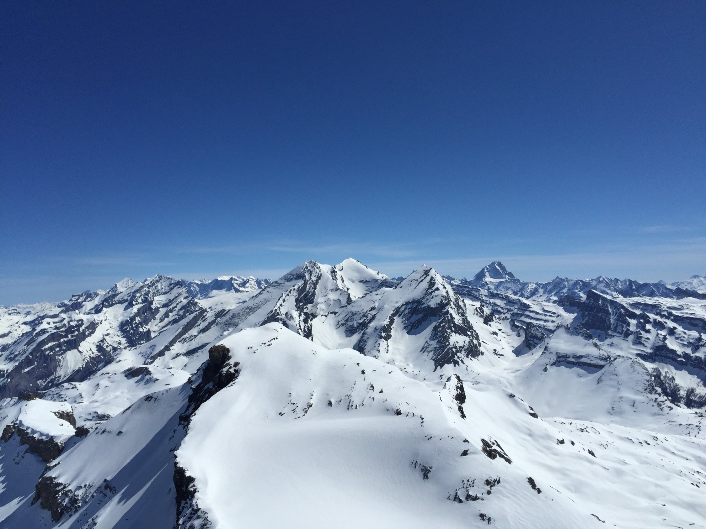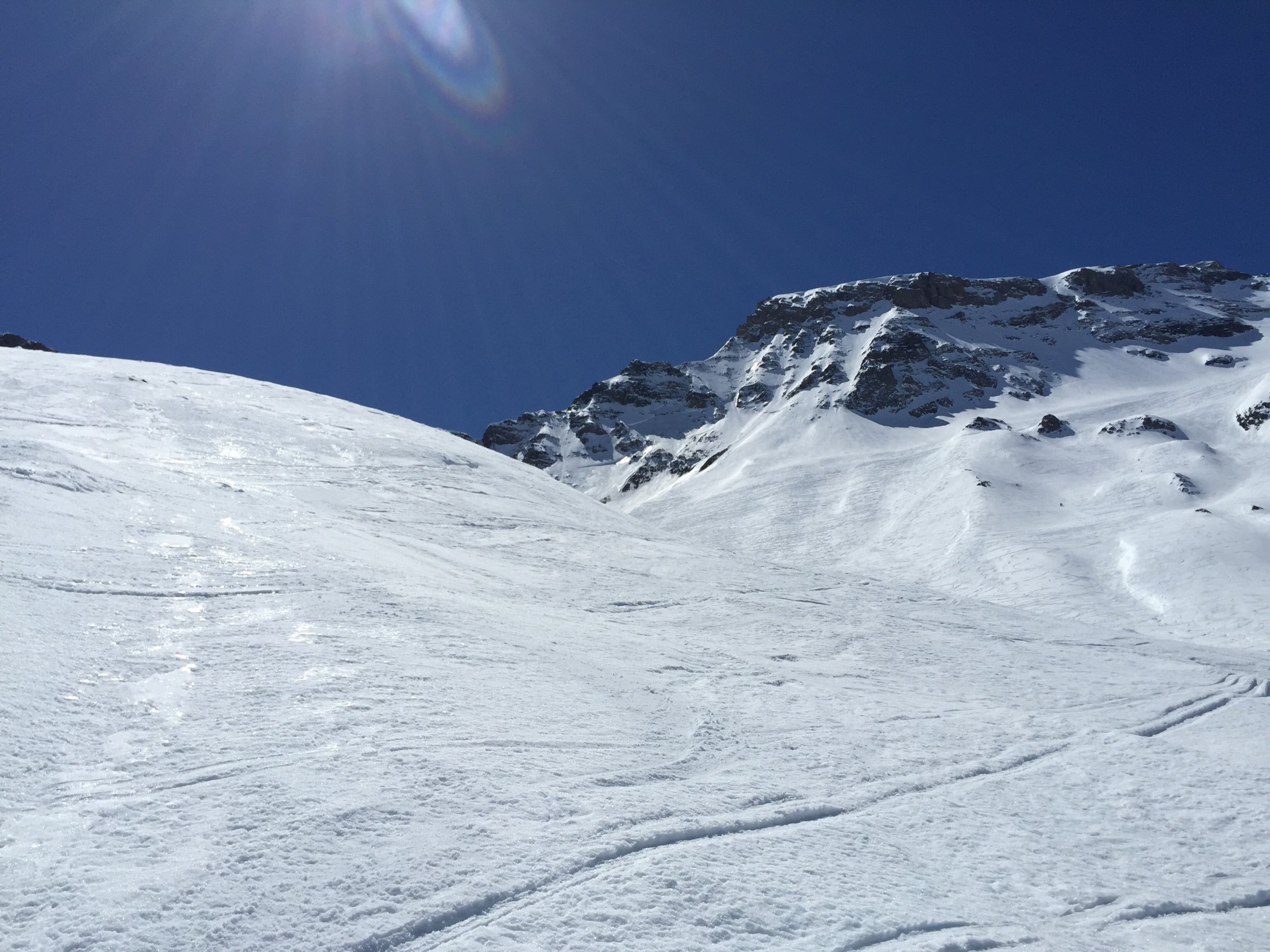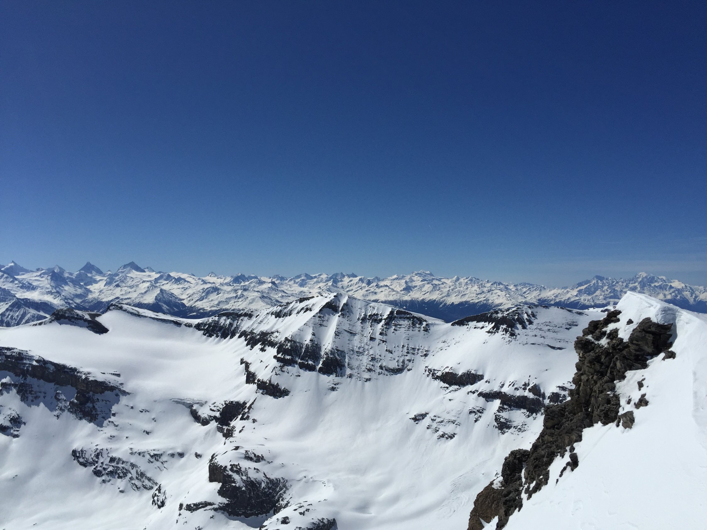 Heute herrschten sehr gute Tourenverhältnisse, wunderbares Wetter und im Aufstieg sehr gute Schneeverhältnisse. Der Aufstieg zum Wildstrubel hat momentan zwei heikle Stellen: Einmal die Querung am Frühstücksplatz, allen bekannt, die war heute sehr breit, aber auch abschüssig und nicht einfach zu fellen. (Selber bin ich zu Fuss rüber). Danach kommt gleich noch die Traverse über dem Ammertentäli, die ist nicht zu vernachlässigen, da man bei einem Sturz sehr weit gleiten würde. Harscheisen sind da absolut zwingend, jedenfalls für mich. Ansonsten ist der Aufstieg nicht schwierig, aber der Gipfel will verdient sein. Es waren heute recht viele Leute am Berg, und die Abstände waren ziemlich gross. Wunderschöne Gipfelrast, windstill und warm, mit phantastischer Fernsicht (siehe Fotos). Ganz tolle Aussichtsbühne. Dann die Abfahrt: Gipfel bis unter den Frühstücksplatz windbearbeitet und hart-griffig, sehr gut zu fahren. Dann der Mittelteil: Nicht tragende Kruste, nicht umgewandelter Firn, naja, ging (auch in die Oberschenkel :-) ). Zum Schluss dann schöner Firn und Sulz, prima.