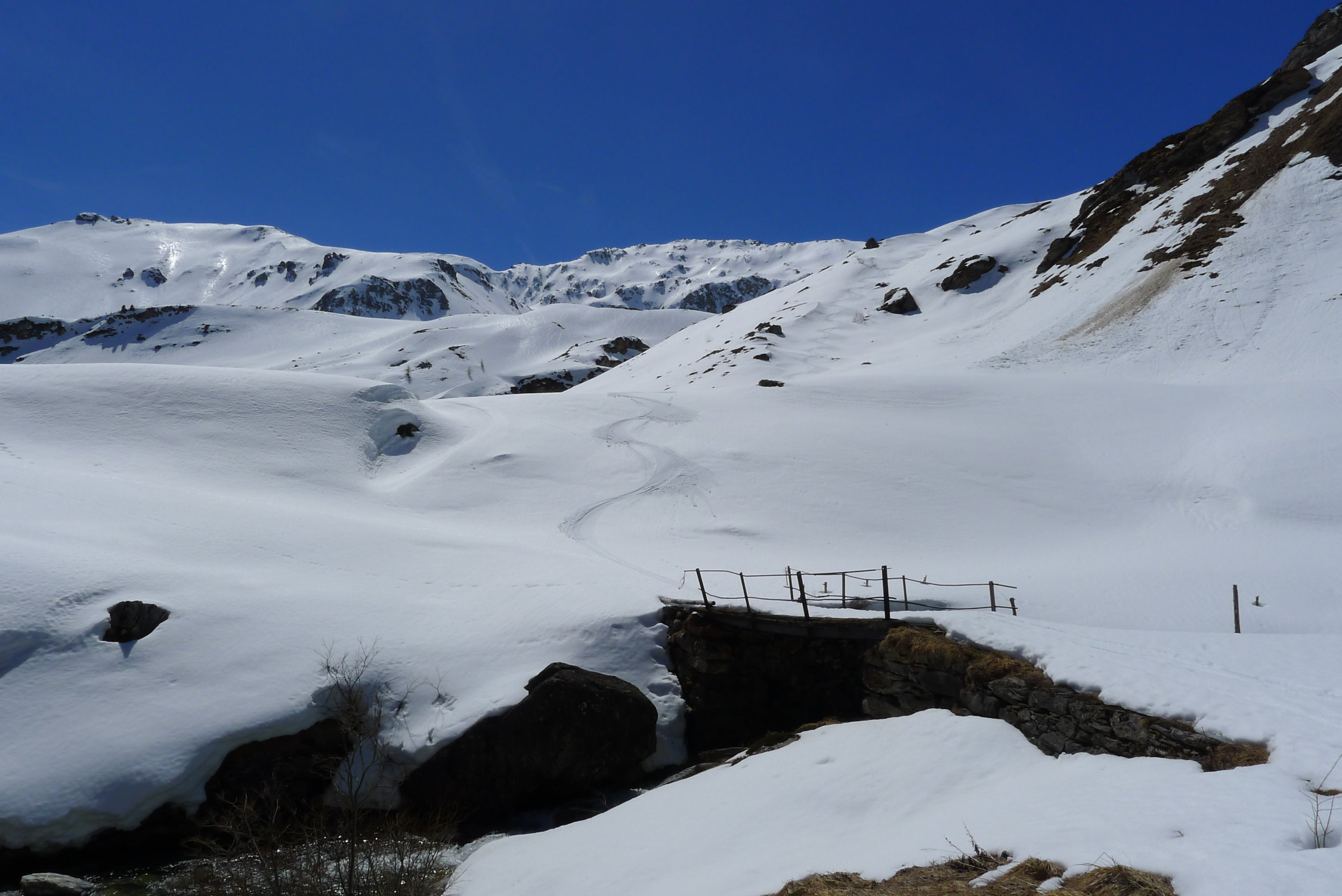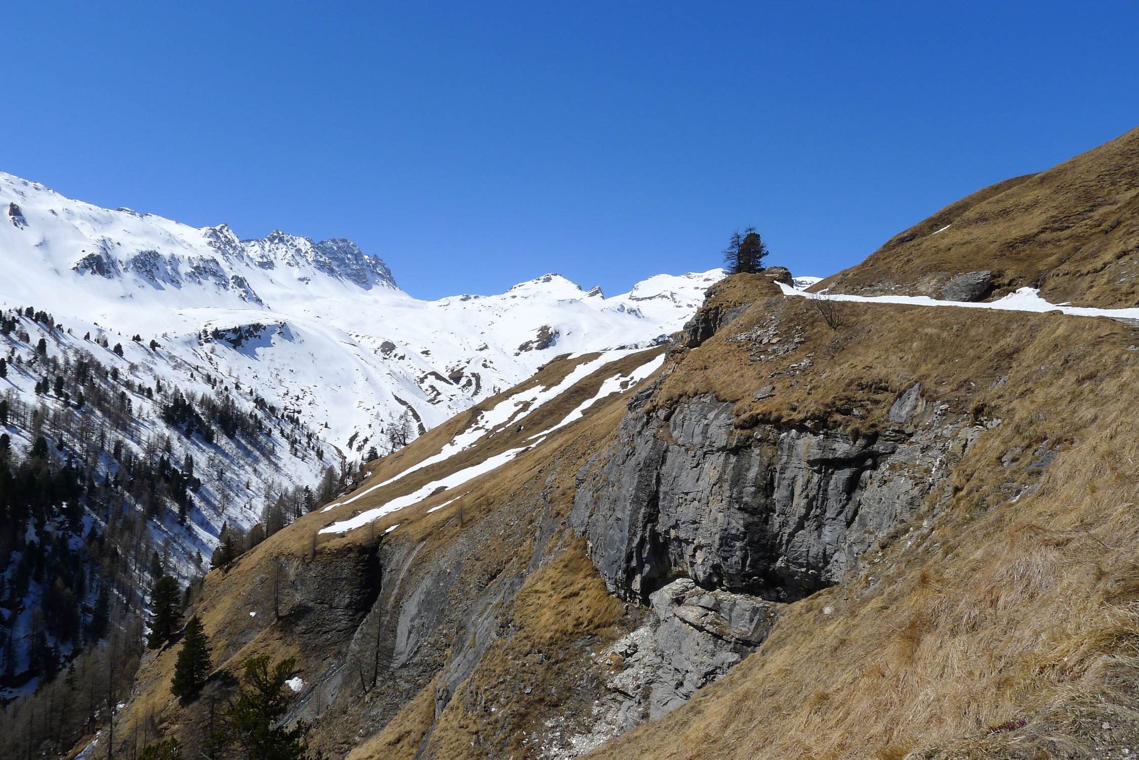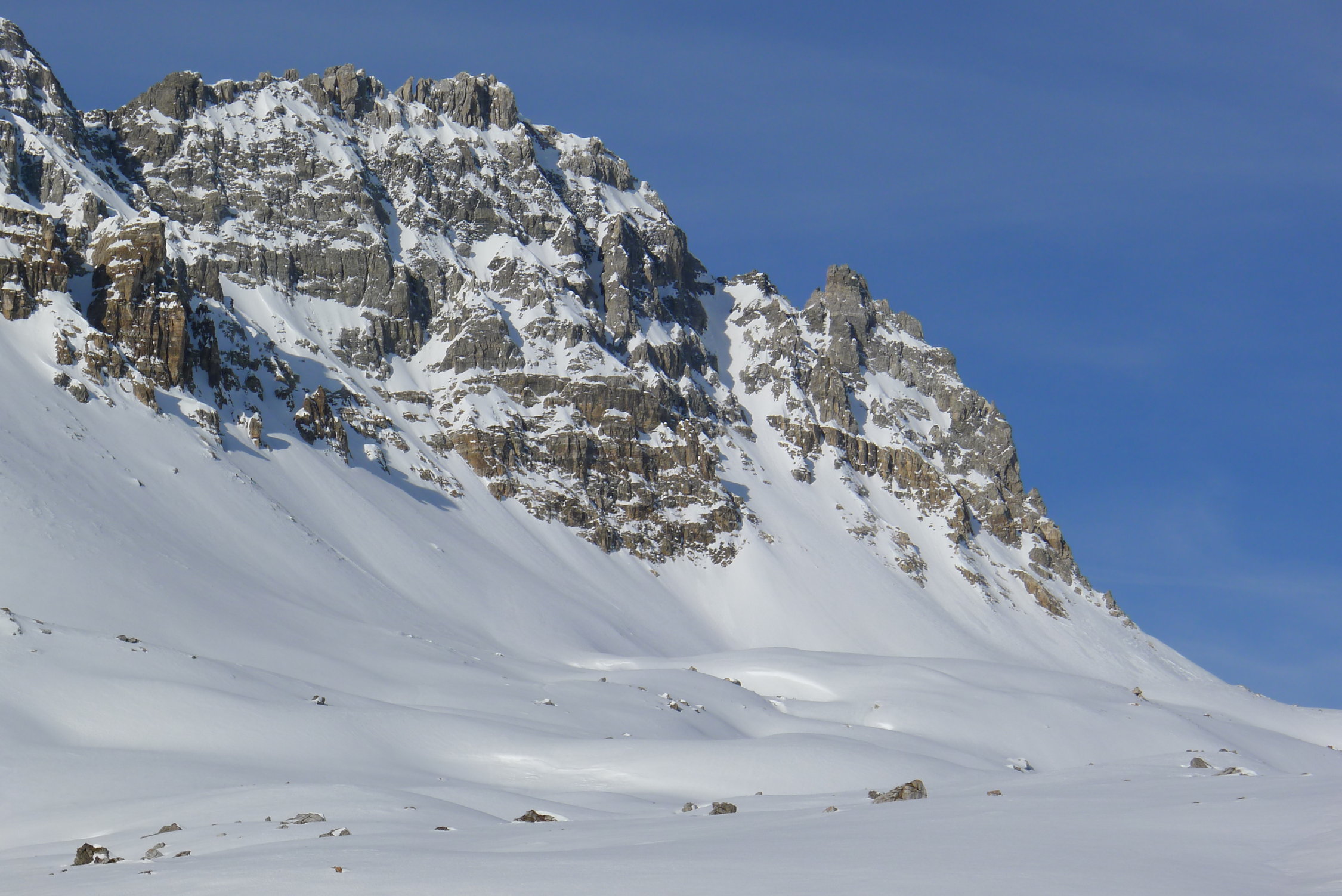 Bei diesen frühlingshaften Temperaturen wird es mit dem Schnee schnell mal knapp, insbesondere im Zustieg zur Brücke P.1914. Beim Start in Wergenstein müssen die Ski ca.20 Min. getragen werden. (Gilt auch für Piz Beverin, Bruschghorn etc.)