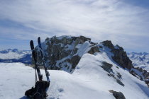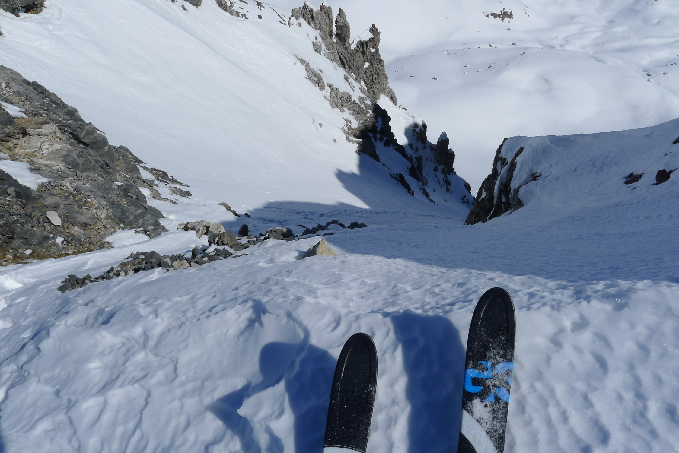 Topverhältnisse! In der NE-Rinne Pulverschnee auf harter Unterlage, nach der NE-Flanke butterweicher Firn, wenn man den richtigen Zeitpunkt erwischt (11Uhr auf dem Gipfel).