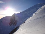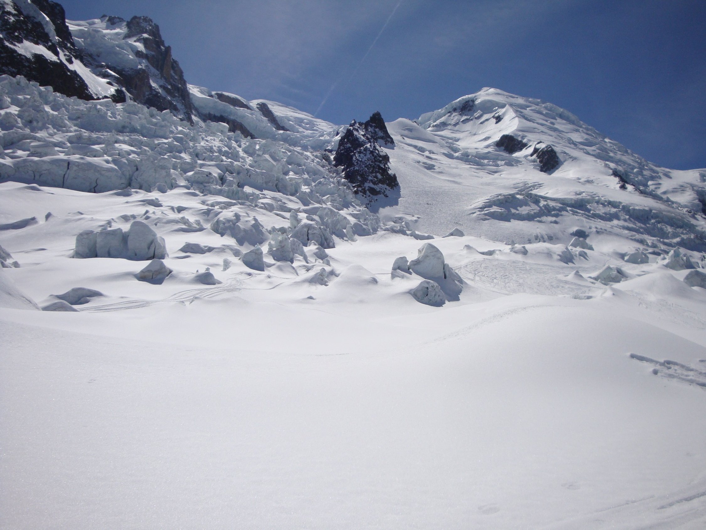 Eigentlich gute Verhältnisse im Gebiet. Der Hüttenwart sagte mir "pas mal", das ist der richtige Ausdruck, denn es könnte ja schlechter sein. Zustieg zur Hütte, Querung zur unter der Midi hindurch zur Jonction etwas mühsam und wenn hart heikel, ausrutschen verboten. Jonction selber sehr gut zu begehen, die Spur rechts unten herum ist im Moment besser. Aufstieg über Petit Plateau geht recht gut ist einfach wirklich gefährlich, es drohen immer Eislawinen. Umgehung über Dome du Gouter gespurt, halt schwieriger, steiler und länger. Ab 4200m alles hart und verblasen. Bossesgrat mit Steigeisen auf guter Spur zum Gipfel. Abfahrt über die Nordwand auch gespurt. Schneeverhältnisse auf der Abfahrt zum Skifahren generell lausig. Aber an diesem Berg ist die Abfahrt eher Nebensache.