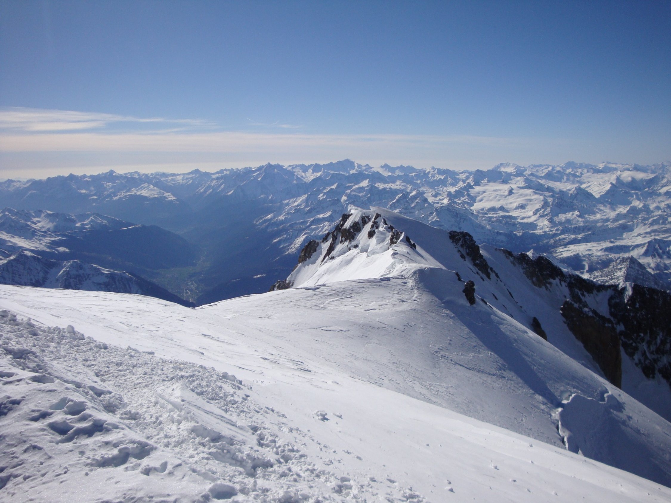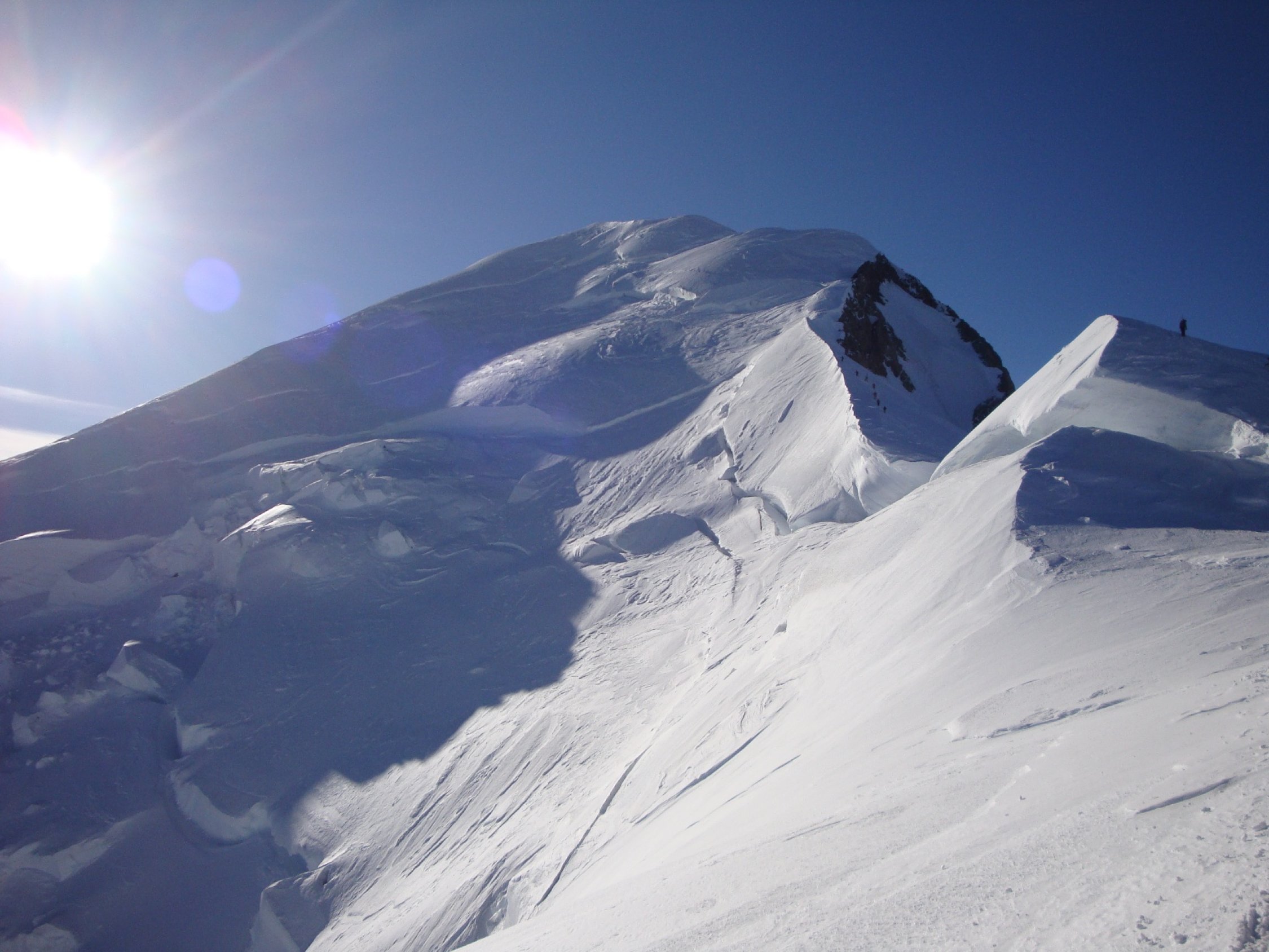 Start am 14.4 vom Plan de L'Aiguille zur Grand Mulets Hütte. Nach netter Bewirtung und einer kurzen Nacht Start um 3Uhr am 15.4. Aufstieg zuerst auf guter Spur rechts um die Pic Wilson herum, dann etwa 20Min Skitragen über steilen Eisbuckel. Dann weiter hoch mit Ski und später unter einem Eisbalkon traversierend zu einen Eisspalt, der mit kurzem Fussaufstieg zum Petit Plateau führt. Nun sind 10Min hoher Puls angesagt. Sprich lauf so schnell wie es halt geht auf dieser Höhe, damit man die sehr gefährliche Eisabbruchzone zügig hinter sich bringen kann. Danach ohne Probleme weiter zur Vallothütte. Ab 4000m sehr kalt. Dann von der Vallothütte mit Steigeisen zu Fuss über den gut begehbaren Bossesgrat zum Gipfel, nun etwas weniger gefroren, aber immer noch recht kalt. Doch es herrschte schönstes Wetter und wir konnten eine geniale Aussicht geniessen vom Höchsten der Alpen. Abstieg und Abfahrt über die gleiche Route. Tolle Tour in eindrücklicher Umgebung. Aufstieg nicht besonders schwierig, aber mit den Verhältnissen, Gletschersituation und der grossen Höhe wiederum doch anspruchsvoll. Letzte Bemerkung, gehe da nur hin bei wirklich schönem Wetter und wenig Wind, alles andere lohnt nicht.