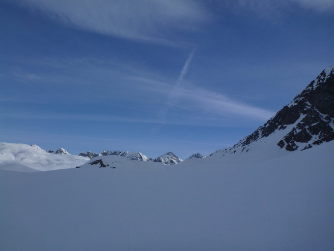 Es hat noch sehr viel Schnee in dieser Gegend und das direkt vom Parkplatz in All'Acqua weg. Gegen Mittag sollte man wegen dem Tagesverlauf zurück sein, dem Zeitaufwand für diese lange Tour muss entsprechend Rechnung getragen werden. Alleine für den Rückweg muss, je nach Routenwahl, mit mindestens 2 Std gerechnet werden!