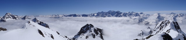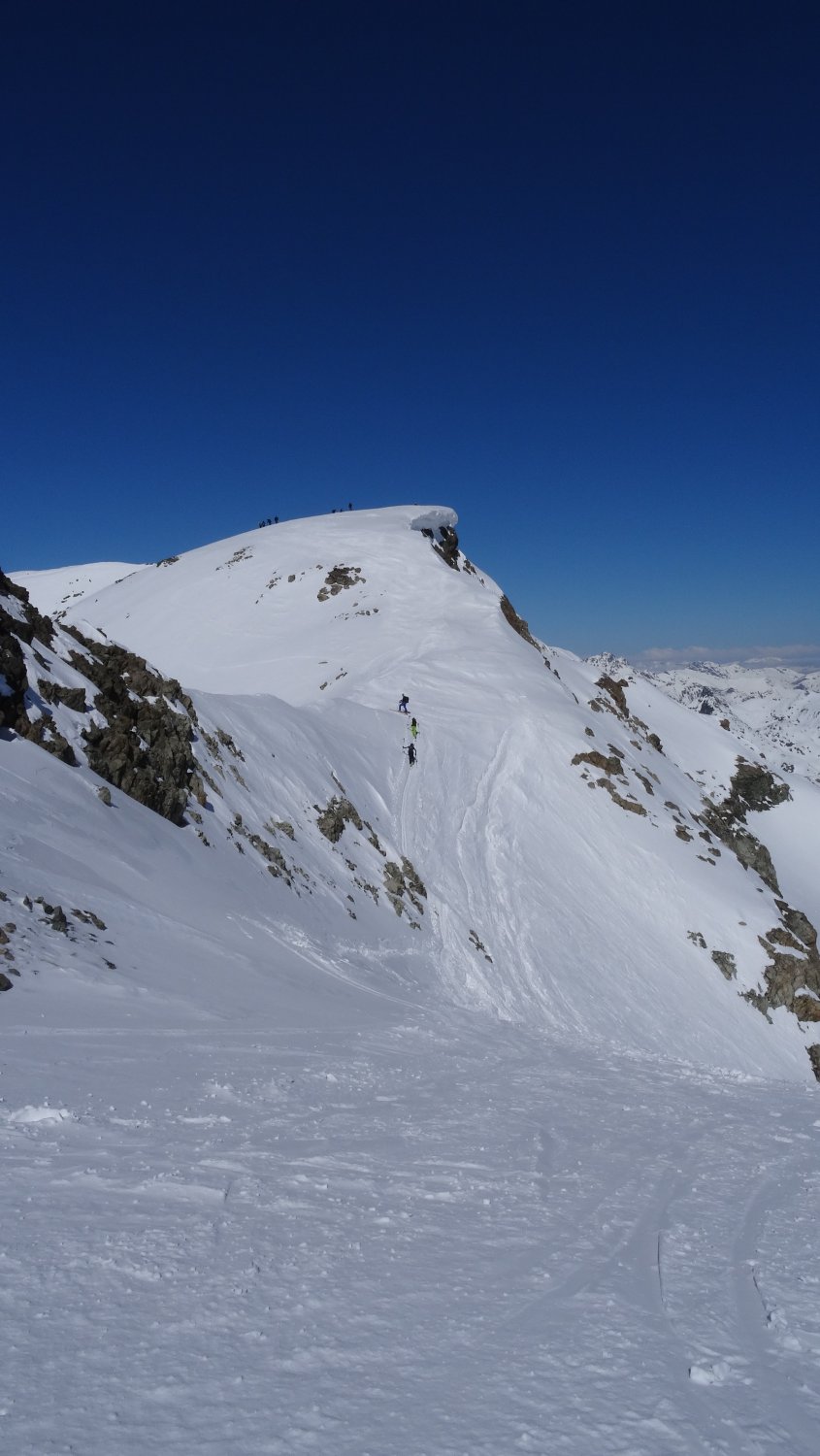 Da 1 Harscheisen schon im unteren Steilhang kaputt ging, liessen wir den Wintergipfel links liegen und genossen auf Pkt. 3085 die wunderschöne Aussicht und das Nebelmeer im Süden zu zweit.