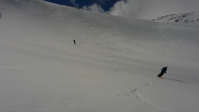Abfahrt ab Ostgipfel kurz Krustenpulver, dann bis zum See herrlicher Sulz. Danach Nassschnee...
