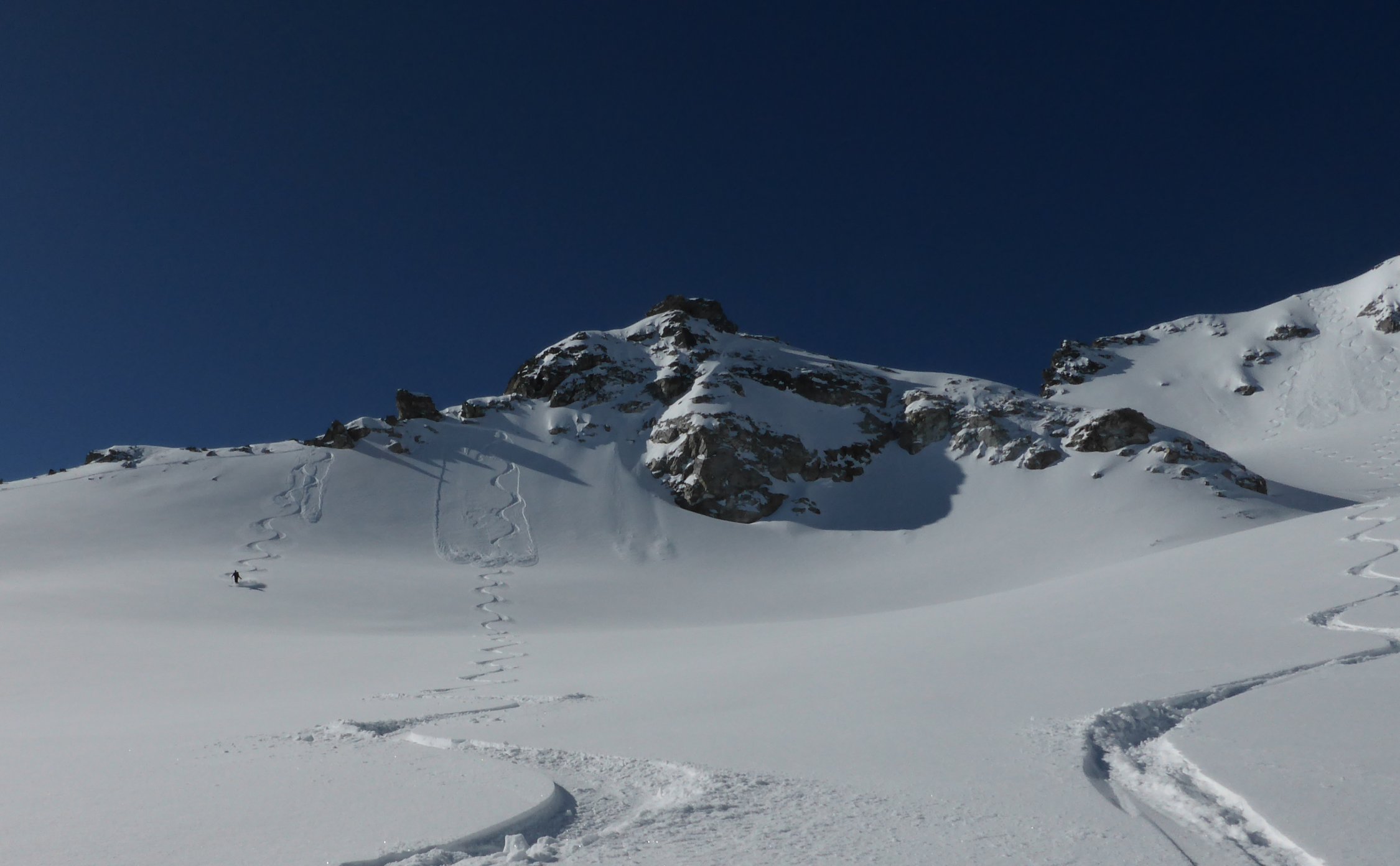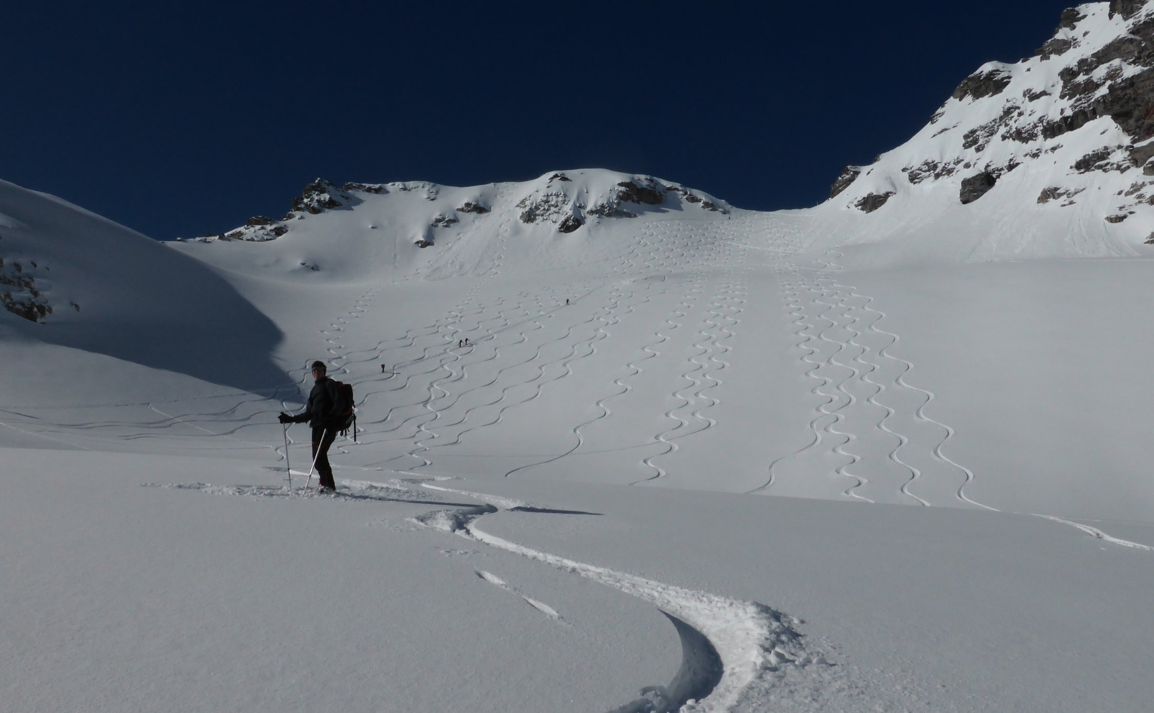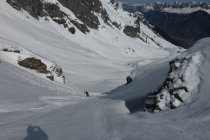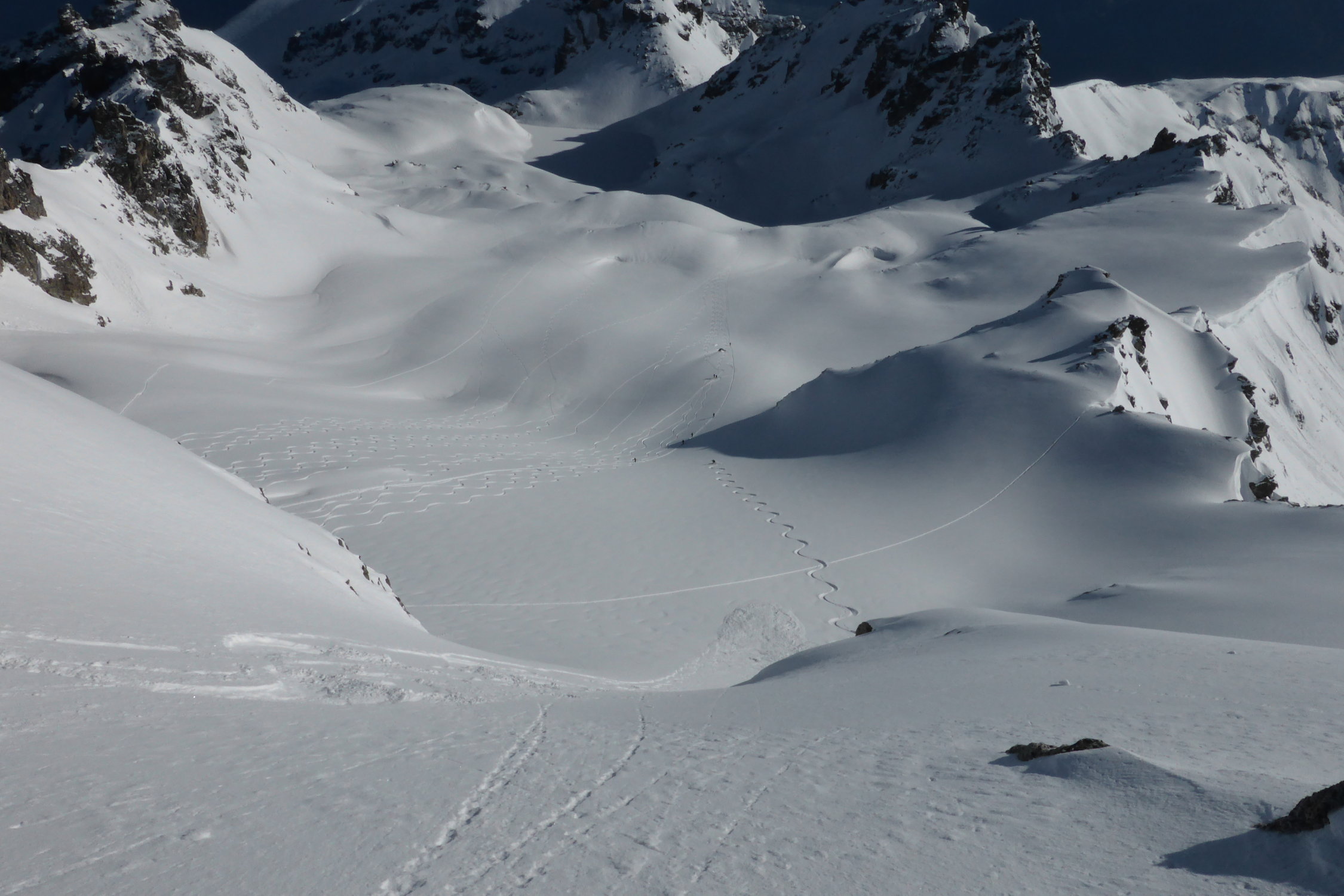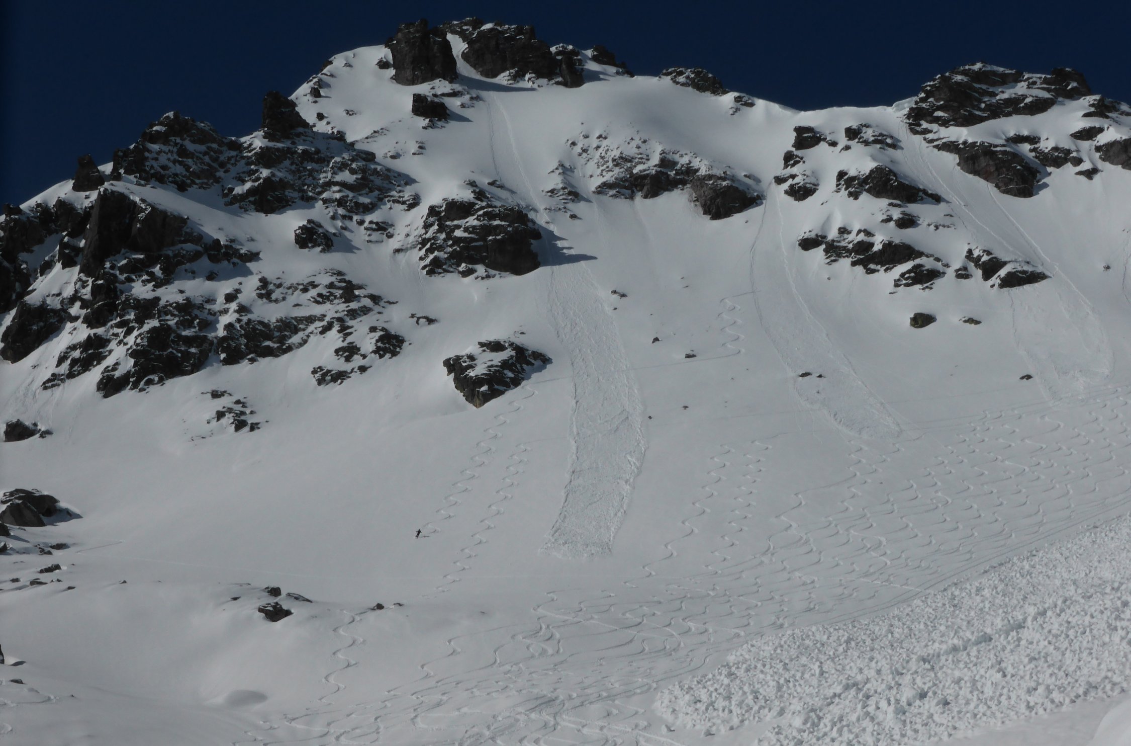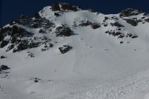 Nassschneerutsche schon ab 11.00 Uhr ab den steilen Ostflanken zur Wildseelücke