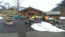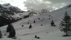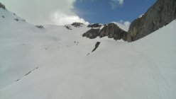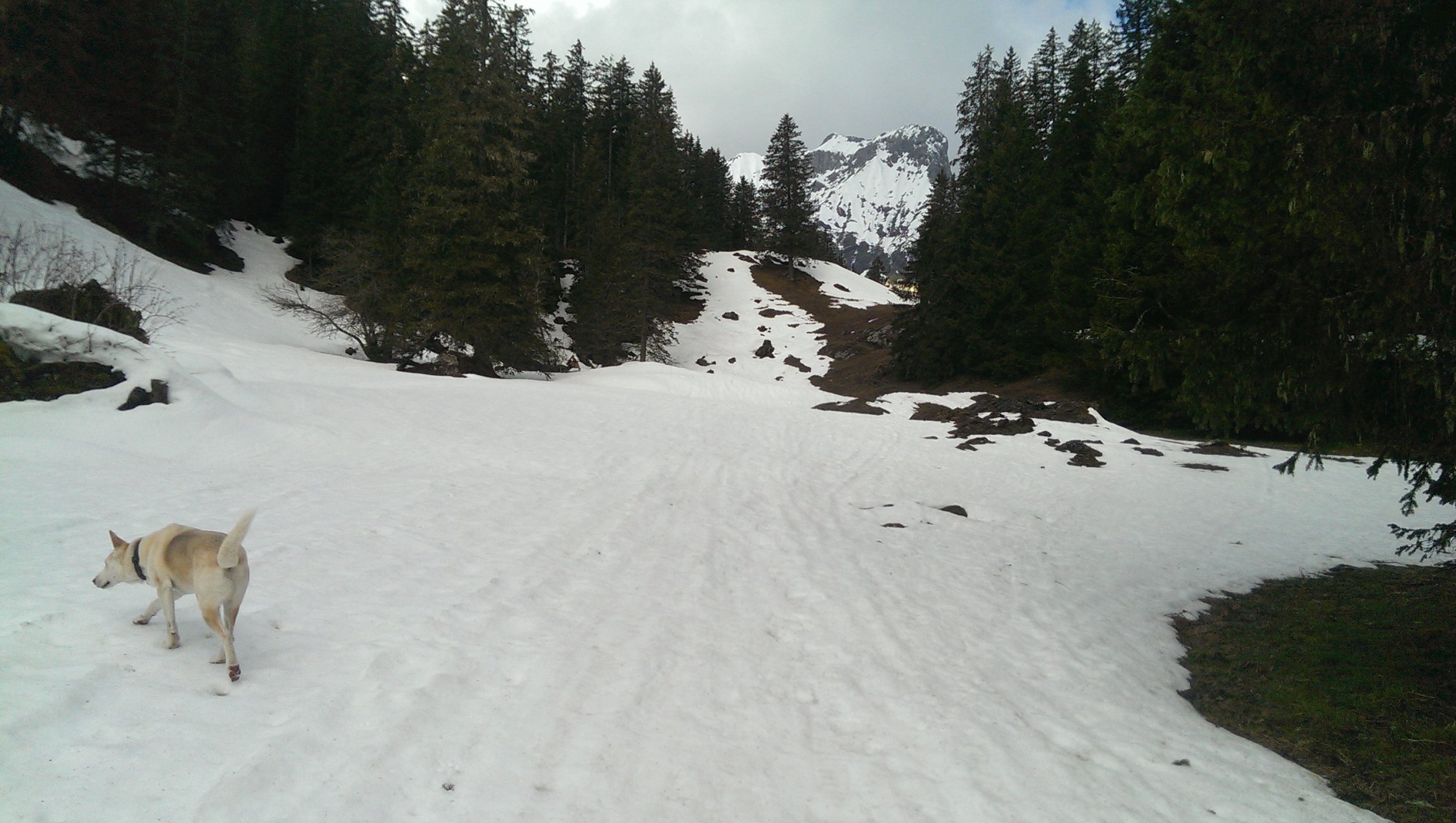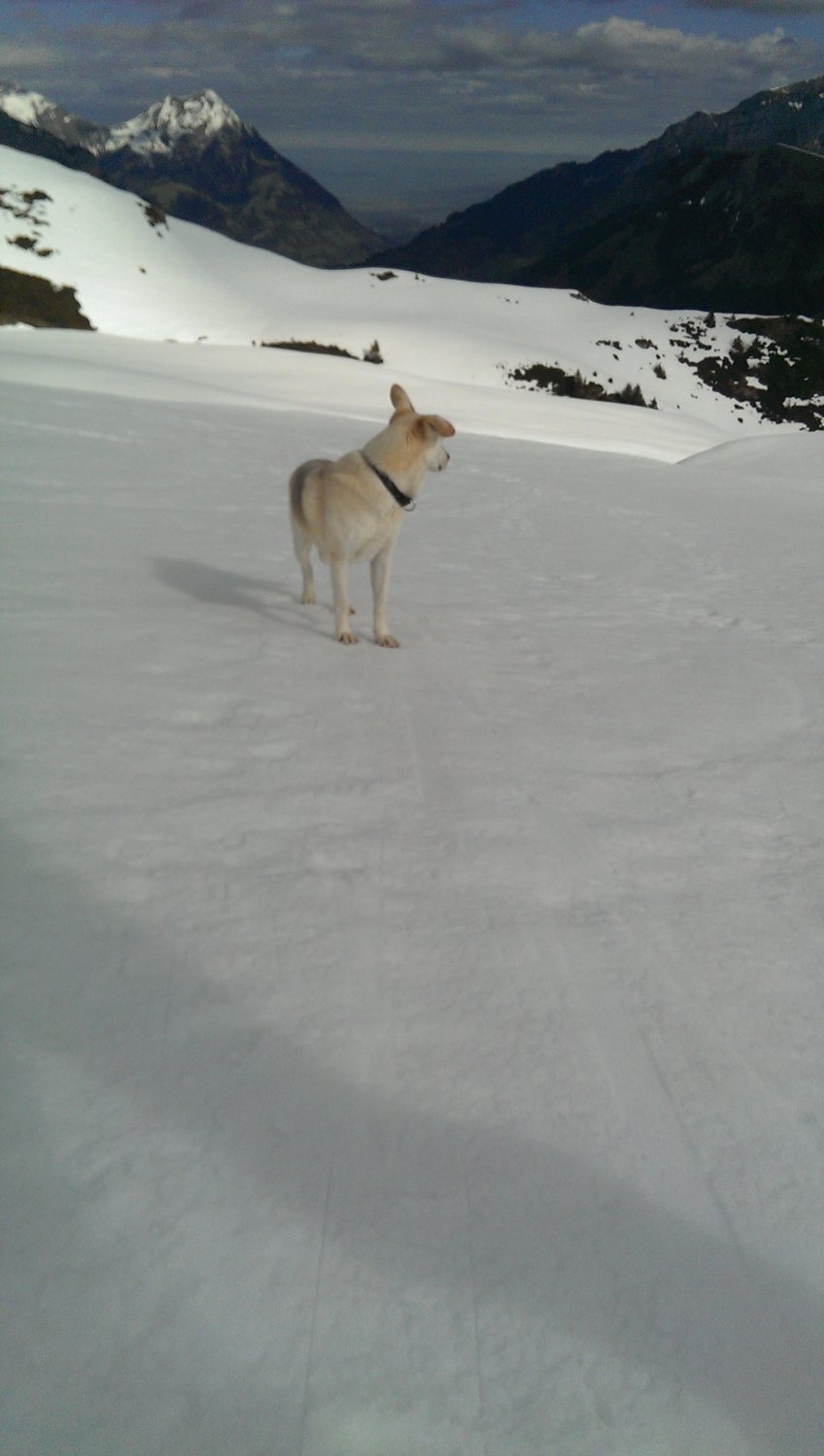 Am Morgen schöne tragende Schneedecke, Abfahrt vom Bärentritt um 10.45. Perfekter Sulz auf harter Unterlage bis Bundalp, danach weicher. Mit Ski noch gut fahrbar, mein Hund ist schon tiefer eingesunken.
