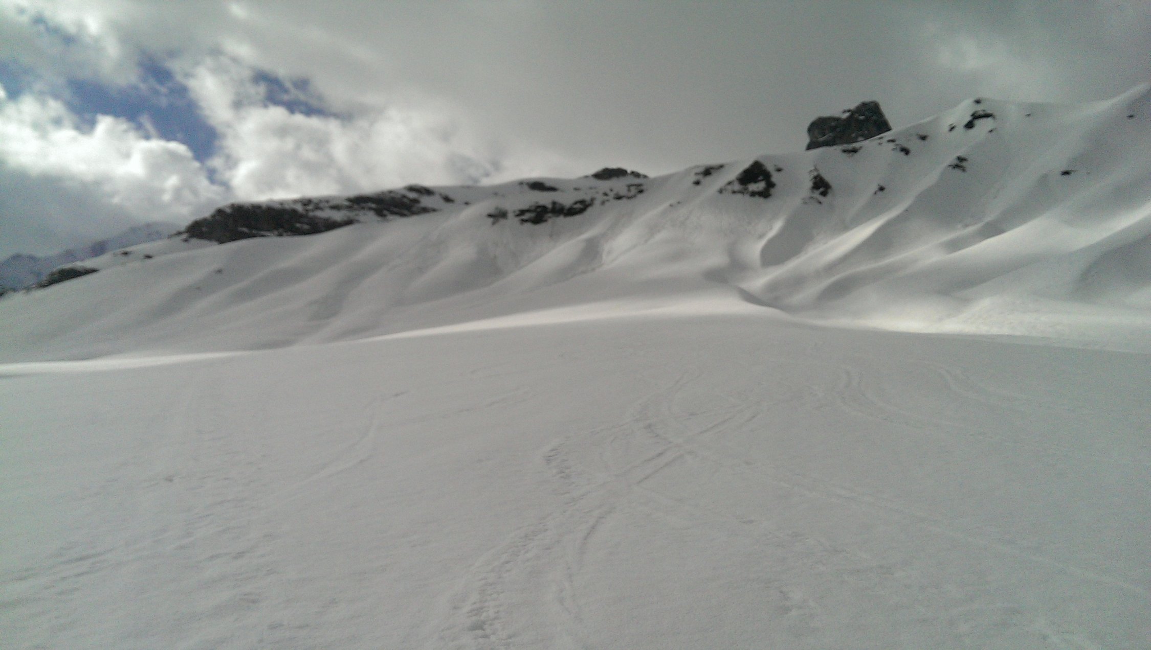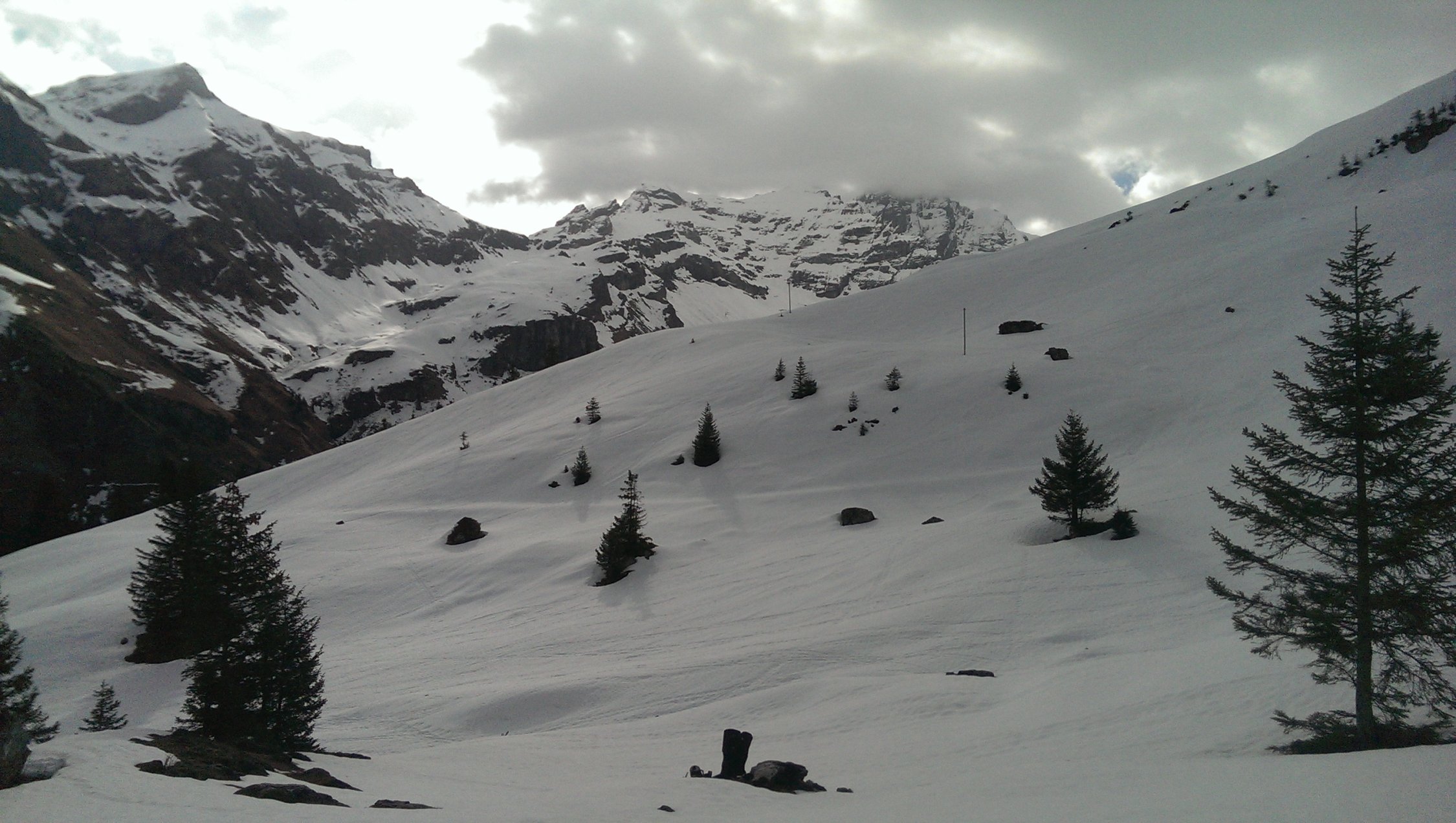um 08.30 von Griesalp aus gestartet, dann via Underi Bundalp hinauf zum Bäretritt. Bis Griesalp mit dem Auto (Strasse offen, ohne Schneeketten befahrbar), nach einer kurzen Tragestrecke kann man anfellen und die Ski durchgehend anbehalten.