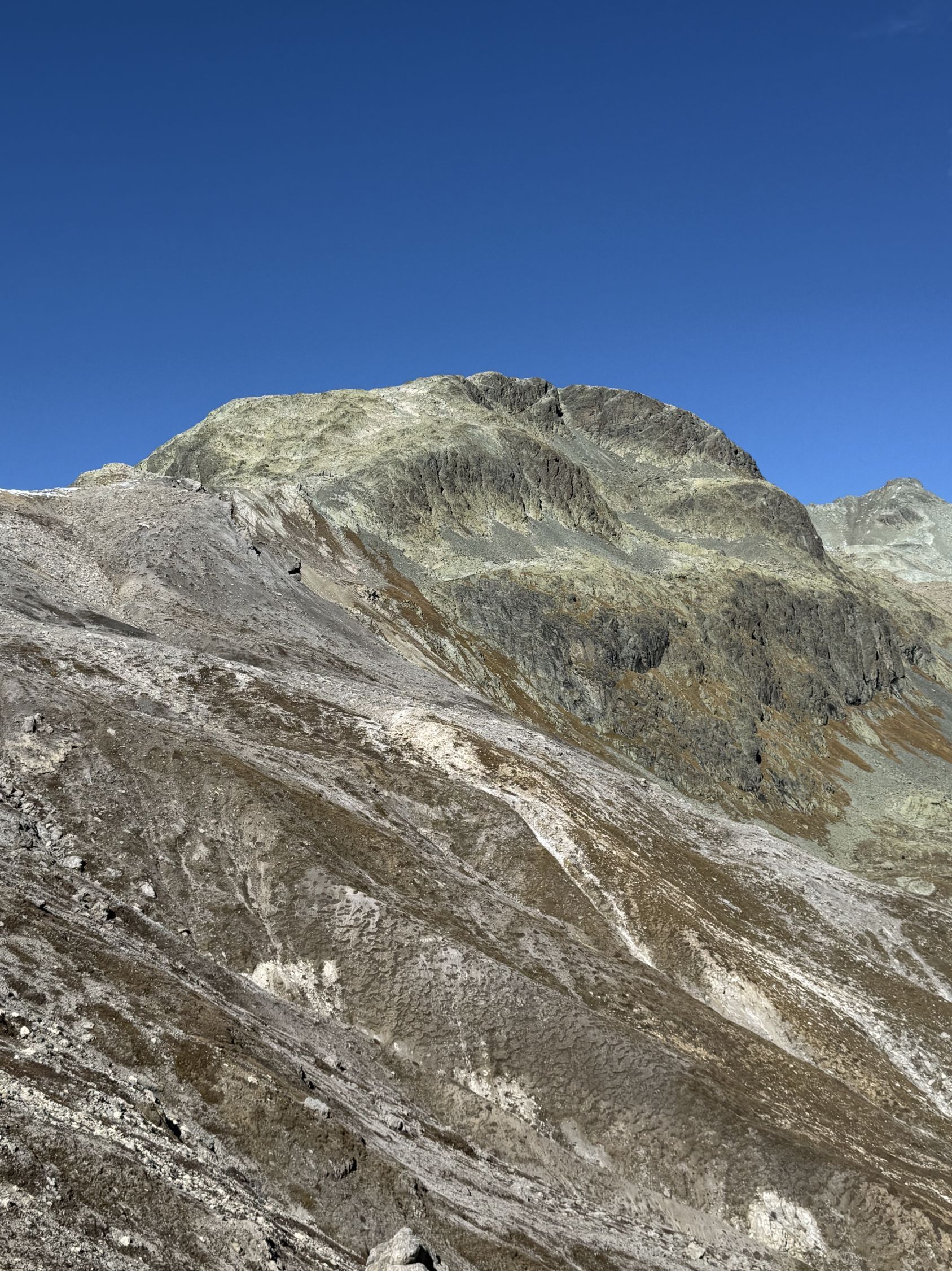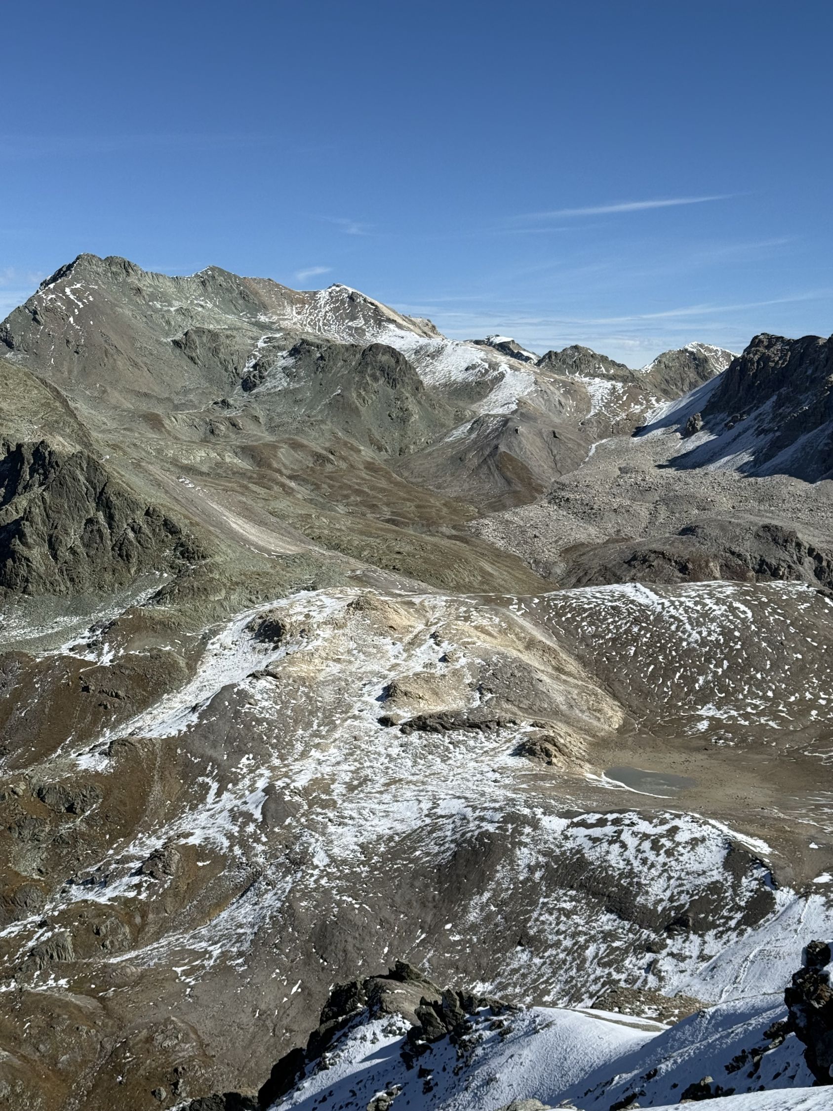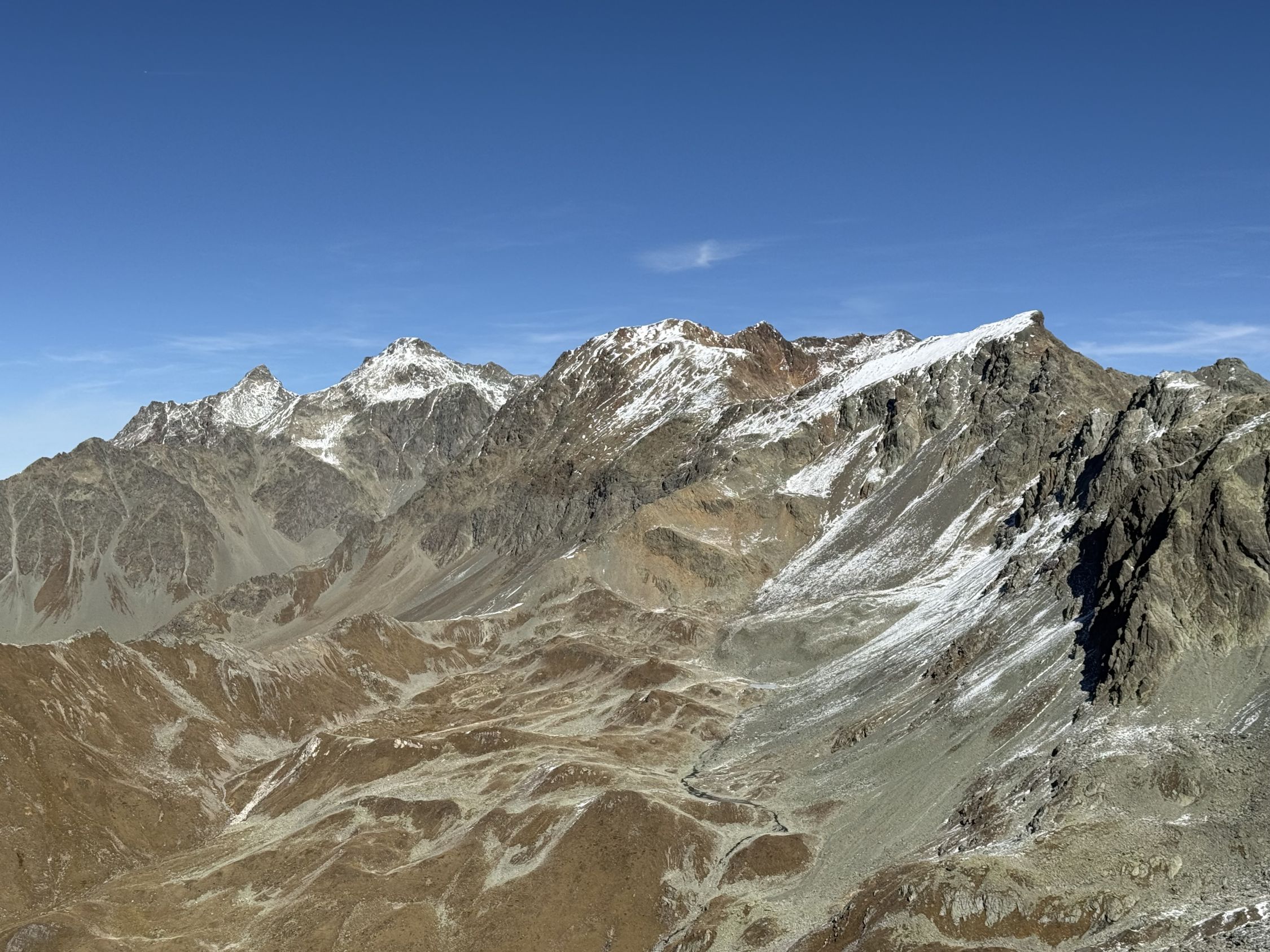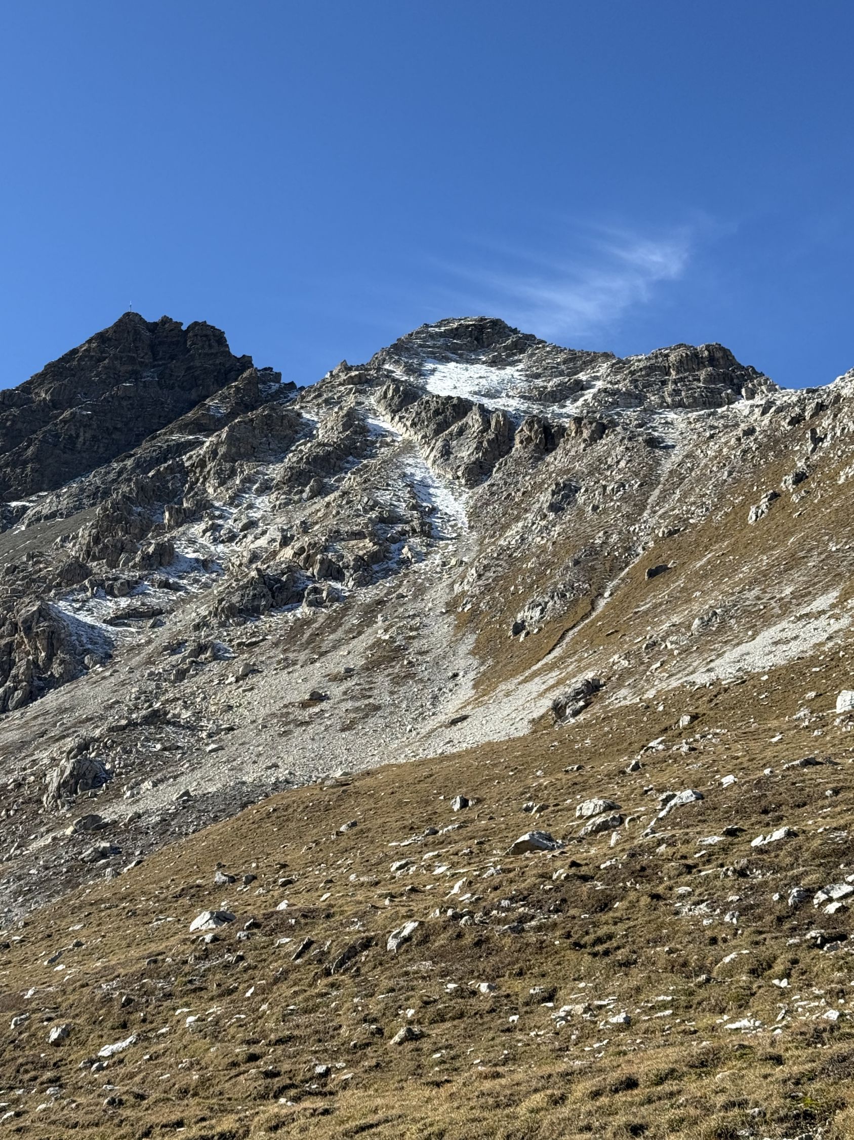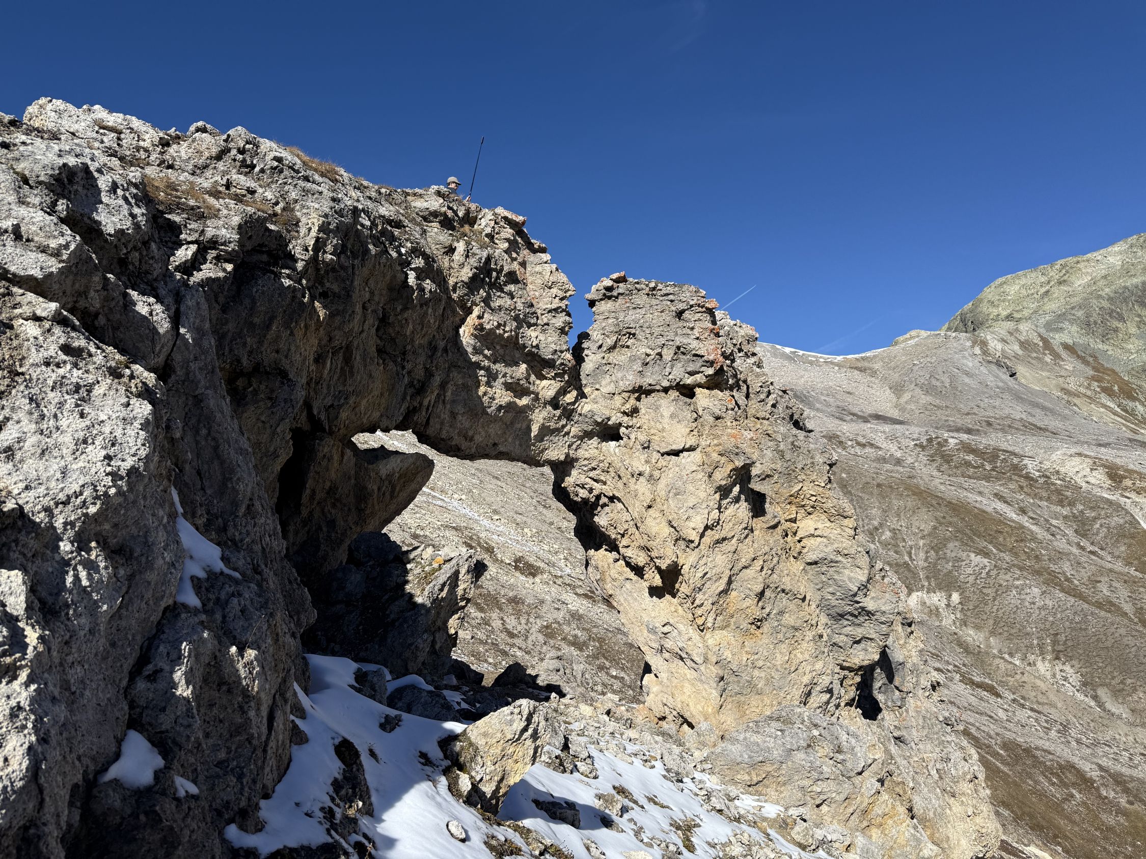 Herbsttour mit etwas Schnee auf den tollen Aussichtspunkt via das spektakuläre Felsentor, T3+. Start Parkplatz unterhalb La Veduta 9 Uhr, 5 Grad, windstill, blauer Himmel. Alles dem Wanderweg entlang, zuerst über Weidegelände, ab Punkt 2538 schmieriger Wanderweg bis Abzweigung Felsentor, nicht verzeichnet in Swisstopo. Nun trocken auf teilweise Wegspuren zur Fuorcla digl Leget, auf dem Rücken feucht und teilweise Schnee, Wegspuren. Abstieg via Felsentor.