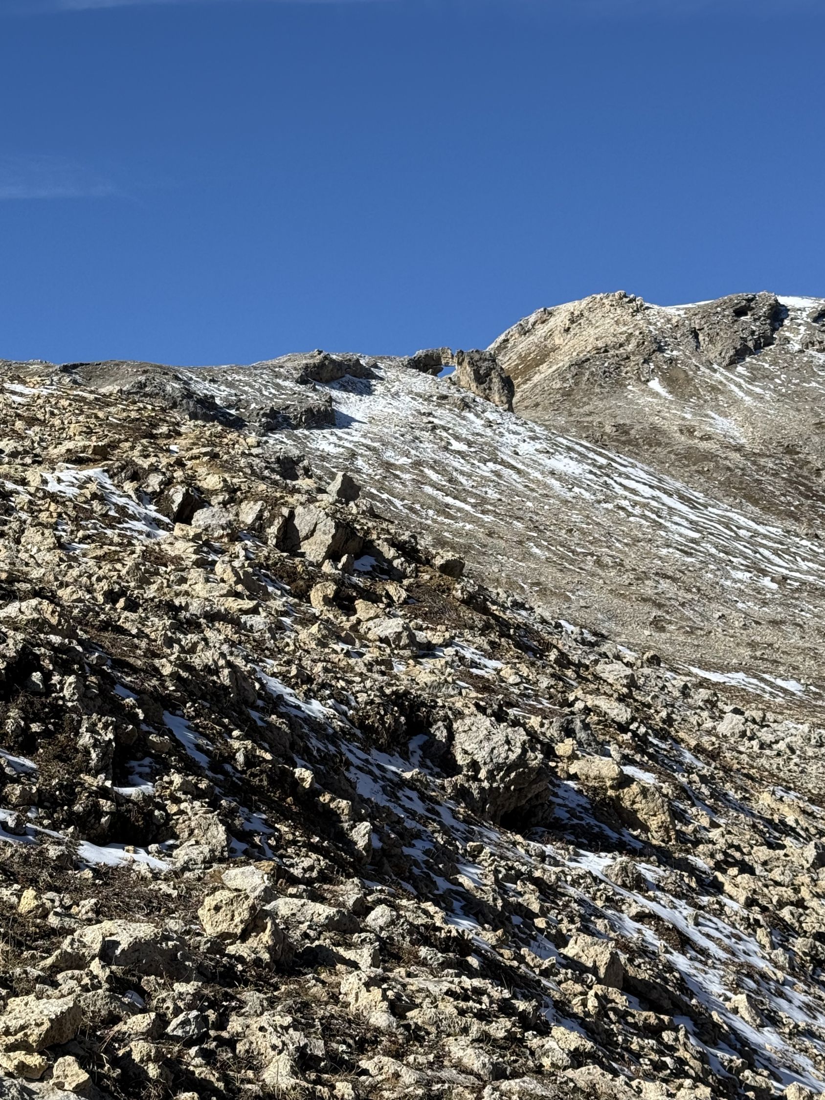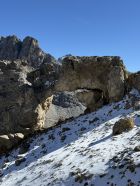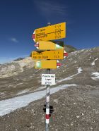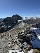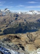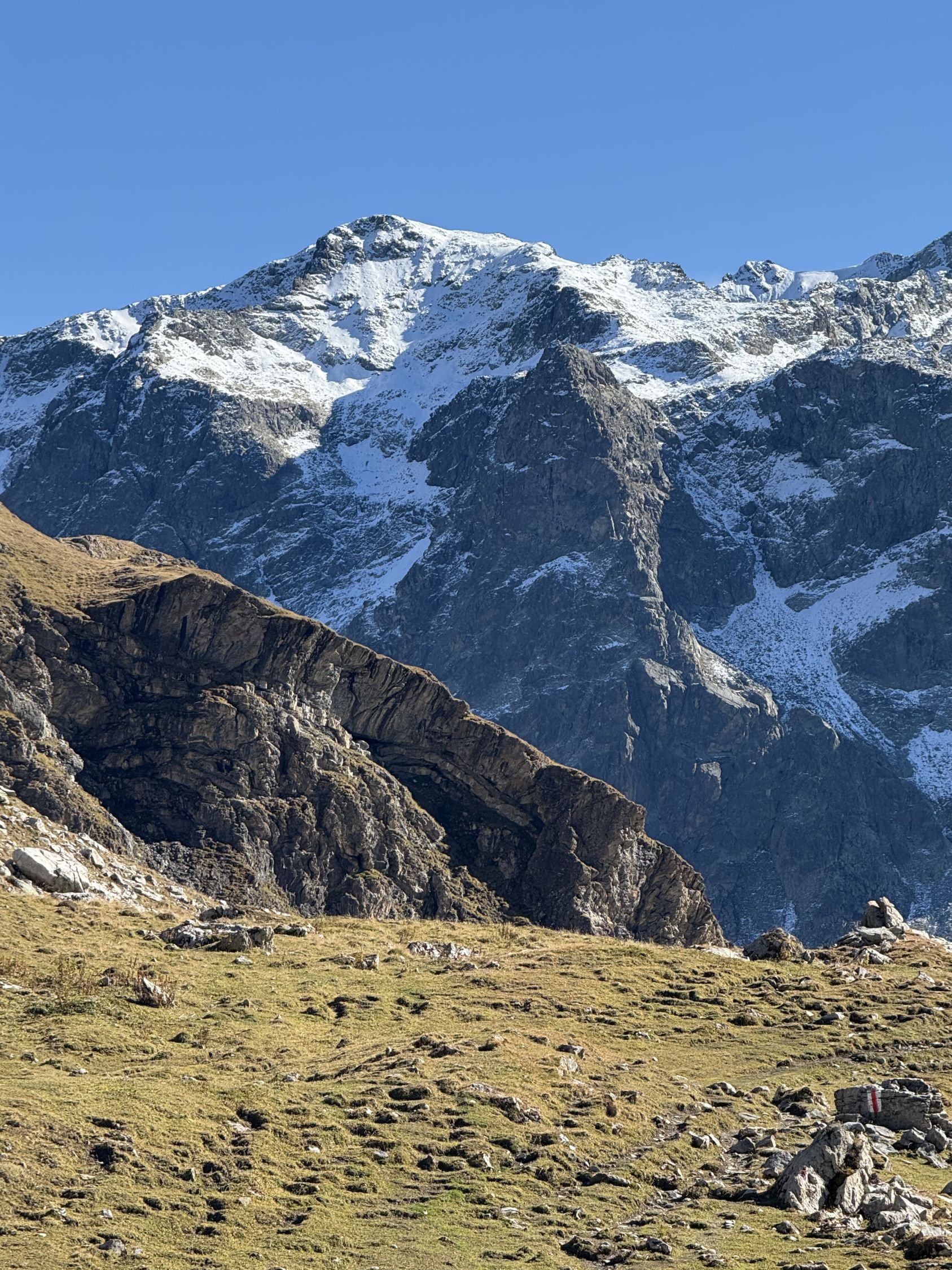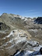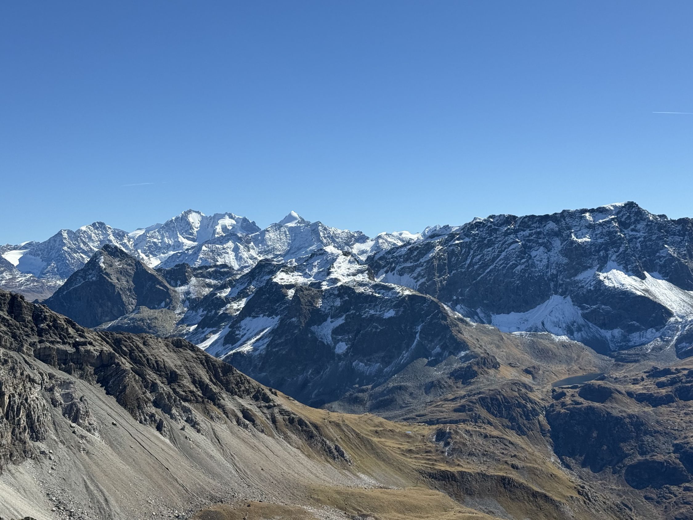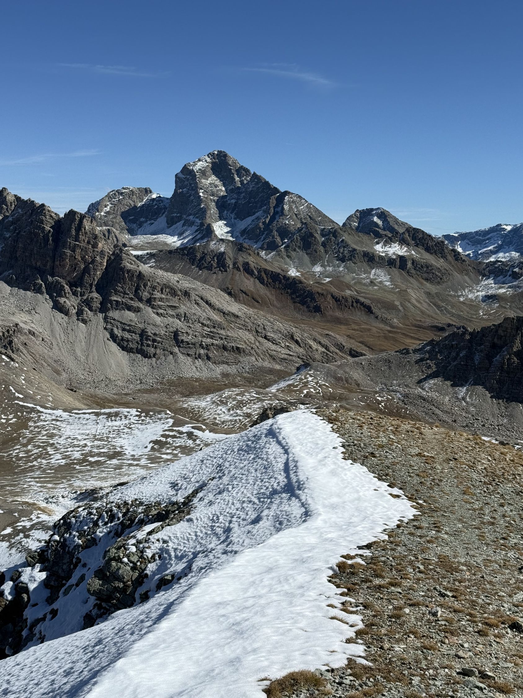Herbsttour mit etwas Schnee auf den tollen Aussichtspunkt via das spektakuläre Felsentor, T3+. Start Parkplatz unterhalb La Veduta 9 Uhr, 5 Grad, windstill, blauer Himmel. Alles dem Wanderweg entlang, zuerst über Weidegelände, ab Punkt 2538 schmieriger Wanderweg bis Abzweigung Felsentor, nicht verzeichnet in Swisstopo. Nun trocken auf teilweise Wegspuren zur Fuorcla digl Leget, auf dem Rücken feucht und teilweise Schnee, Wegspuren. Abstieg via Felsentor.