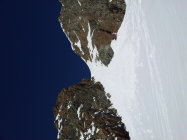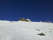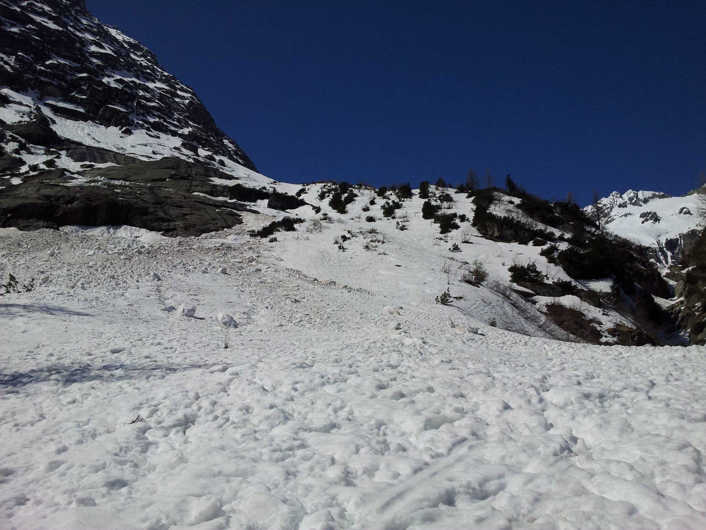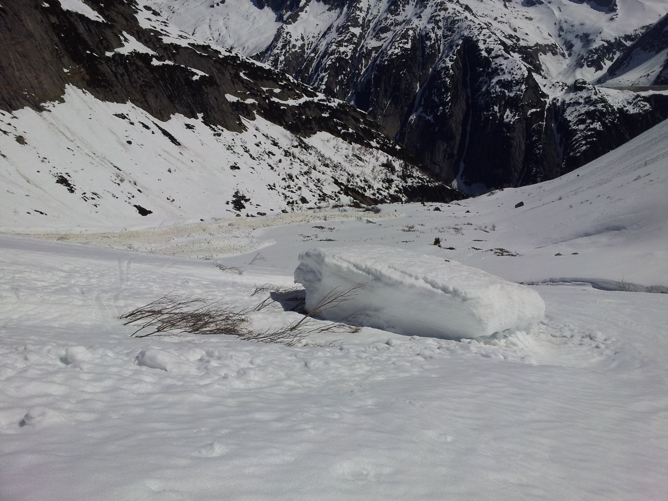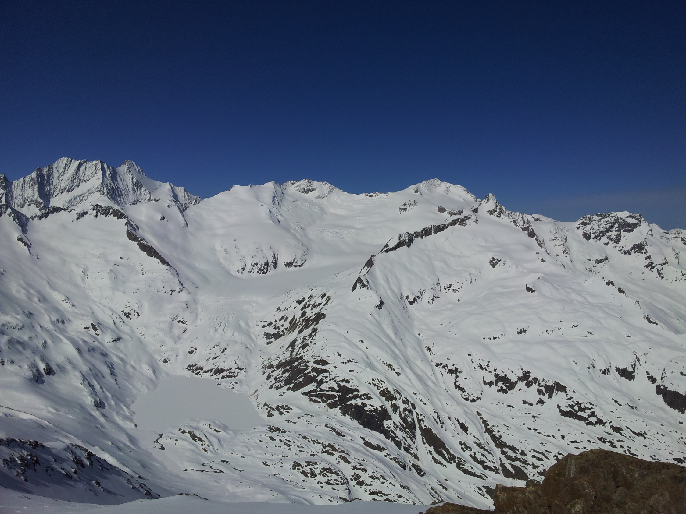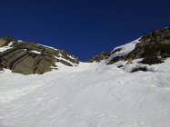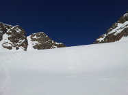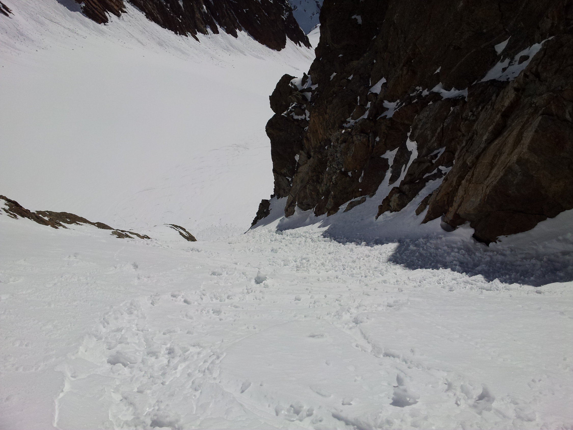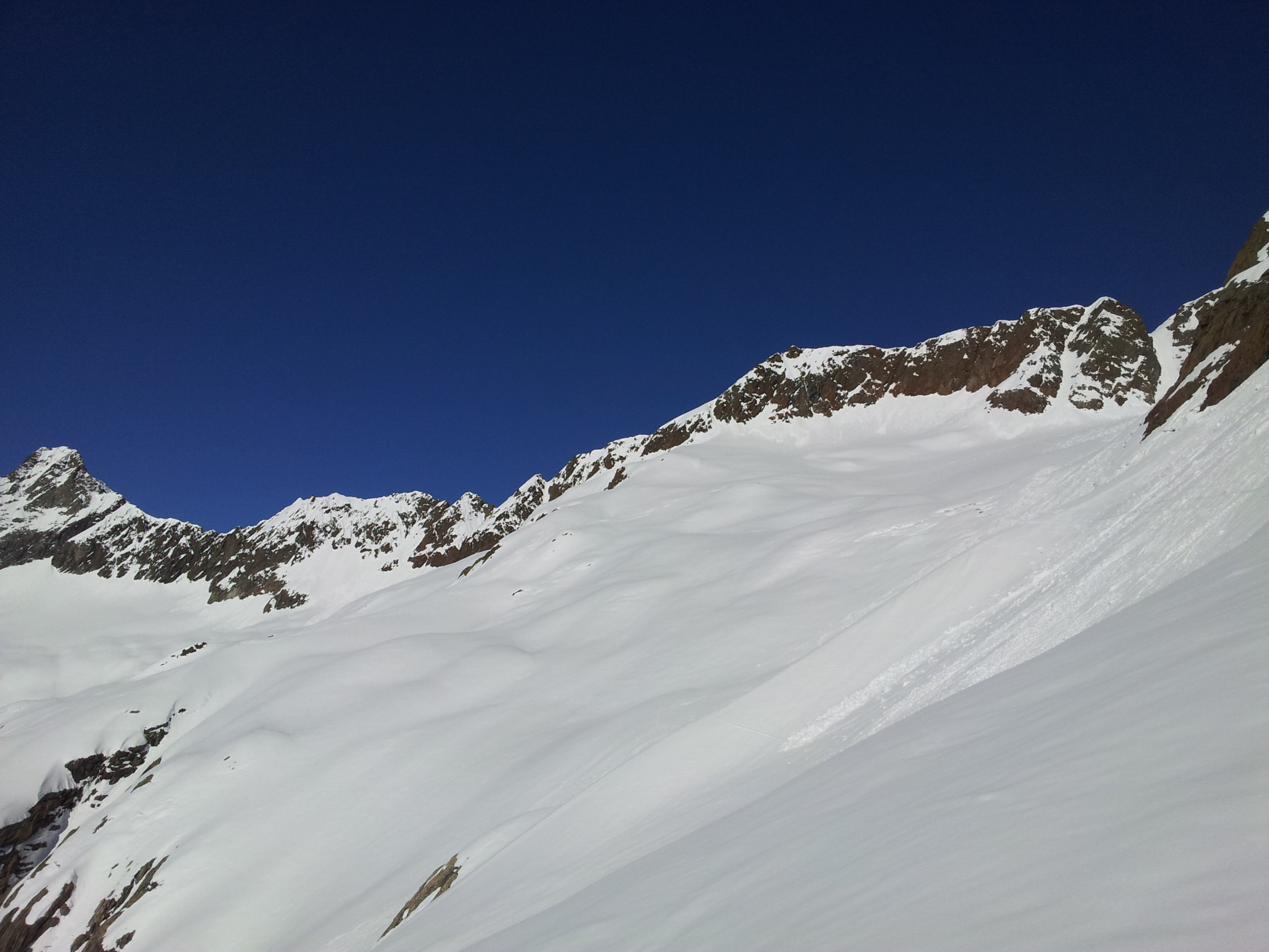 Das untere Couloir geht gut mit Ski und Harscheisen, das obere zum Gipfelgrat zu Fuss ohne Steigeisen in gutem Trittschnee. Abgefahren nach halb 12, im oberen Couloir schön aufgesulzt, zum Abrutschen ideal... im Südhang einige Fischmäuler, aber um diese Zeit sichere Verhältnisse, im unteren Couloir leicht faul, wie auch im Zielhang, aber es fährt sich leichter so durch diese verfahrenen Hänge als wenns pickelhart wäre. Dazwischen super Hänge mit feinstem Sulz. Halbe bis eine Stunde früher runter wär eher besser.