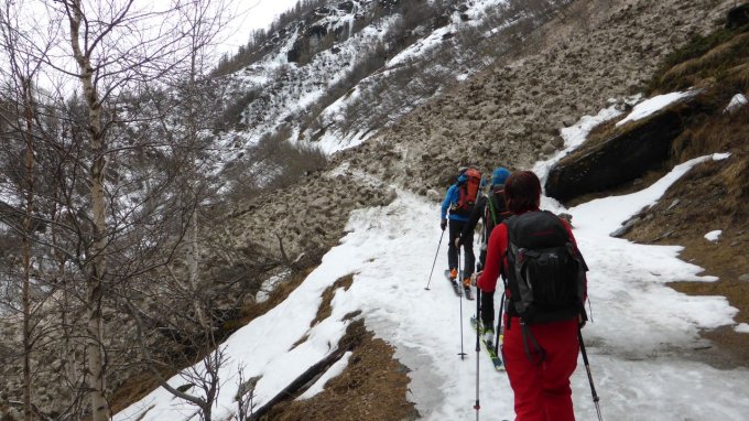 1. Tag: Quasi ab dem Parkplatz konnten wir auf Schi gehen. Zwischendurch gab es Tragepassagen über den Kegel einer großen Grundlawine und im Aufstieg bei Le Chiesso. Das trübe Wetter wurde mit zunehmender Höhe freundlicher und eröffnete einem zusehens grandiose Blicke in die mächtige Bergwelt. Der prächtige Sonnenuntergang ließ auf einen schönen Gipfeltag hoffen.