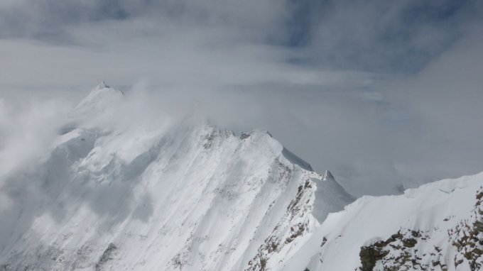 2. Tag: Der anfänglich noch klare Morgen wurde trüber und es gab leichten Schneefall. Wind und Kälte machten sich vor allem auf dem breiten Rücken tw. unangenehm bemerkbar. Gelegentliche Aufhellungen ließen hoffen ... Auf dem Gletscher waren kaum Spalten zu sehen; bereits Abfahrende fuhren unangeseilt ab. Auf dem Gipfel hatten wir noch etwas Nebel, der sich bereits im Abstieg zum Schidepot lichtete.