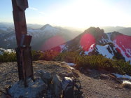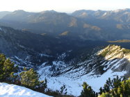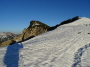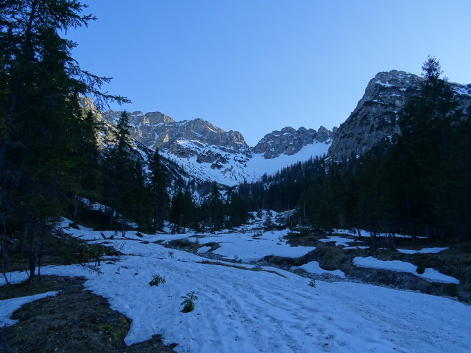 Feierabendtour ins Schinderkar: von Sutten bis zum Parkplatz kurz vor der Valepp für das Schinderkar ist die Straße frei; von da Start um 18h mit dem Radl soweit es geht; dann noch ein wenig Ski tragen bis auf 1050m; von da mit Ski zuerst auf Schneeflecken im Sulz, dann durch eine Latschenzone durch ein wenig ausgeprägtes Rinnensystem; darüber nach rechts ins Kar queren und dann auf griffigen Schnee zum Schindertor (der Schnee hatte bereits begonnen, wieder durchzufrieren, jedoch war es noch nicht gänzlich soweit, daher ohne Harscheisen problemlos hinauf gekommen); hier Skidepot, zu Fuß durch das Tor und zur Scharte, zuletzt auf meist aperen Weg zum österr. Schinder Gipfel (19.30h); wunderbare Ausicht und Abendstimmung! Abfahrt sehr gut, zuletzt halt Slalom durch die Latschen; habe die Stirnlampe gar nicht gebraucht;