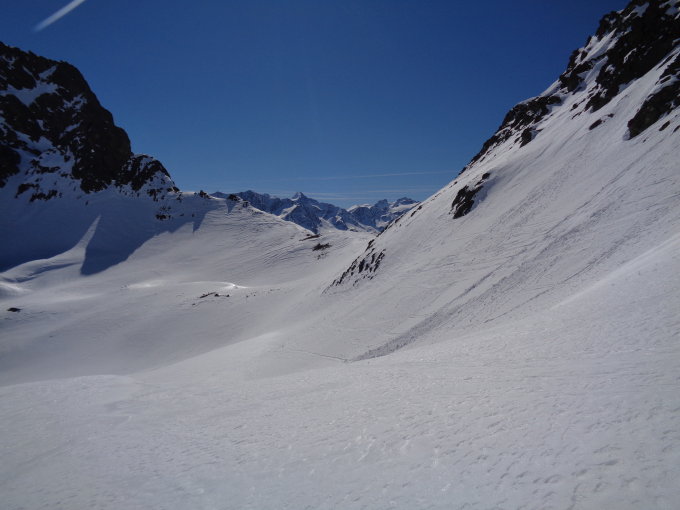 Um 8.30 bei La Veduta los, Schneedecke war pickelhart, Harscheisen von Vorteil. Abfahrt zum Leg Grevasalvas ohne Fell, dafür mit Schuss über den sehr gut gefrorenen See. Dann wieder angefellt. Gipfelhang mit seiner Ost-Exposition war gegen 10.00 schon schön aufgesulzt, aber sehr gut tragend. Abfahrt von oben bis fast unten ein Genuss in Buttersulz...
