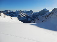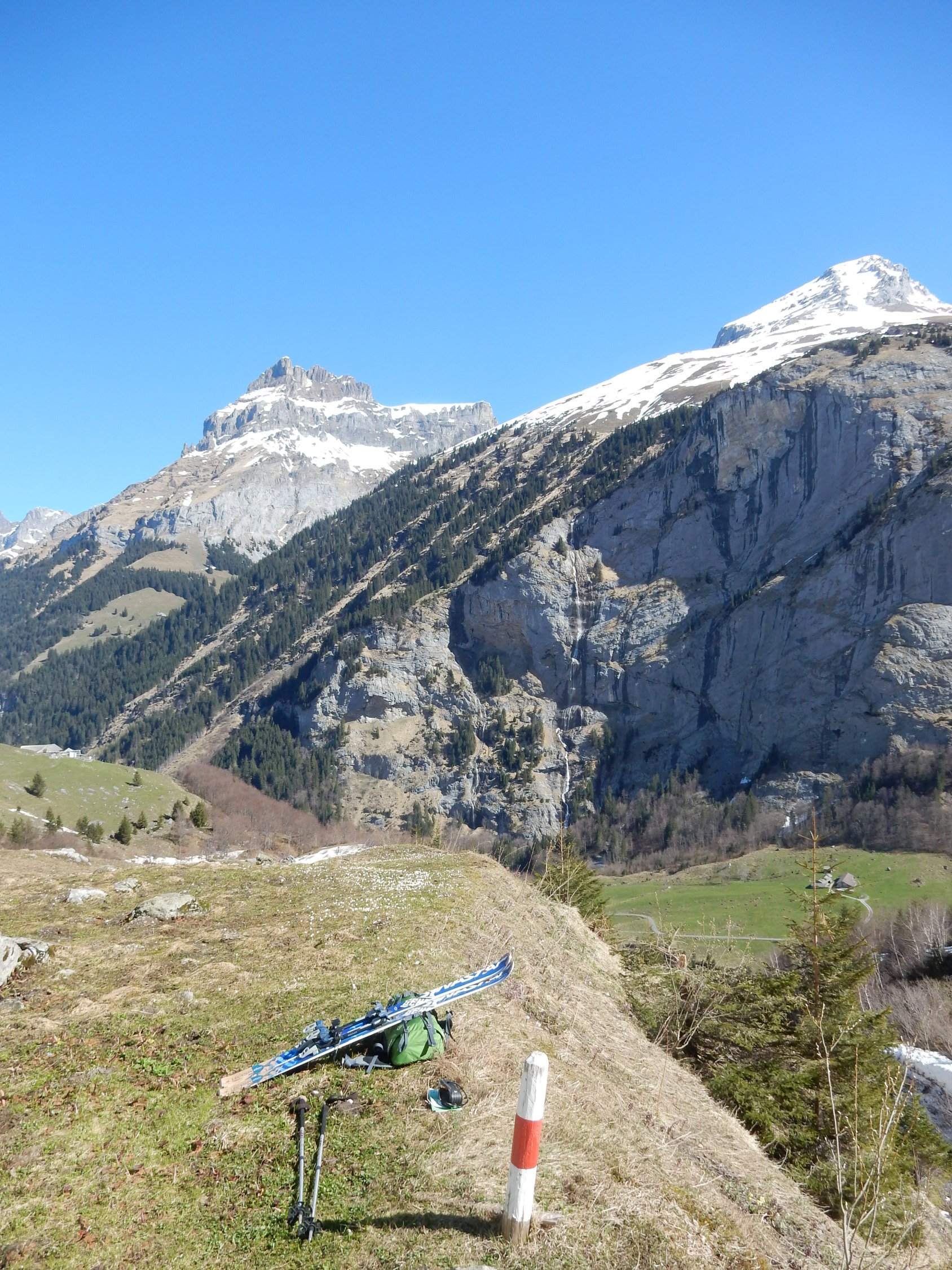 Start gegen 5:00 Uhr. Durchgehend Schnee ab Firnälpli, in den Rinnen z.T. riesige Nassschneelawinenkegel bis runter an die Aa. Unterlage wird nach oben rasch dicker, dann kann praktisch überall aufgestiegen werden. Ganz oben unterm Grassengipfel hat es sogar noch einen Hauch von Pulver.