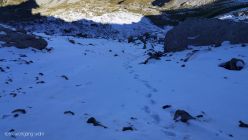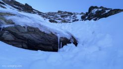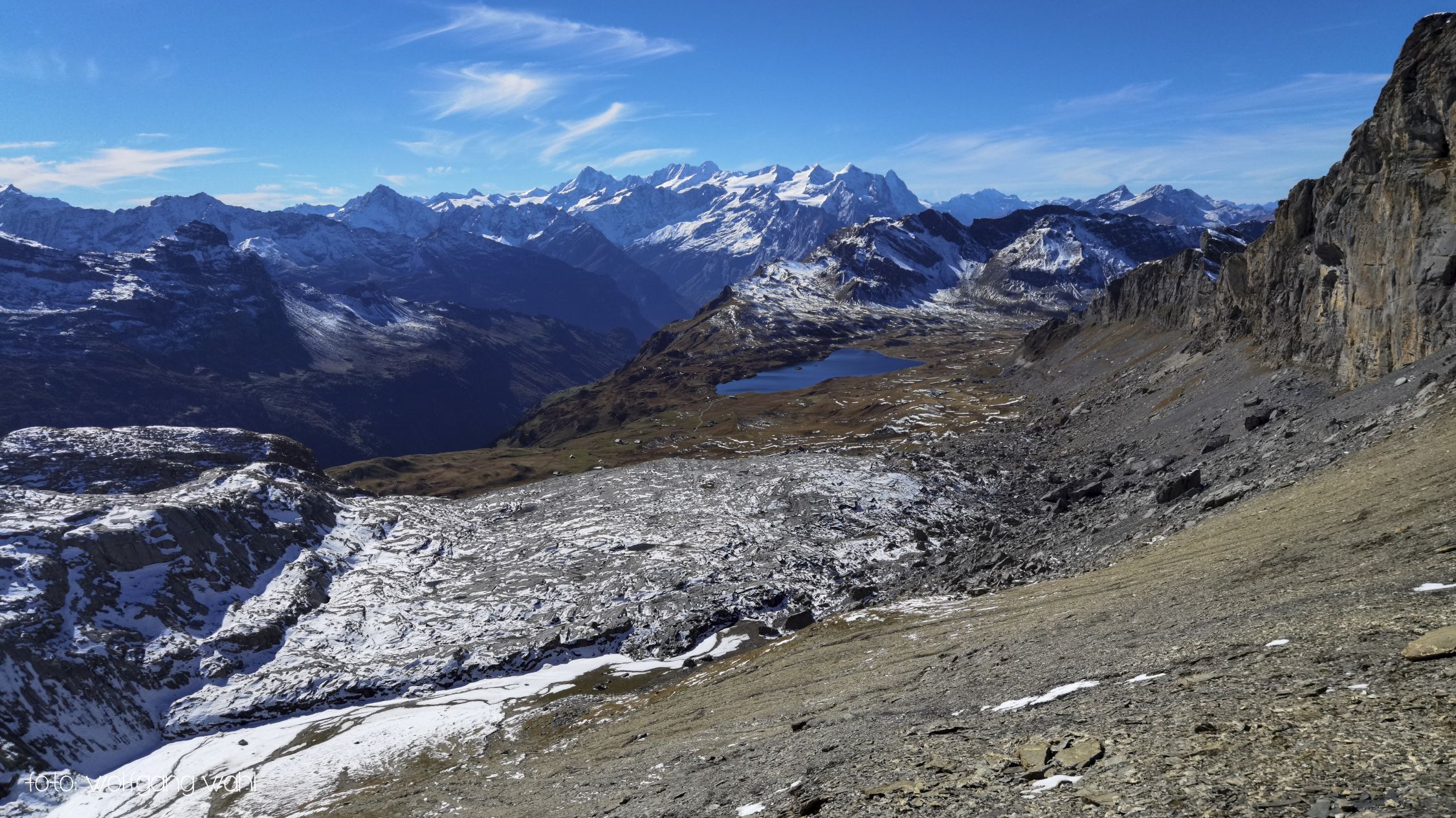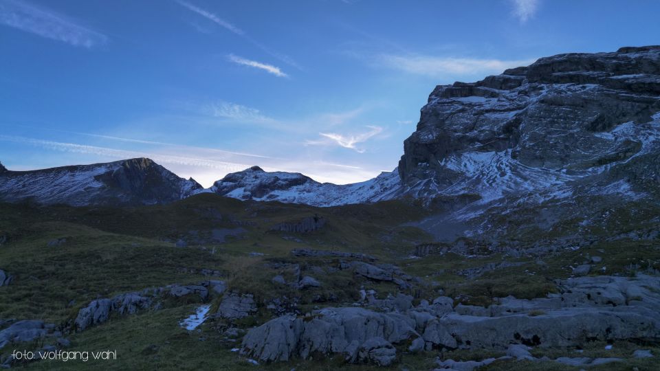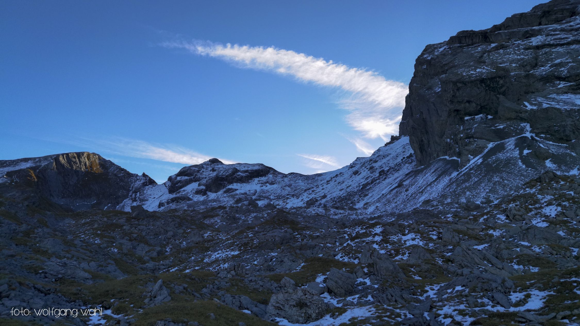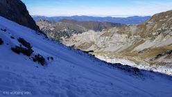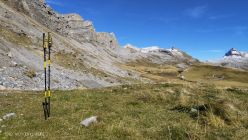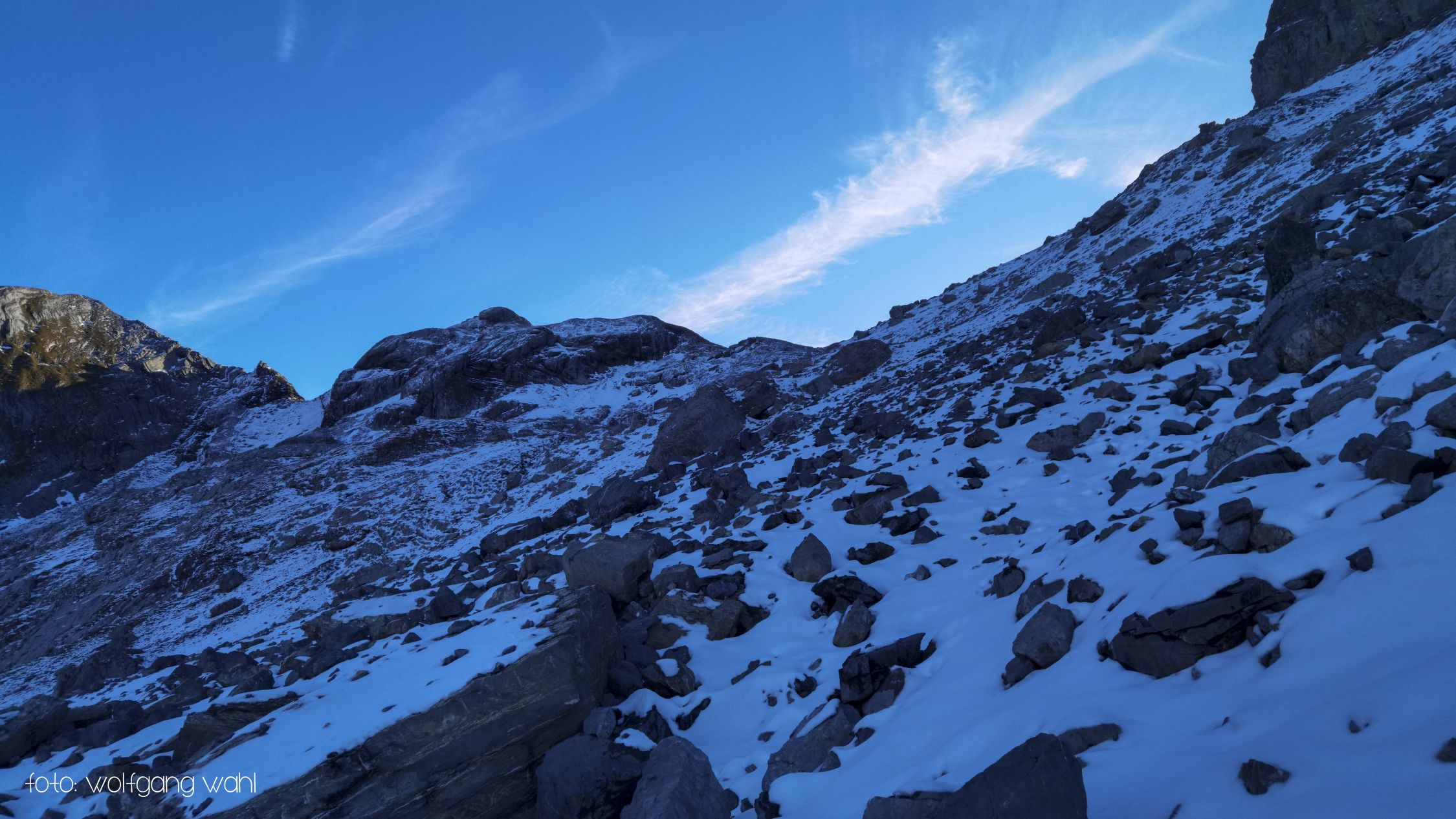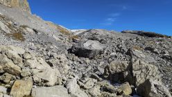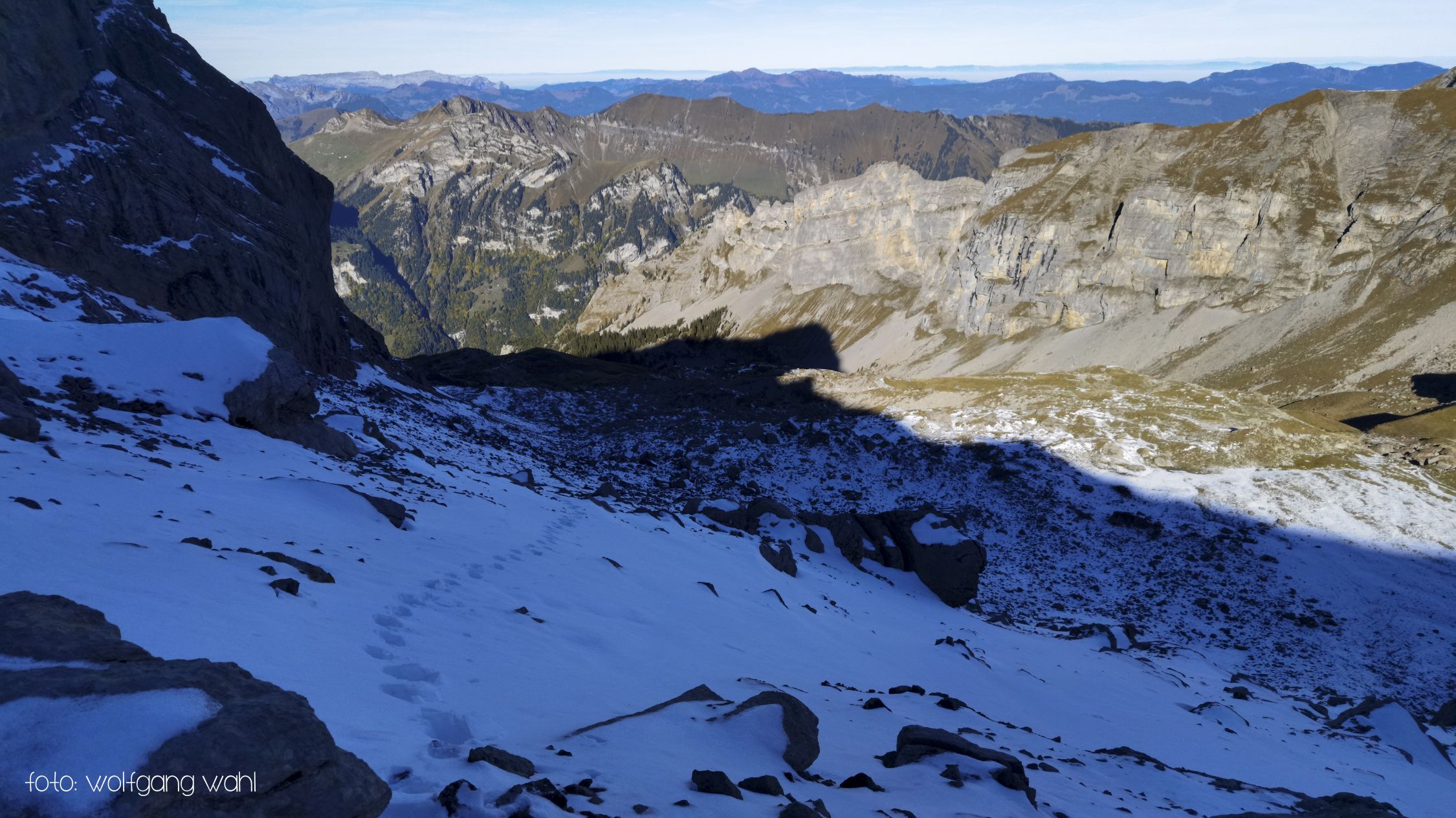 Wieder zurück bei P2535 geht man auf dem Grat erst in gutem Trittschnee, dann auf Schiefer und über einen Felskopf aus Schiefer, welcher überklettert werden muss, richtung Tannenrotisand. Der Schiefer ist sehr instabil und rutschig, weshalb man exakt auf dem schmalen Grat gehen sollte, was mit Hilfe von Stöcken zur Stabilisierung gut zu bewältigen ist. Sobald die Südflanke im Schieferbruch gehbar ist, steigt man vom Grat ab und quert leicht absteigend hinüber zum Blockgelände unter dem Barglen. Die gesamte Südflanke ist schneefrei und trocken. Nun sucht man sich einen Weg durch das Blockgelände, stetig absteigend, bis man auf 2’130m auf den markierten Weg zum Chringen auf 2’152m trifft. Ab Chringen folgt man erst dem Wegweiser richtung Stöckalp bis Ober-Stafel, dann der Skipiste über Cheselenfirst und Cheselenhütte zu P1276. Dort trifft man auf den Wanderweg, welcher von Melchsee-Frutt nach Stöckalp, zurück zum Parkplatz führt. Das Gelände über die Skipisten ist teils steil aber trocken und gut gehbar. 19.5 Km, Gesamtanstieg 1’744 Höhenmeter, Gehzeit ohne Pausen 9.5 Std.