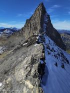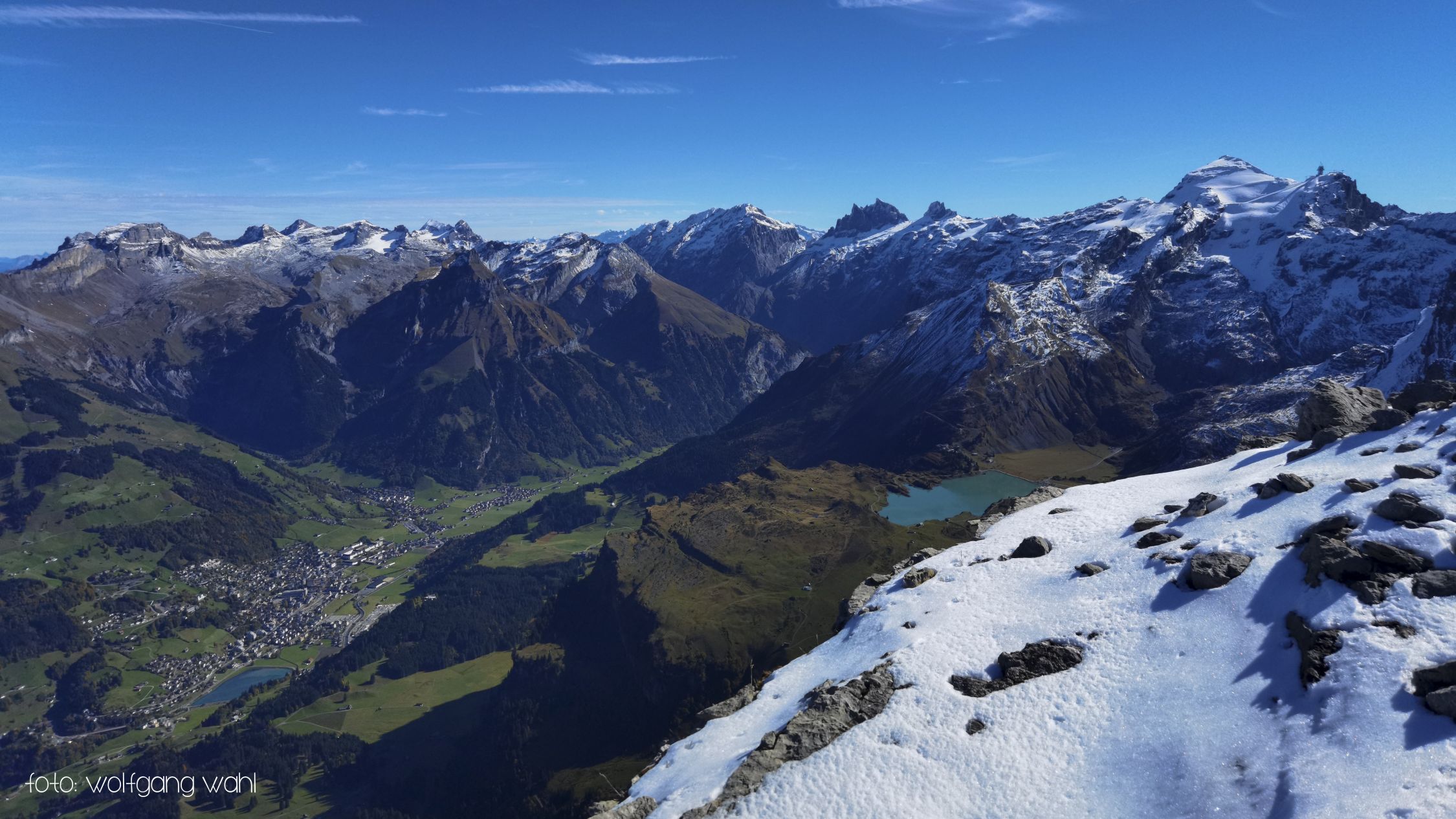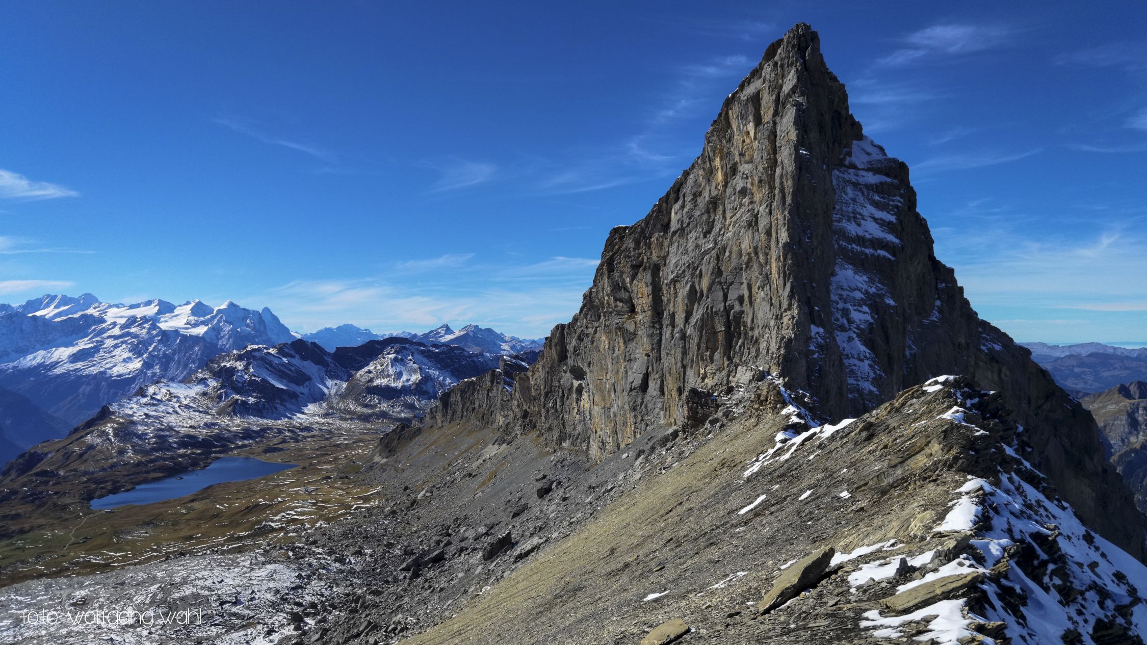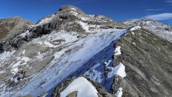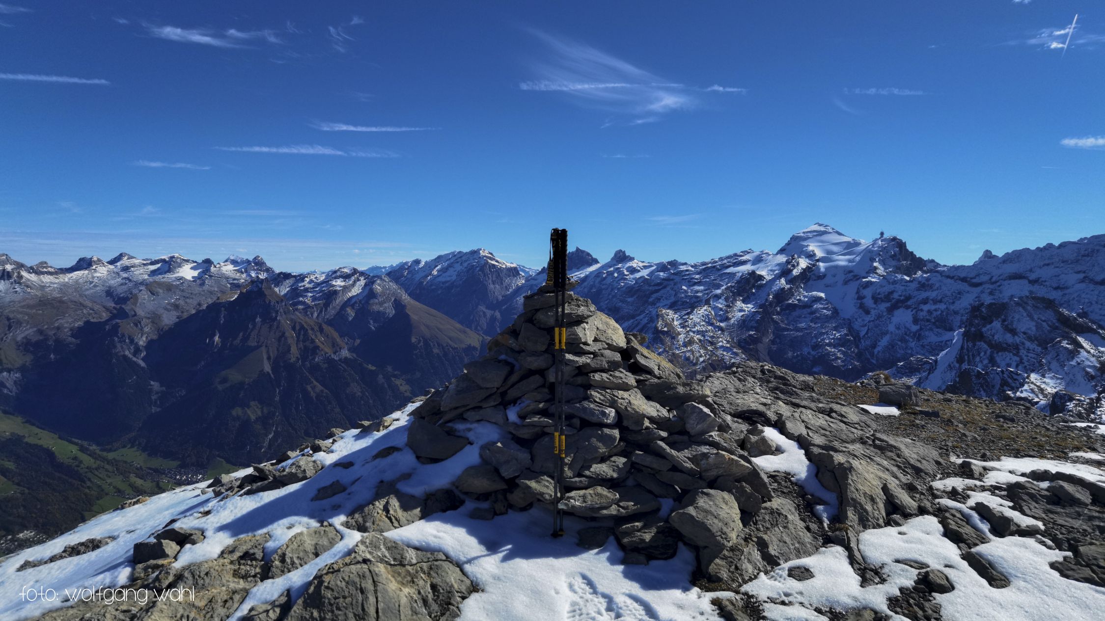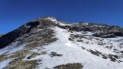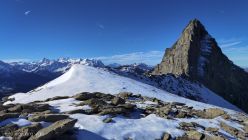 Ab dem Sattel bei P2535 geht es dann weiter weglos ohne Markierungen, teils über gut gehbare Schneefelder, hoch zum Gipfel des Rotsandnollen auf 2’700m, wo sich eine unglaubliche Aussicht auf Engelberg und die umliegenden Berge bietet.