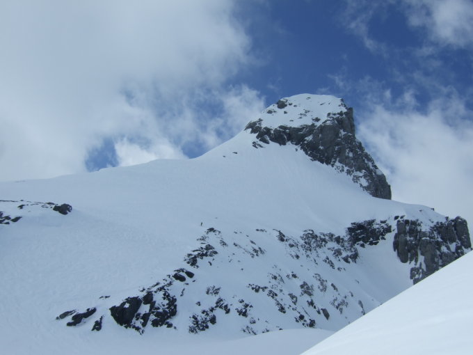 Gipfelaufstieg noch im Trittschnee möglich. Schnee aber schon dünn und teilweise kommen die Felsen durch, was bei Erwärmung dann gefährlich wird. Um 12Uhr aber noch hart, dank gelegentlicher Wolken.