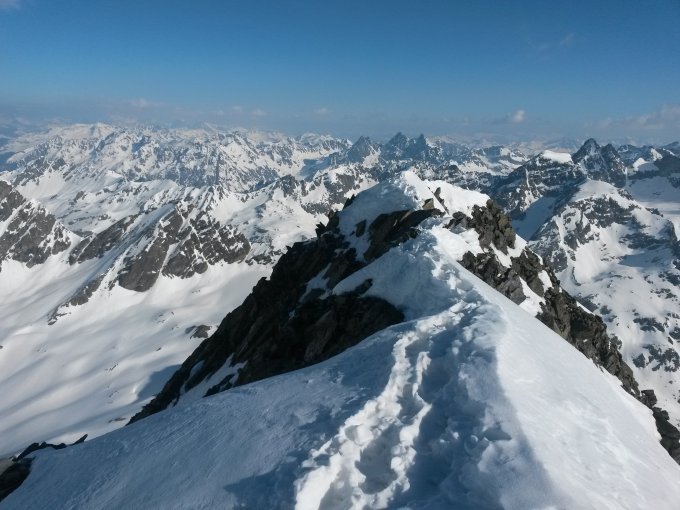 Schnee ab Cham. Linard. Vorher zwei eklige Firnfelder auf dem Hüttenweg. Anschliessend toller völlig glatter Firn bis zum Einstieg in die Südflanke. Ab da bis fast zum Gipfel praktisch die ganze Route Lawinenschnee. Zum Aufsteigen zu Fuss super, zum Abfahren lohnt sichs wirklich nicht. Es gäbe nur wenige Ausweichsmöglichkeiten beim Abfahren, und diese sind alle sehr steil und exponiert.