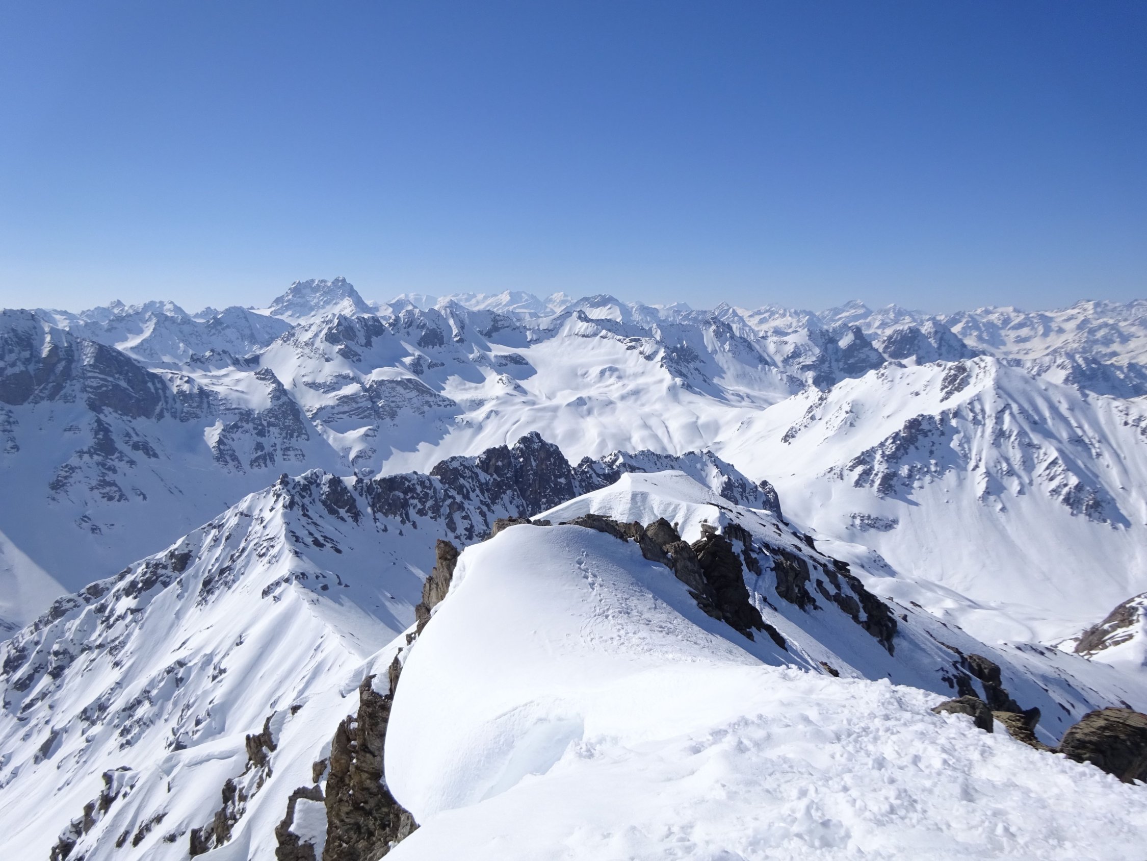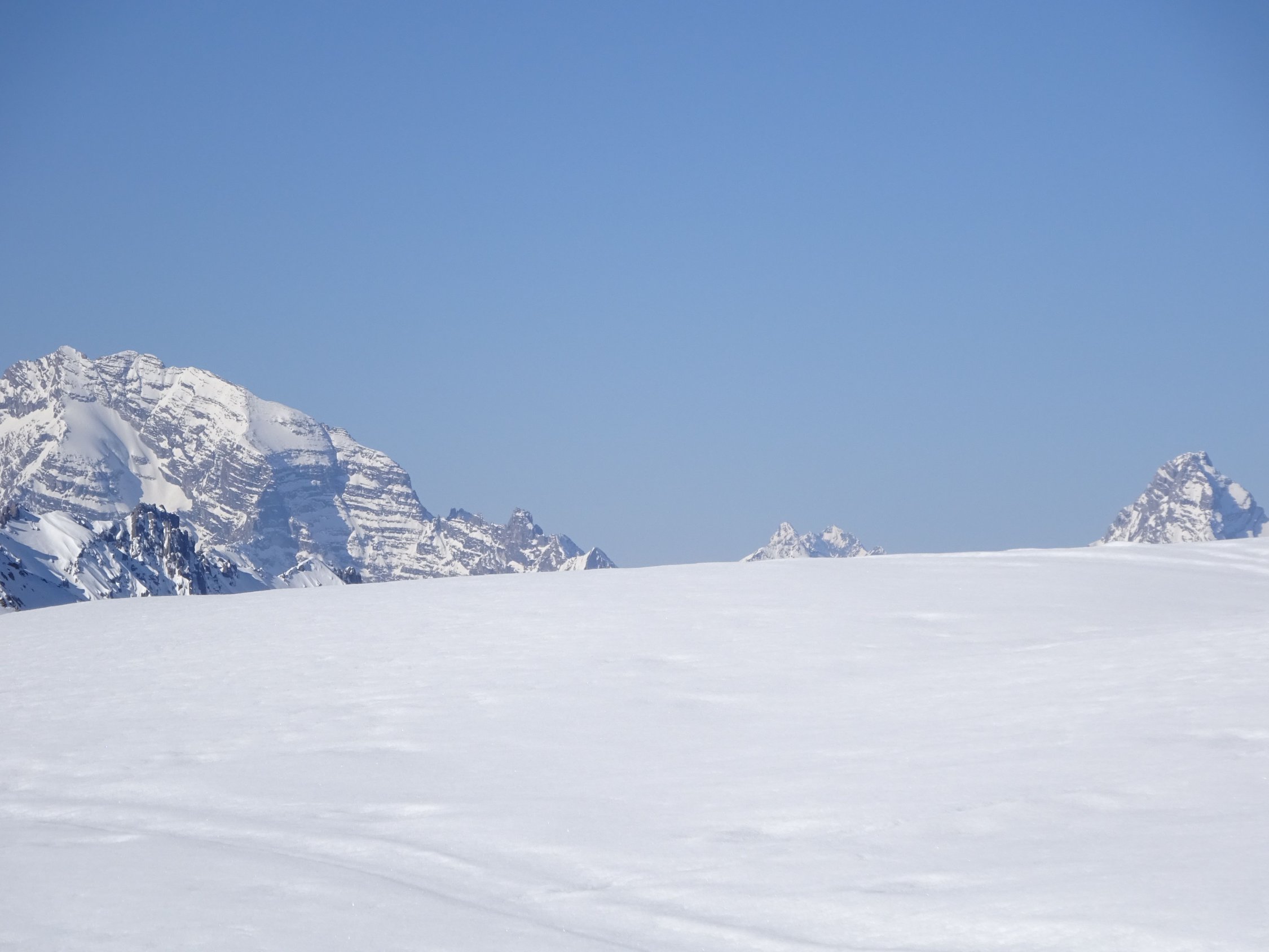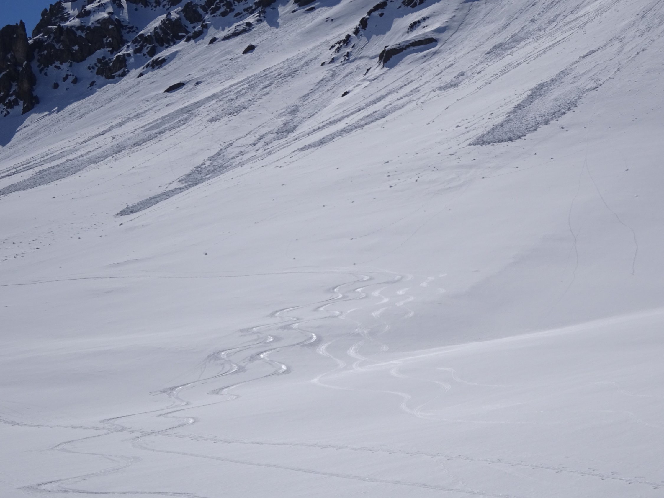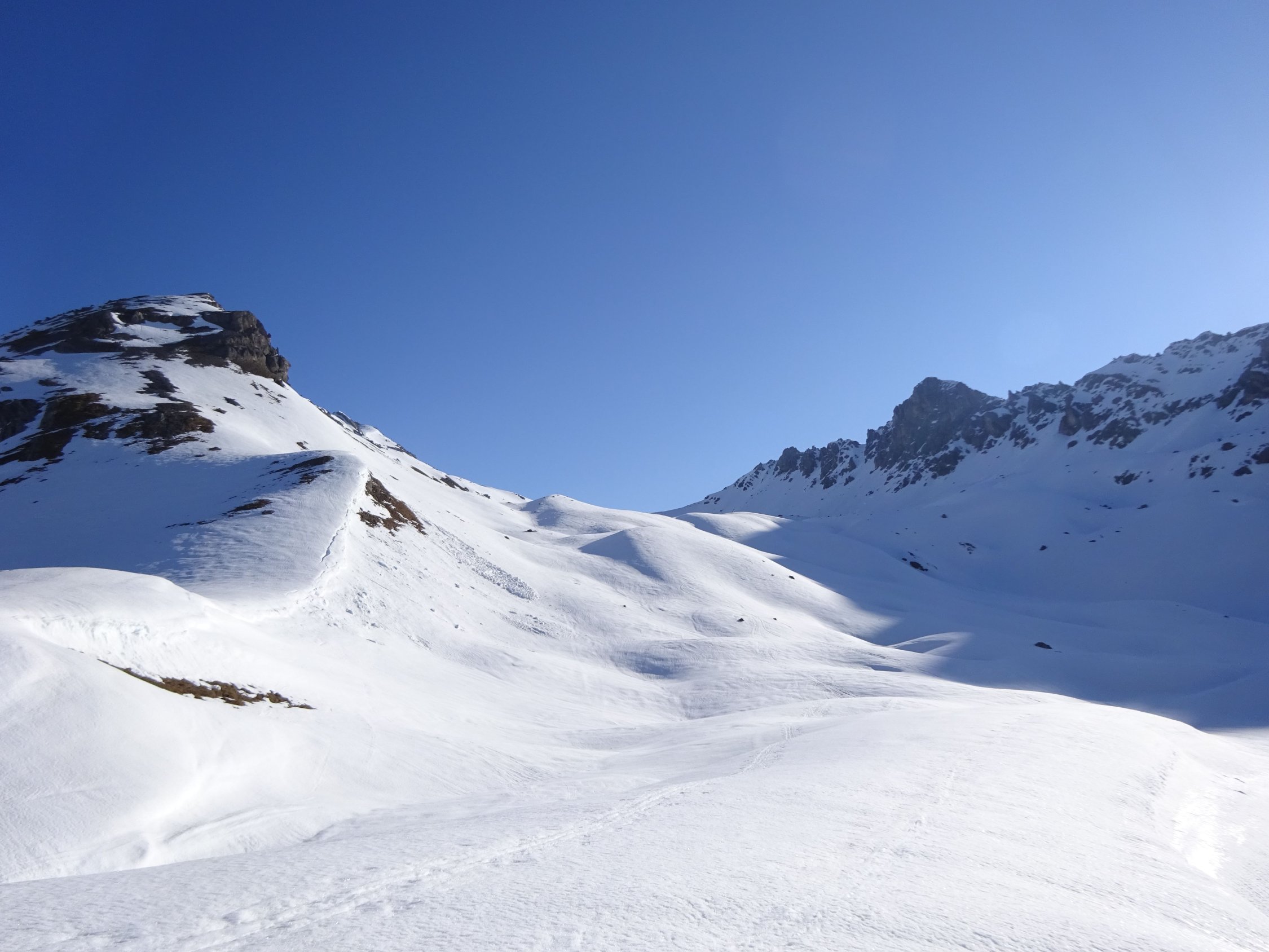 Es ist sehr ruhig im Gebiet; ich habe gerade einmal zwei Türeler am Gletscherducan gesehen. In den tieferen Lagen geht der Schnee schnell zurück, aber man kann die Skier noch bei der Oberalp (1913 m) anschnallen. Nach der Brücke unterhalb Fanezmeder gibt es dann eine geschlossene Schneedecke, die im Aufstieg schön tragfähig war und bei der Abfahrt um etwa 11 Uhr Sulz vom Feinsten bot, vor allem süd- und ostseitig. Ich habe für die Abfahrt ebenfalls das Bärentäli gewählt und bin damit wahrscheinlich gut gefahren. Das Restaurant in Monstein war offen; Rösti, Kuchen oder Monsteiner Bier nicht verpassen!