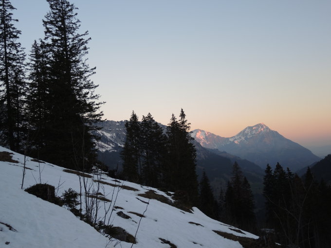 Sulzschnee, in den Ost und Südhängen rasch zu weich, flachere Stellen und Schattseiten noch länger gut. Oberhalb 2400m ist der Schnee noch nicht durchgehend umgewandelt.
