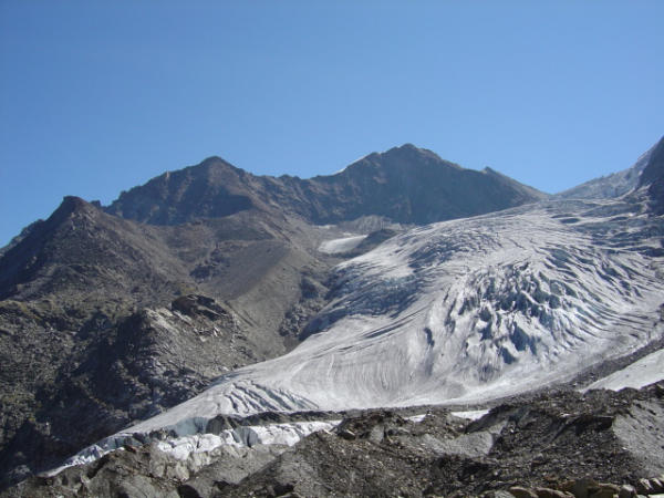 Problemlose Gletscherquerung auf ca. 2770 m (gut markiert). Von der Bordierhütte zum Gipfel durchgehende Wegspur mit Steinmännern. Für den Weiterweg zum Balfrin (L) sind z.Z. Steigeisen/Pickel nötig.