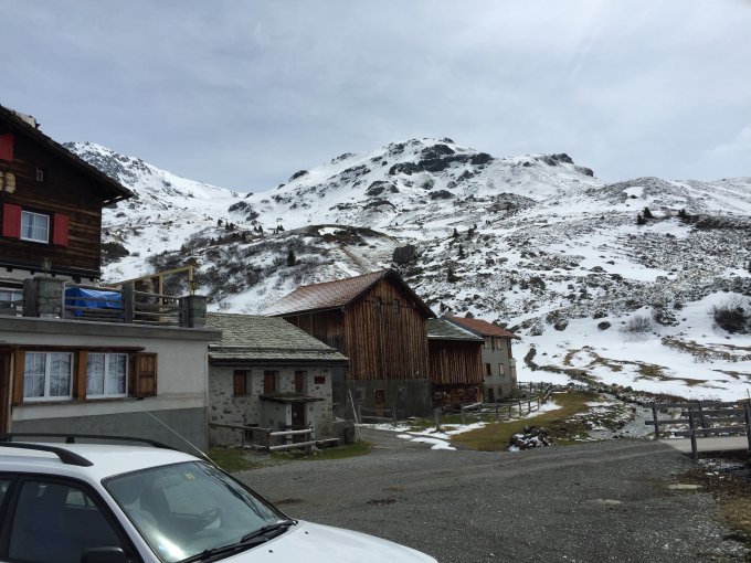 Allgemein schon recht wenig Schnee auf der Alp Flix (siehe Bild). Skis konnten heute gerade noch dort angezogen werden. Auf der orographisch linke Seite vom Bach mehr Schnee und besser zum Abfahren. Ging fast bis zum Auto zurück.