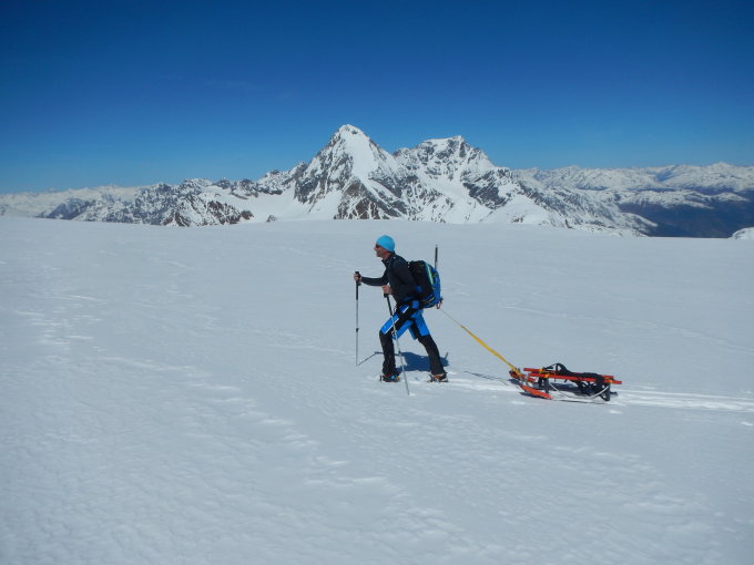 Aufstieg mit Schneeschuhen und Abfahrt mit FreeRide ALPIN Schlitten. Begleitung Bergführer Robert Kofler, Passeiertal.
