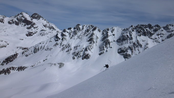 Start schnee ab parkplatz , traverse ab etwa 2500m.u.m. mit gross lawiner , dann starker SW wind bis unten gipfel, direkt abfahrt N Culuoir