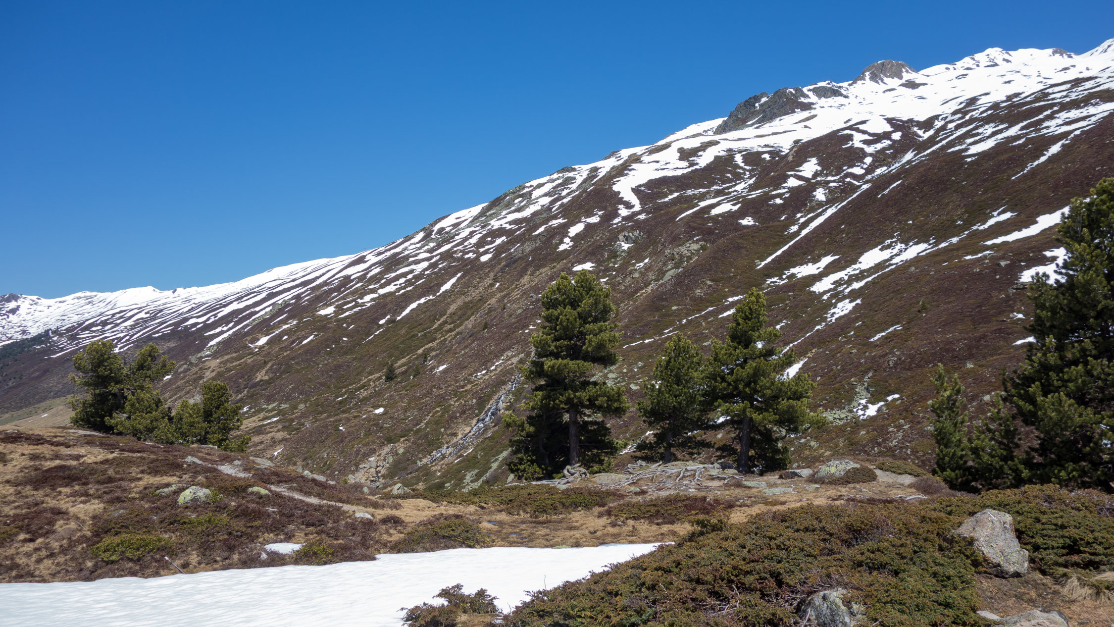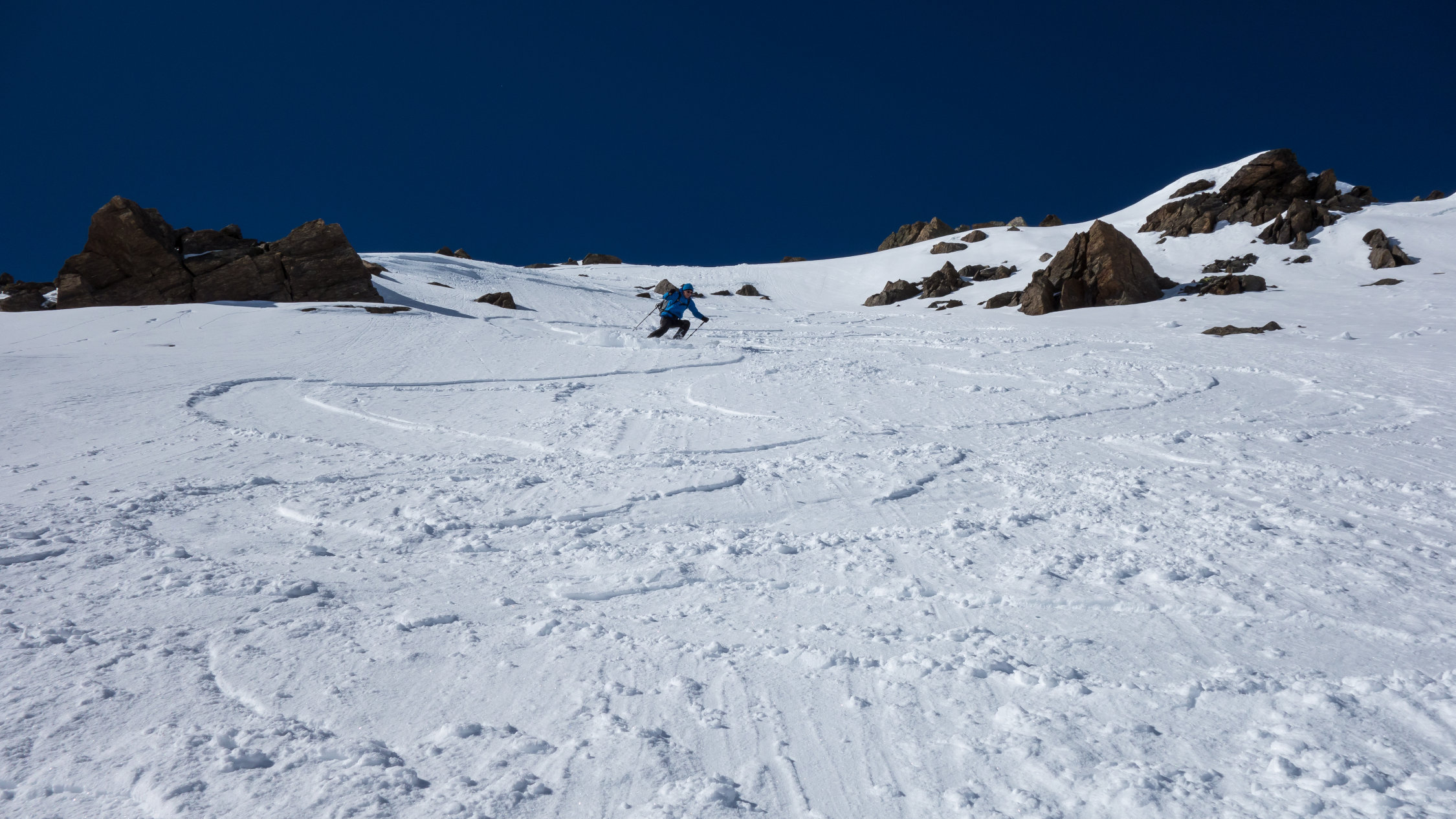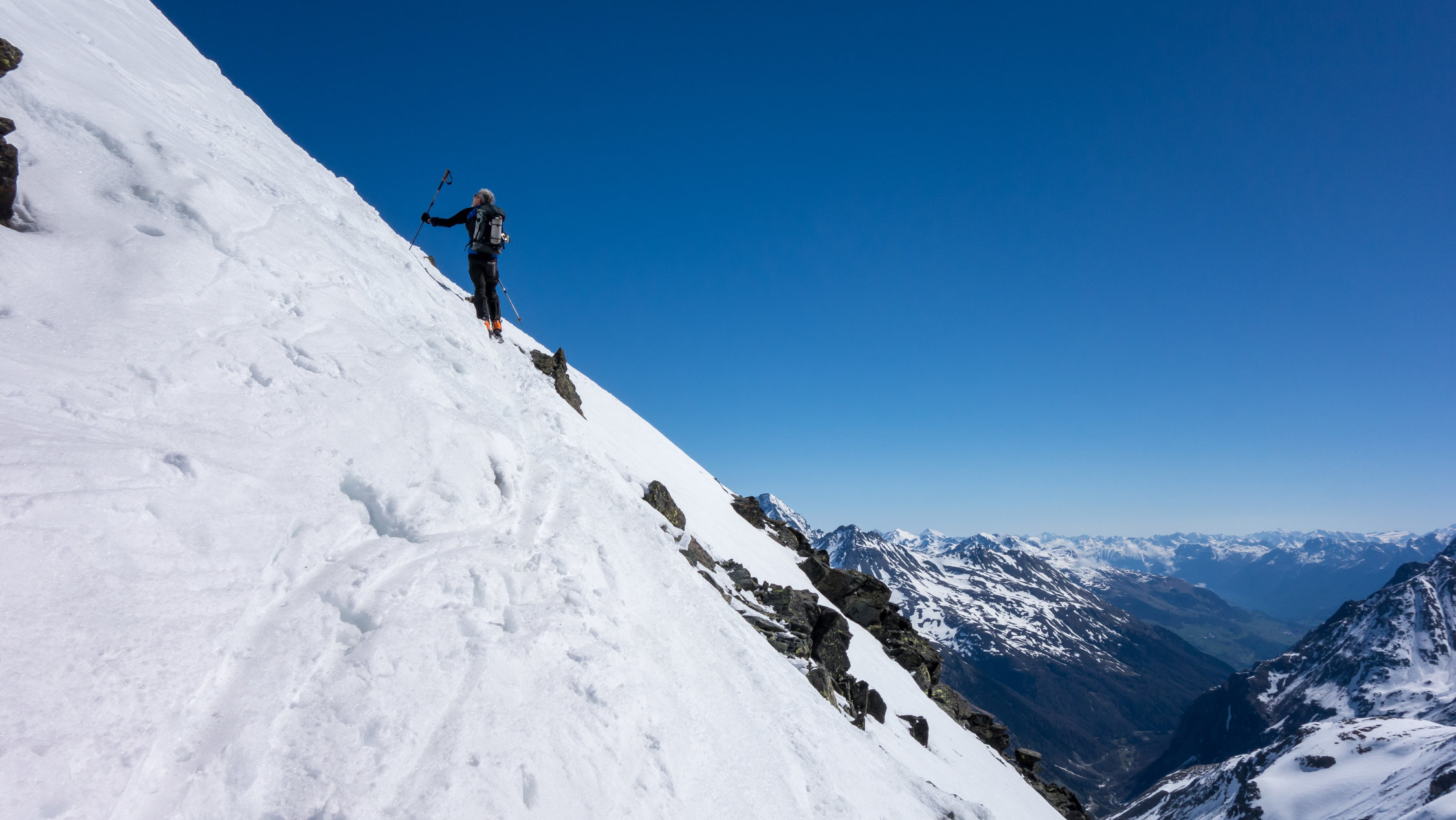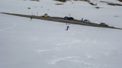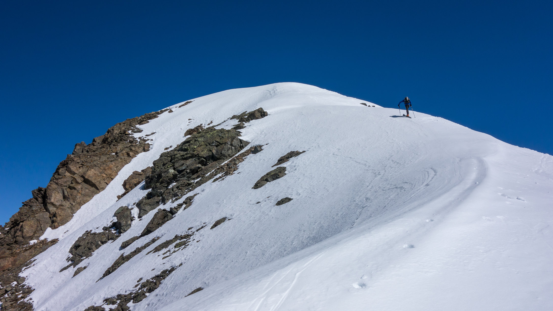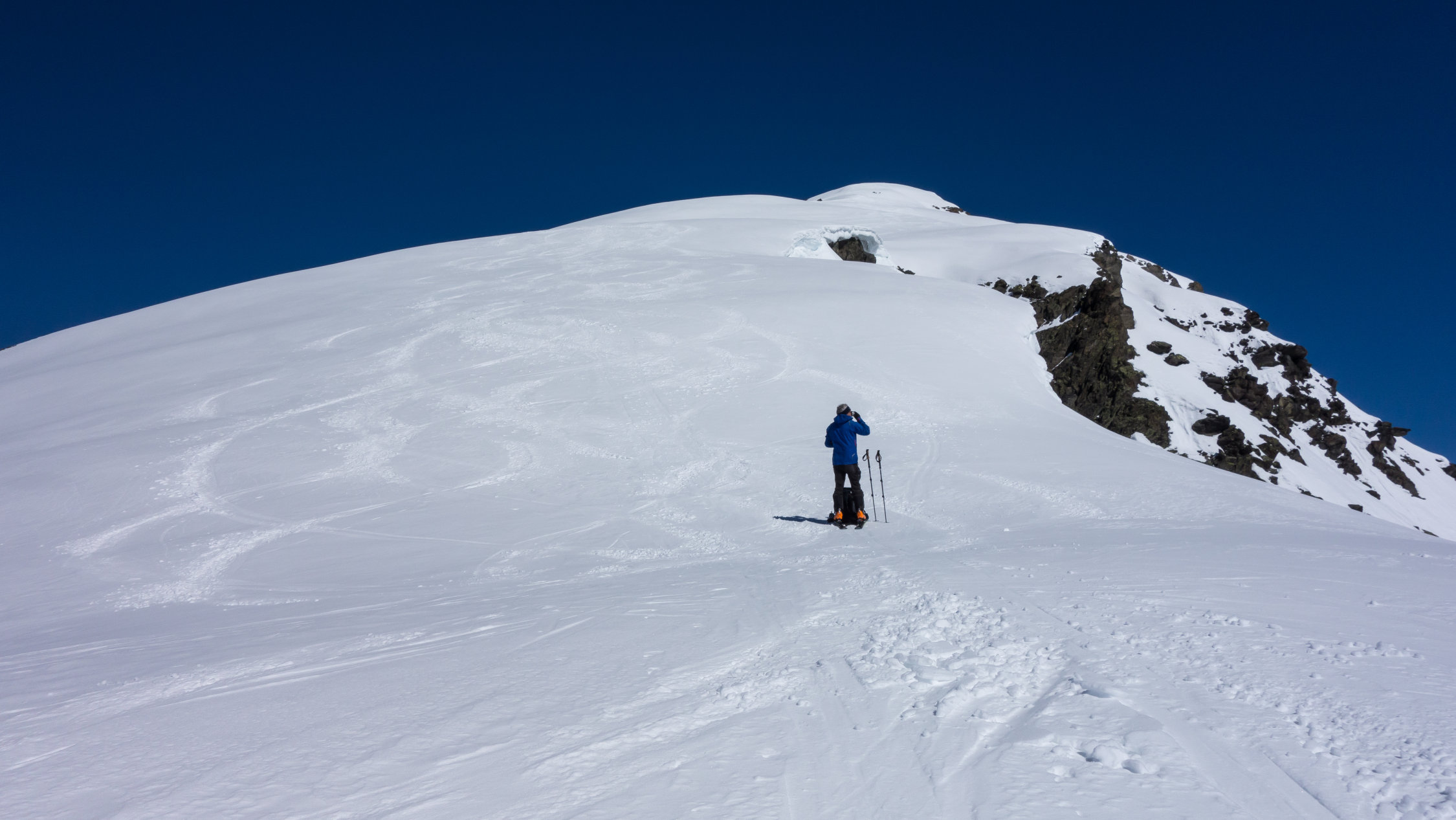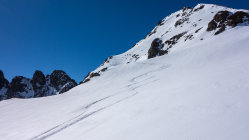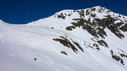 Wieder anfellen und Aufstieg zum Schwarzhorn. Die steile Schlüsselstelle vor dem Einstieg in den breiten Gipfelhang war heute problemlos, da noch relativ viel Schnee liegt. Allerdings brach auch hier der Schnee teilweise ein. Abfahrt um 11 Uhr vom Schwarzhorngipfel. Am langen Gipfelhang herrschen perfekte Schneeverhältnisse wie selten zu dieser Jahreszeit. Ausser an einigen Steilhängen war die Schneedecke noch tragend bis hinunter zum Parkplatz.