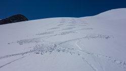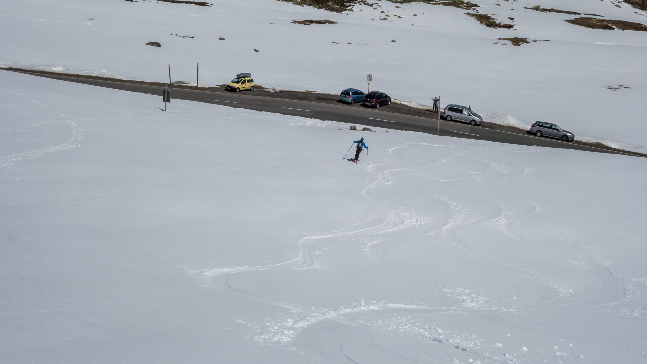 Es hat noch viel Schnee am Flüelapass. Die Tour ist noch lange machbar; es braucht noch ein paar kalte Nächte, sodass die Schneedecke auch in tieferen Schichten wieder gefriert. Nach den Regenfällen ist die Schneedecke momentan durchfeuchtet bis auf den Grund. Das war heute vor allem an Steilhängen bemerkbar.