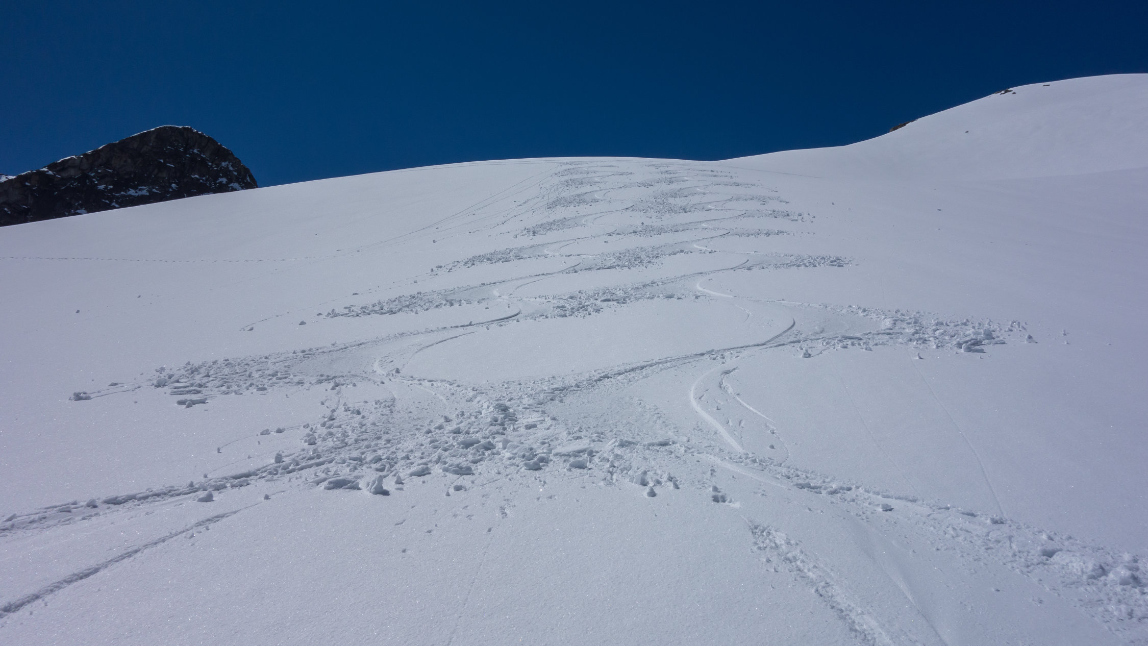 Die Hänge Richtung Gorihorn sind unten aper. Flüela Wisshorn ist noch gut machbar. Auf den schönen Abfahrtshängen vom Scalettahorn sind in den letzten Tagen überall Lawinen abgegangen, sodass sich diese Hänge wohl nicht mehr gut als Abfahrt eignen (siehe Foto). Piz Sarsura sah noch sehr gut aus.