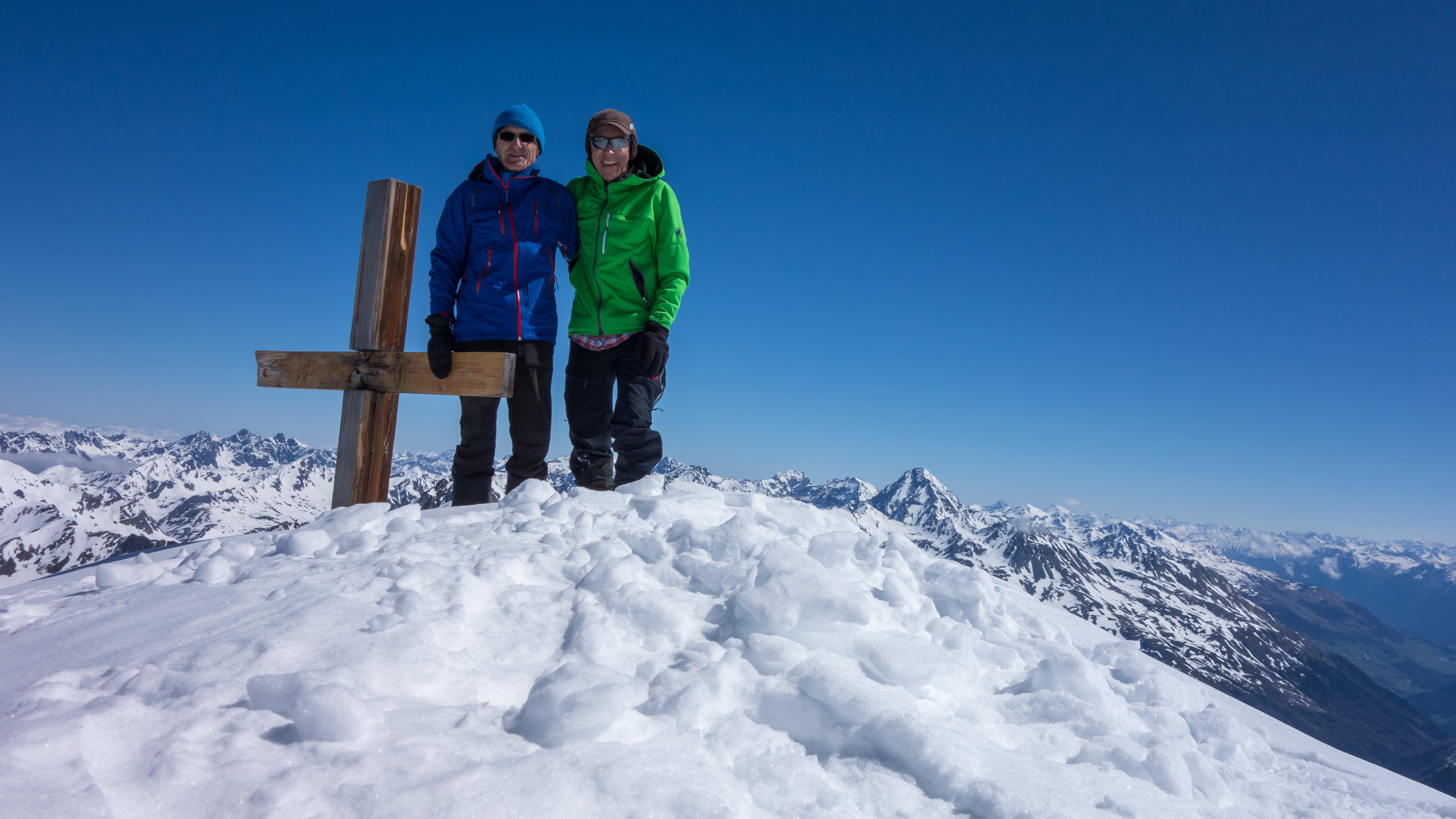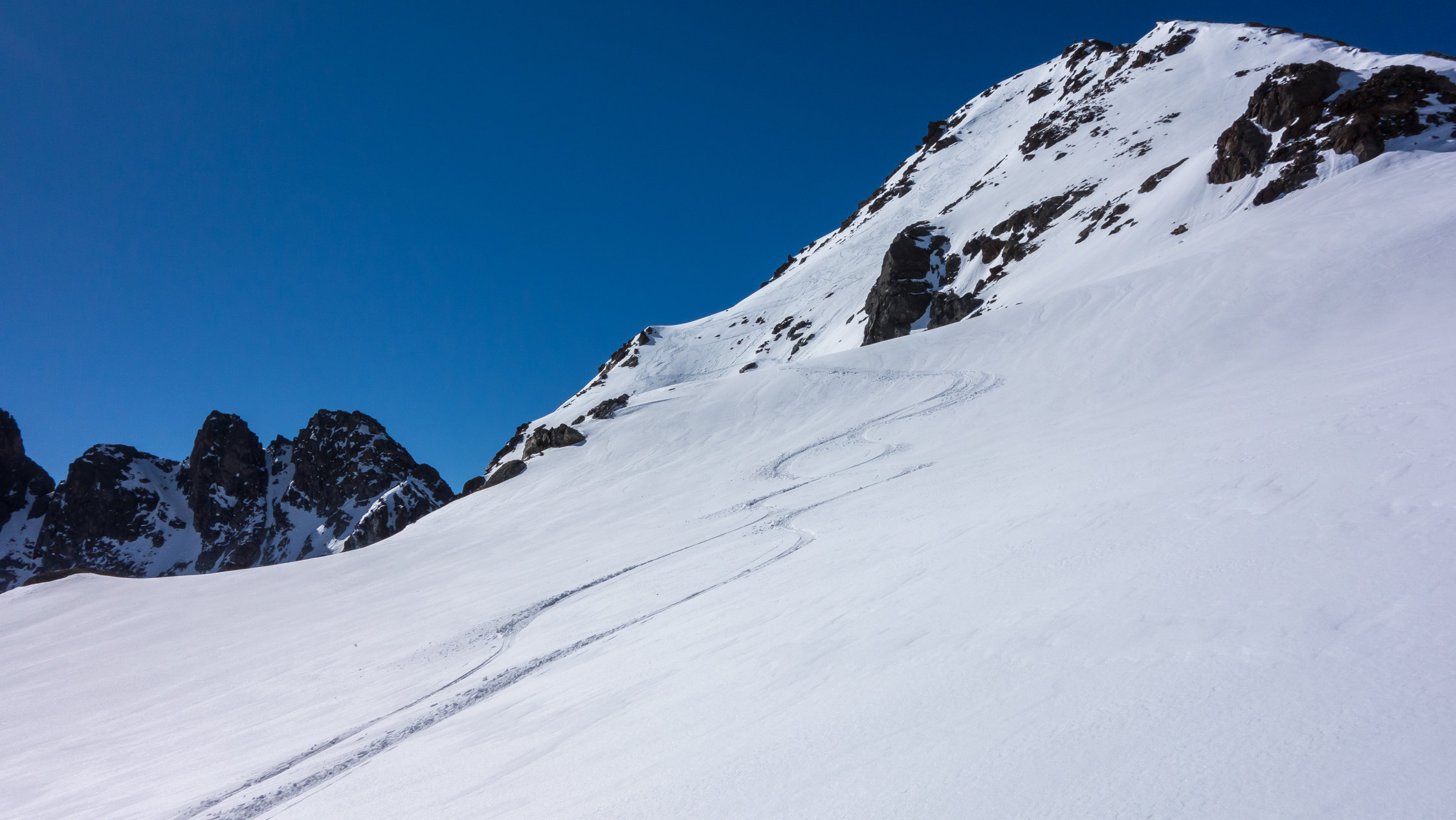 Schöner Aufstieg zum Radüner Rothorn und direkte Abfahrt vom Gipfel über den steilen Nordosthang. Der Steilhang war heute etwas heikel, da die Schneedecke teilweise einbrach bis auf den Grund.