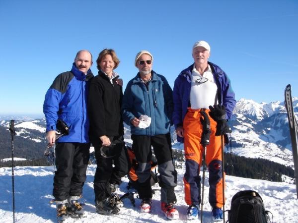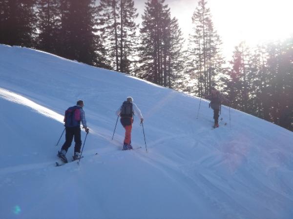 Traumhaftes Wetter. Schöner leichter Aufstieg. Wegen Superhängen vom Grat stiebende Abfahrt und Wiederaufstieg bis Gipfel.