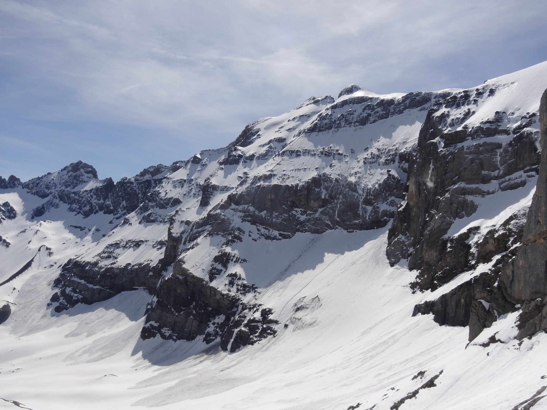 Nach kälteren Nächten könnte die Wand jedoch recht gute Verhältnisse aufweisen. Aufgrund von mehreren, tiefen Rinnen im Zustiegshang müssen die Skis etwas früher gebuckelt werden als normal. Das erste Couloir ist noch gut mit Schnee gefüllt. Die Traverse hat für die Jahreszeit eher wenig Schnee, sollte aber momentan nach kalten Nächten noch gut zu gehen sein.
