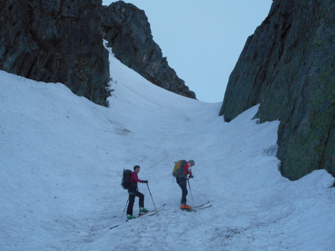 Die letzten 300 Hoehenmeter die Skis hochgetragen durchs Ostcouloir. (40 - 45 Grad.) Hier weicher Trittschnee, d.h. 20 - 30cm eingesunken.