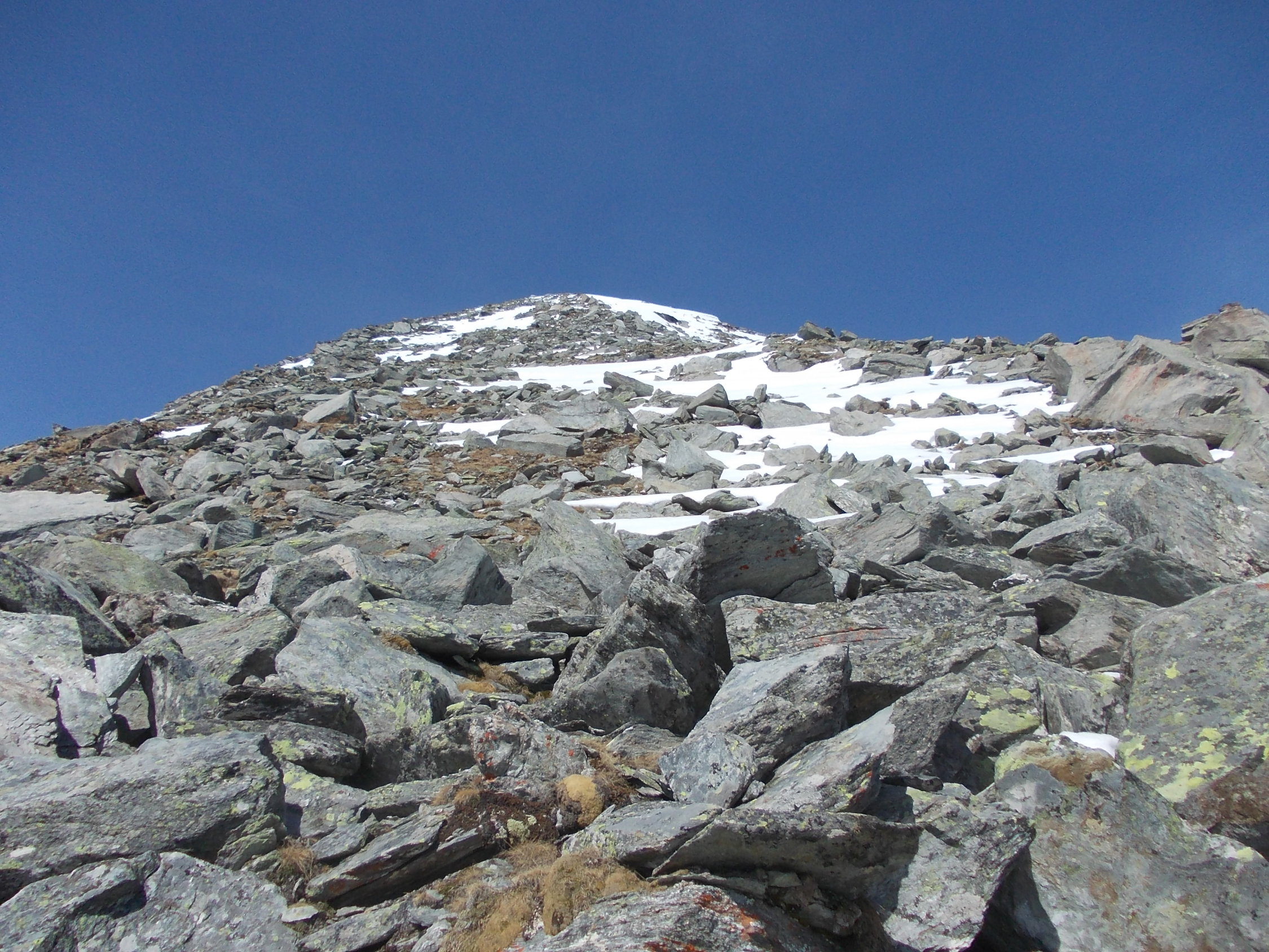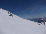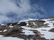 Aufgrund unserer verschiedenen Ausrüstungen gingen Stefan und ich heute getrennte Wege zum Gipfel. Während Stefan sich in der steilen Flanke mit seinen Skiern auf die Suche nach ausreichend Schnee begab, stieg ich über den derzeit schneearmen Ostgrat auf. Dabei setzte ich sporadisch auch die Schneeschuhe ein. Die Schneedecke, bzw. Schneeflecken erfuhren über Nacht keine Abstrahlung und waren von Beginn an butterweich. Mit Hilfe der Schneeschuhe überwand ich größere Schneefelder in den Blockfeldern und minderte zusätzlich die Verletzungsgefahr beim häufigen Absacken in Löcher zwischen den Felsen. Im Aufstieg war ich deutlich schneller, als Stefan. Dafür gewann er in der Abfahrt wiederum einen Zeitvorteil, trotz der für Skifahrer derzeit schlechten Verhältnissen an diesem Berg.Stefans Abfahrt erfolgte in etwa entlang der nördlichen Begrenzung des Ostgrates, wo noch einigermaßen Schnee vorhanden war.