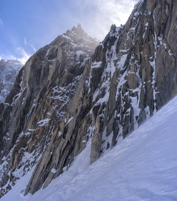 Die Gullies in der Tacul Ostflanke sahen immer noch gut aus, aber auch hier nur bei kälterem Wetter einsteigen. Tour Ronde sah ebenfalls gut aus.