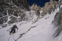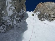 Insgesamt gute Verhältnisse: Immer wieder genug Eis zum Schrauben, auf den Schneefeldern dazwischen guter Trittfirn. Die Schlüsselstelle, der 20m-Eisfall, ist gut gewachsen und sehr schön zu klettern. Allerdings phuh - für Wi4 ist das Ding schon noch steil, auf 10m wirklich um die 90°, technisch deutlich anspruchsvoller als manche Wi5 in Chamonix. Vielleicht lag's aber zusätzlich auch an der Höhe, auf 4000m brennen die Arme schon schneller...