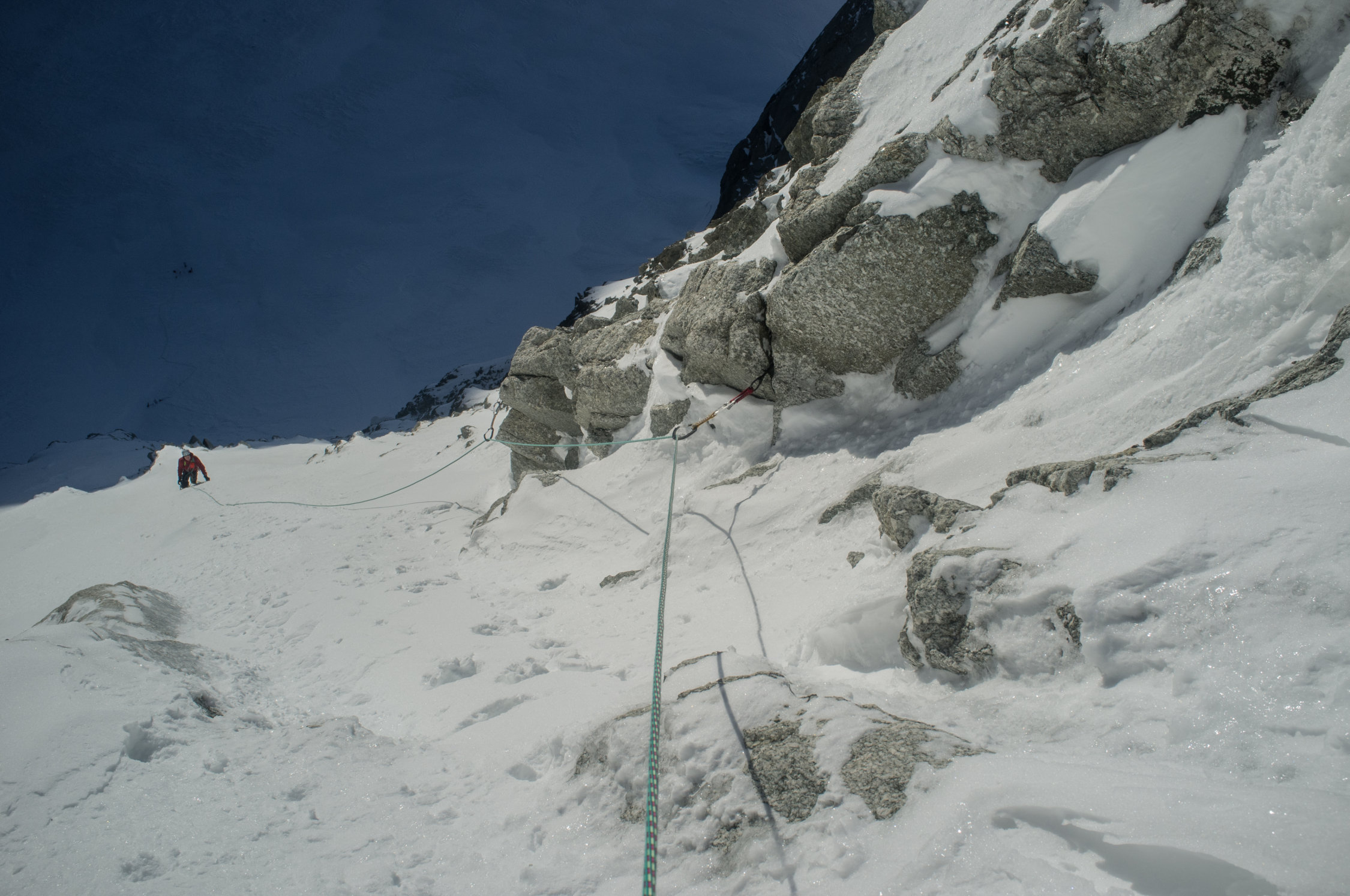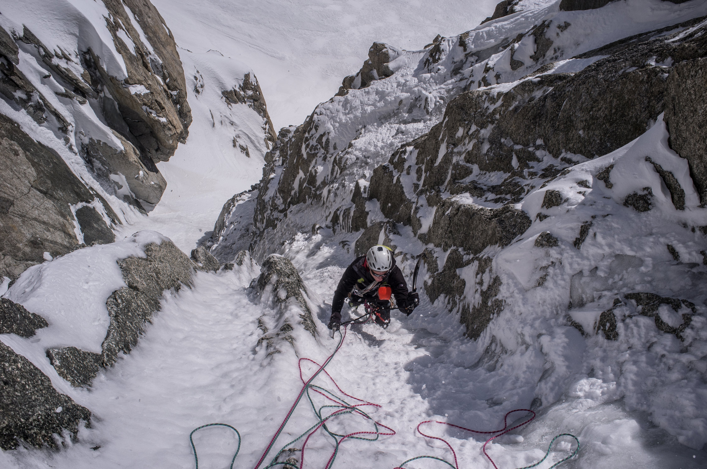 Am Samstag haben wir die 'M6 Solar' an den Pointes Lachenal geklettert, bei spektakulären Bedingungen: Die starken, warmen Niederschläge haben die Wände mit dickem Eis überzogen, was die Kletterei in der Schlüsselstelle stark vereinfacht hat. Allerdings werden diese 'Placages' bei den derzeitigen Temperaturen sehr schnell wieder abgetaut sein.
