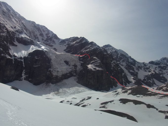 Besser ist vermutlich nach dem Eis, einige Meter hoch und dann queren oder der den steilen Schnee hoch (ca. 75°)