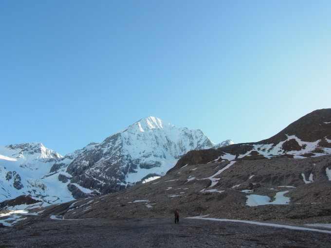 Biwaktipp: Eher unten auf dem Gletscher/Schnee Biwakieren wo der Abstieg von der Ostrínne vorbeikommt und Materialdepot. Aufbruch um 2:00 Uhr durch den Vorbau zum Königswandferner, ca. 3h rechnen von Biwak bis Einstieg in Wand und mit erstem Tageslicht einsteigen. Vorbau kann mit Stirnlampe gut geklettert werden, Zwei Reflektoren in der 4er Kletterei.
