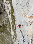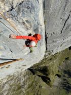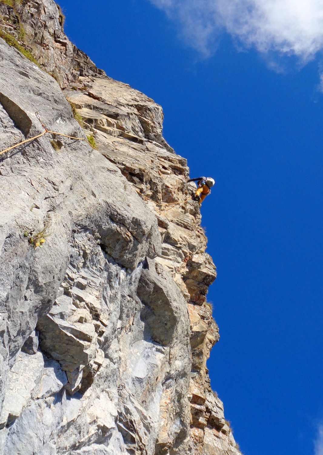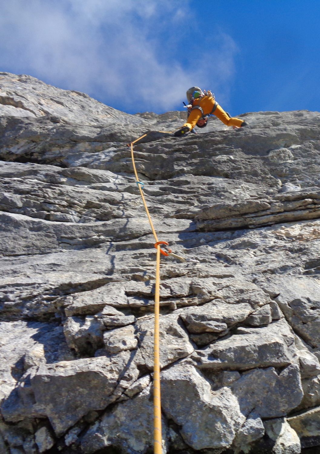 SL2: (35 m, 6a+): kommt einem härter vor, gleich ein Testpiece. Auf mindestens 15 m anhaltend schwer; sehr technisch am Anfang, vor allem vom ersten Bh weg (vor dem 2. Bh gibt es einen Schlitz für einen Cam im kleinen Dachl). Anfang zweite Hälfte dann ein Wulst, bei dem man ziemlich hart zukrallen muss (dort besser gesichert), dann leichter.