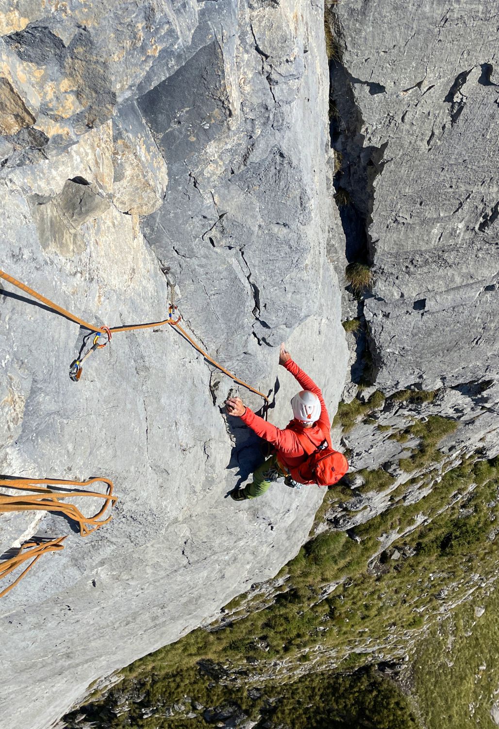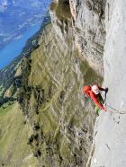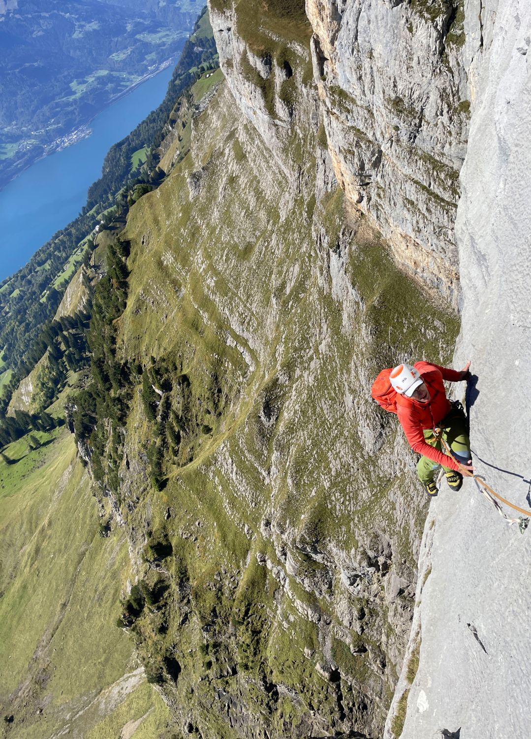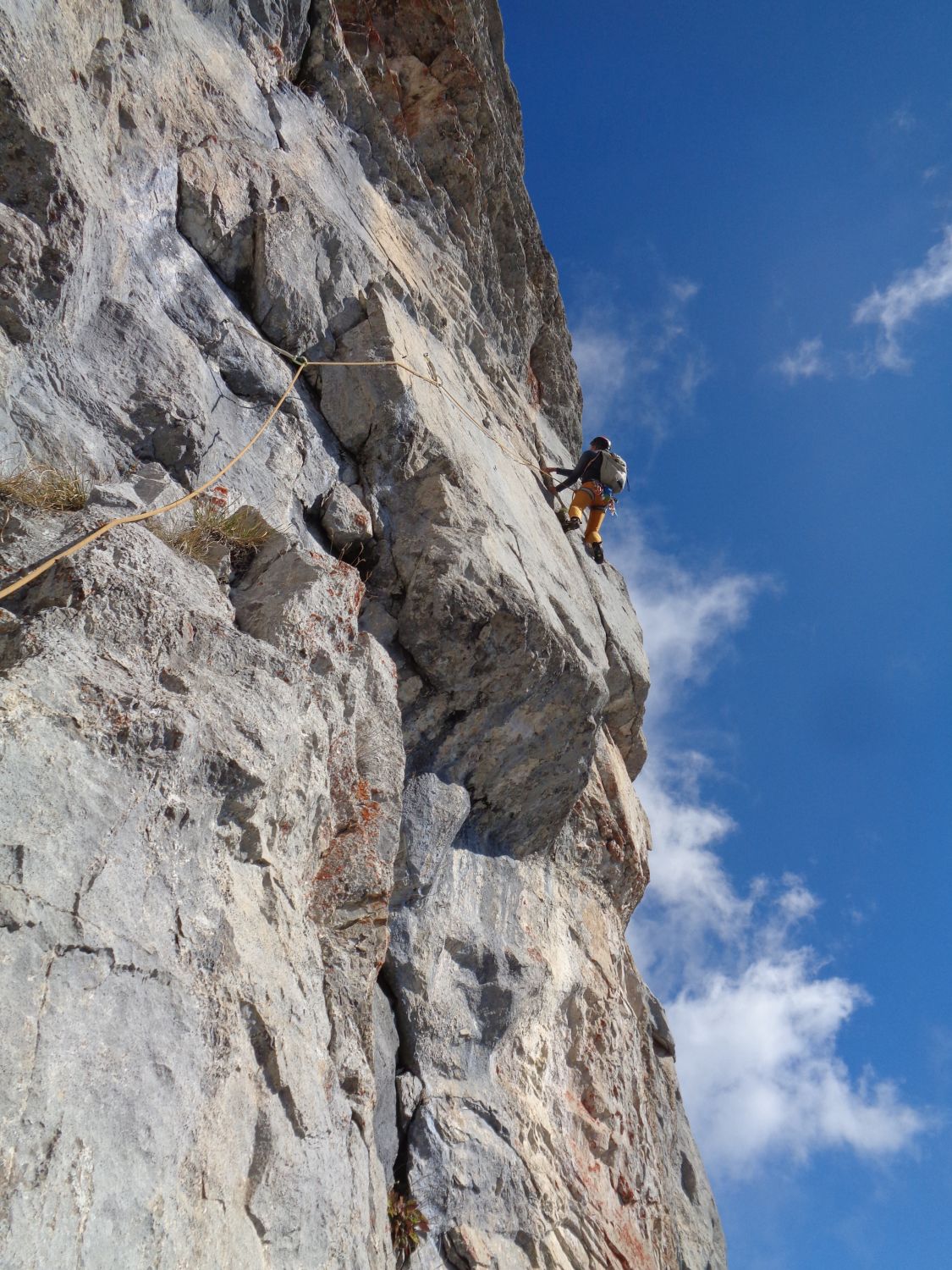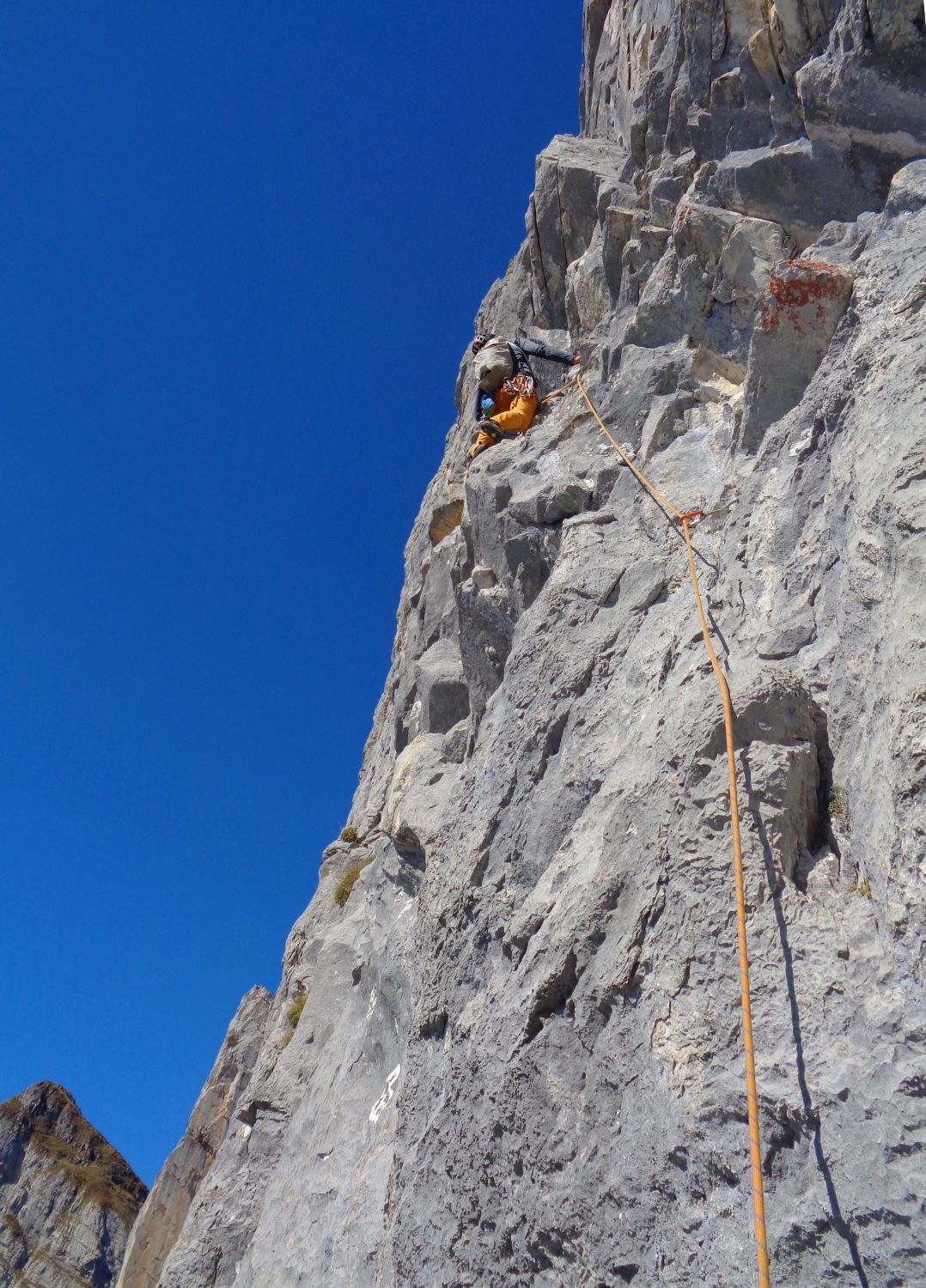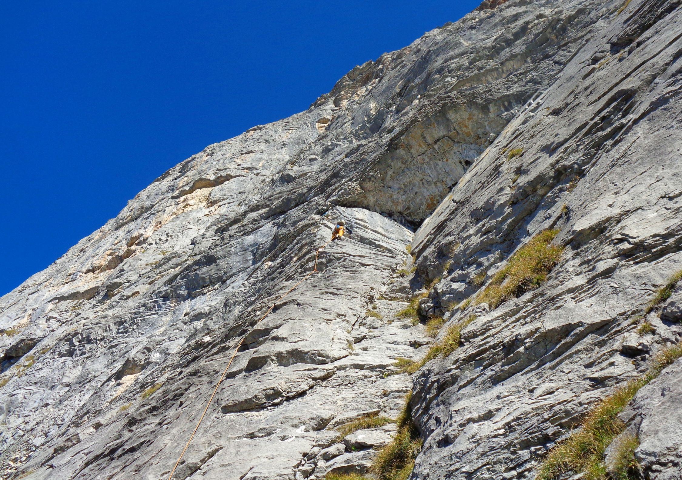 SL6 (35 m, 6b): Die schönste Länge der Tour, manche sagen eine der Besten in dem Grad in der Ostschweiz. Steilplatten, die nicht ganz leicht zu lesen sind, und daher als unterschiedlich schwer empfunden werden (man kann sich da leicht in eine Sackgasse manövrieren oder in perfektem Flow durchgleiten).