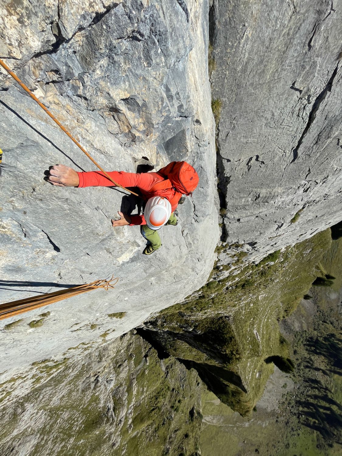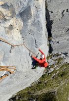 SL7 (30 m, 7a) Die Länge startet einfach zur großen Platte, ab da gehts zur Sache, anspruchsvolle Querung an Leisten (6a+) (früh mit dem linken Fuss hoch zur linken Hand), dann zum Riss. An diesem nicht hoch zum Wulst, sondern weiter nach R um die Kante queren (zwingend 6b) bis man R eine Rettungsschuppe erwischt (das Ohr). Dann schön rau nach oben zum ersten Bh der Crux (dort in Freikletterei nach oben hin zunehmend schwierig). Die 3 Bh der Schlüsselstelle haben ganz gute Abstände, für den Vorsteiger fast nur mit Trittschlinge zu erreichen, wenn man das technisch klettert.