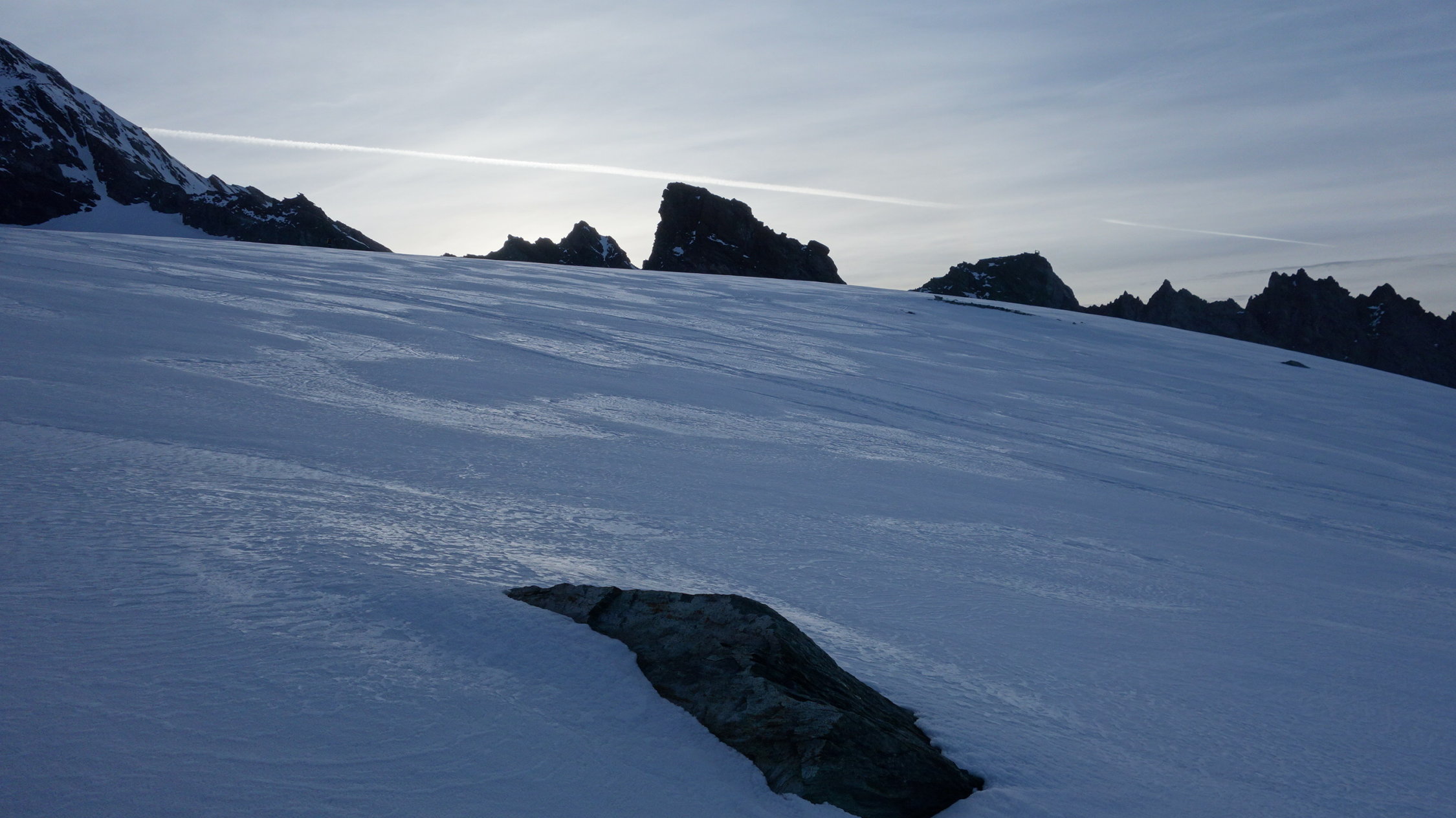 Querung nach der Stüdlhütte(unterhalb "Schere") kommen schon kurz die Felsen raus. Gletscher oben noch gut eingeschneit.